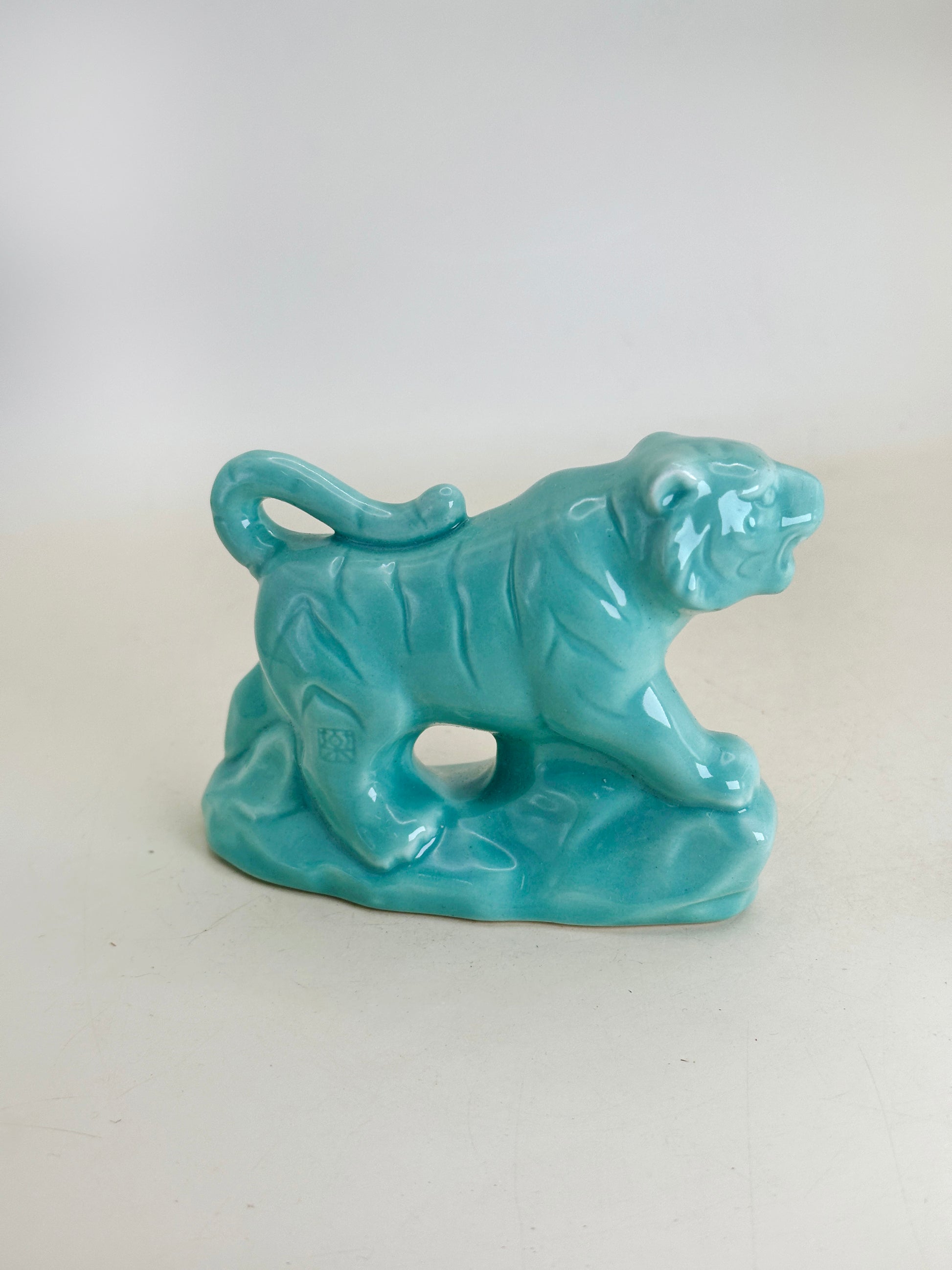 La figura está recubierta con un esmalte celadón luminoso, su tono azul verdoso suave se acumula suavemente en las líneas talladas de la musculatura y las rayas del tigre. Este esmalte, apreciado durante mucho tiempo en la cerámica japonesa por su calidad serena y similar al jade, realza la sensación de autoridad tranquila que transmite el tigre. La superficie lisa y vidriosa contrasta maravillosamente con los detalles esculpidos, desde la cara expresiva hasta la cola rizada.