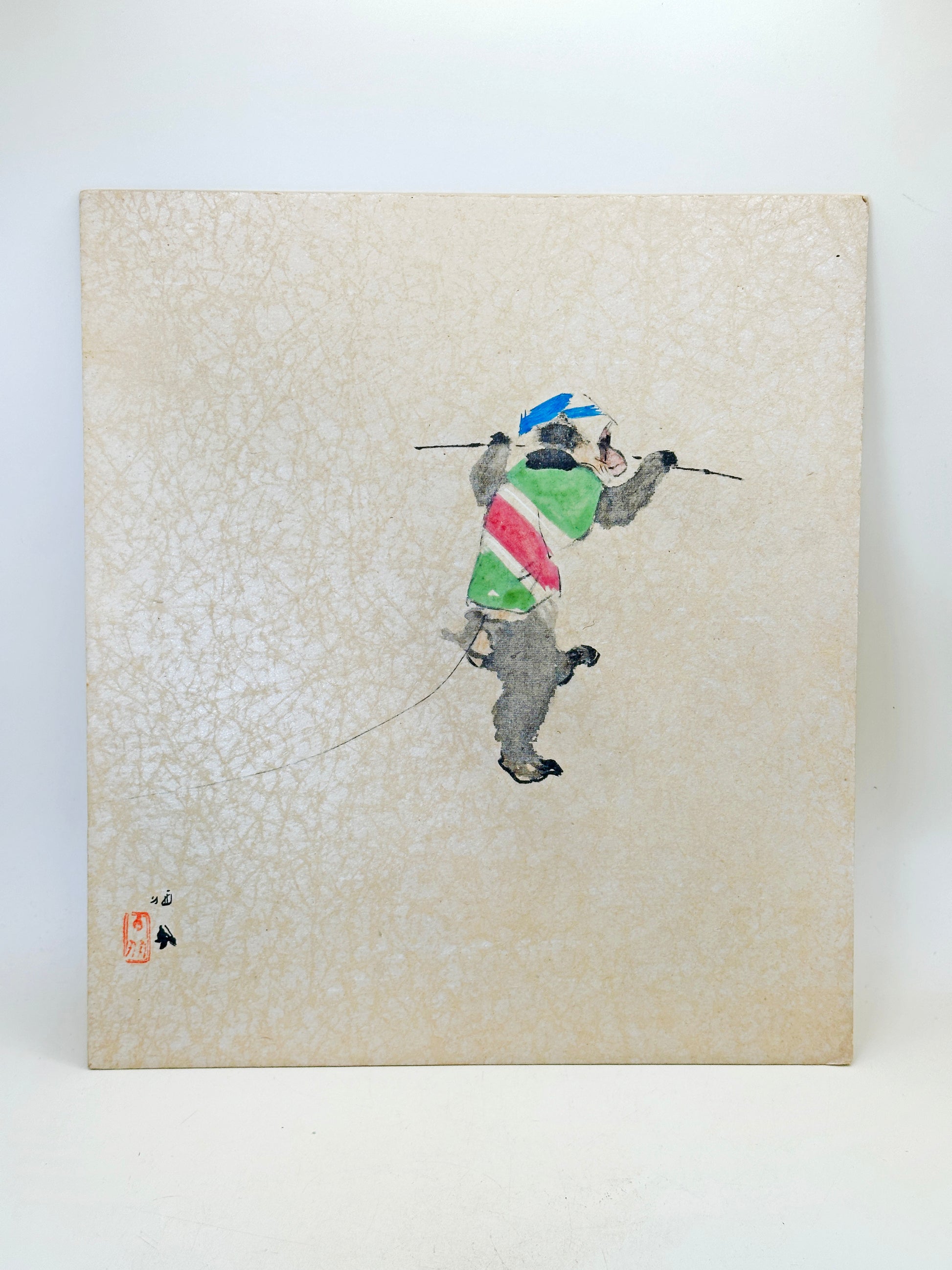 Realizada con una notable economía de pinceladas, la composición se centra en un pequeño mono artista capturado en pleno movimiento. El animal se equilibra erguido mientras sostiene una delgada vara sobre sus hombros, evocando los gestos vivaces de un artista entrenado. El mono lleva un chaleco de colores vivos, verde y rojo, con un tocado azul, detalles que resaltan vívidamente sobre el suave fondo texturizado del tablero shikishi. Una delgada cuerda se arrastra detrás de la figura, sugiriendo sutilmente al entrenador invisible y el entorno tradicional de la actuación.