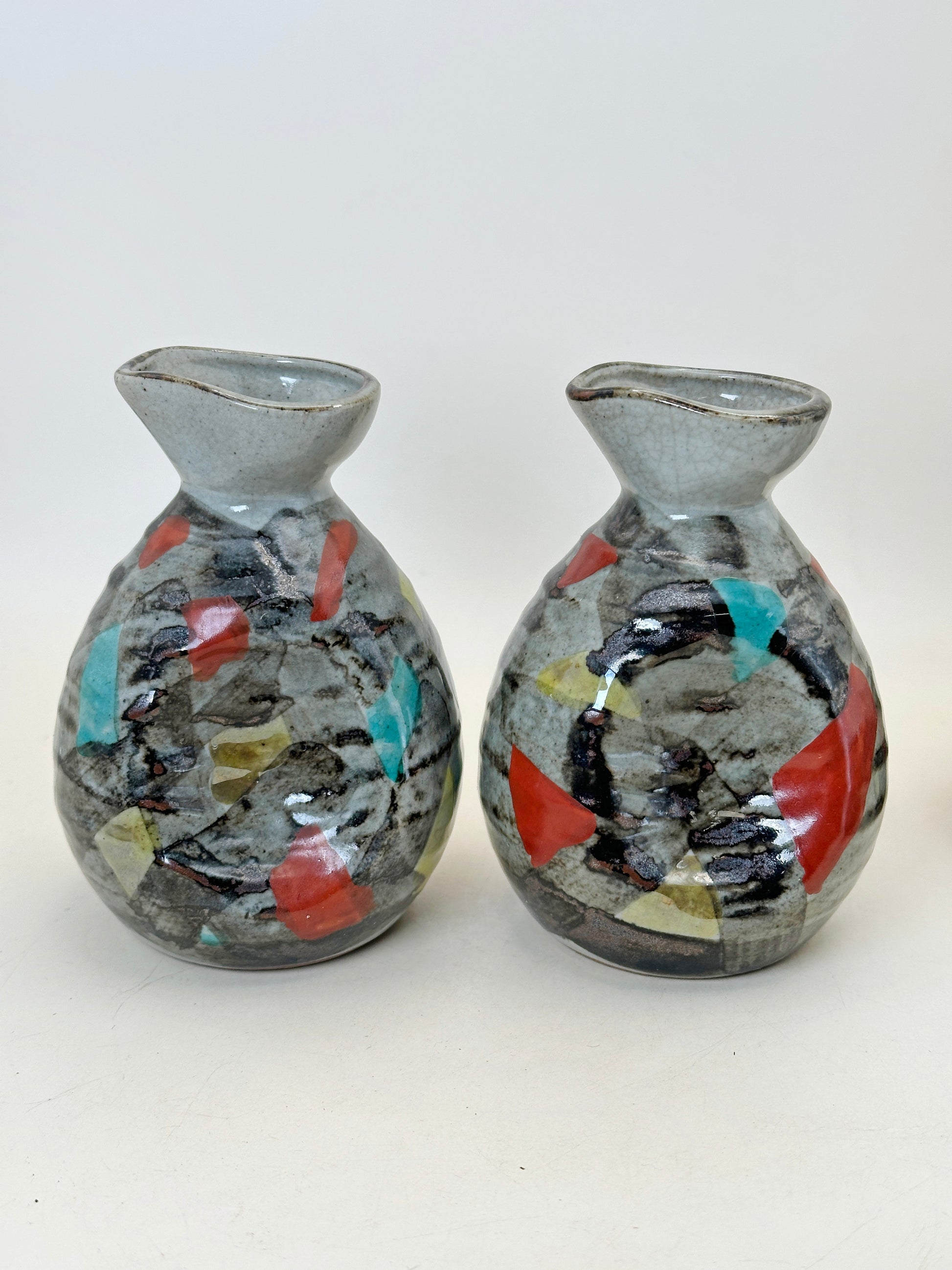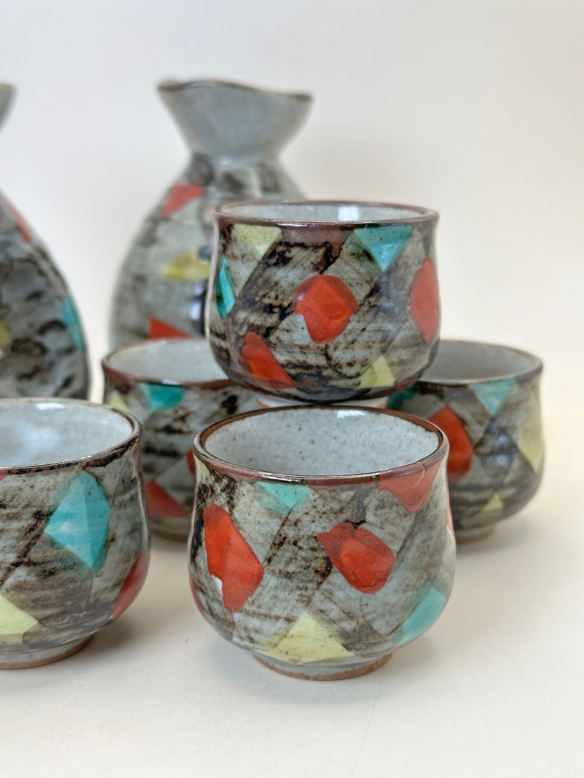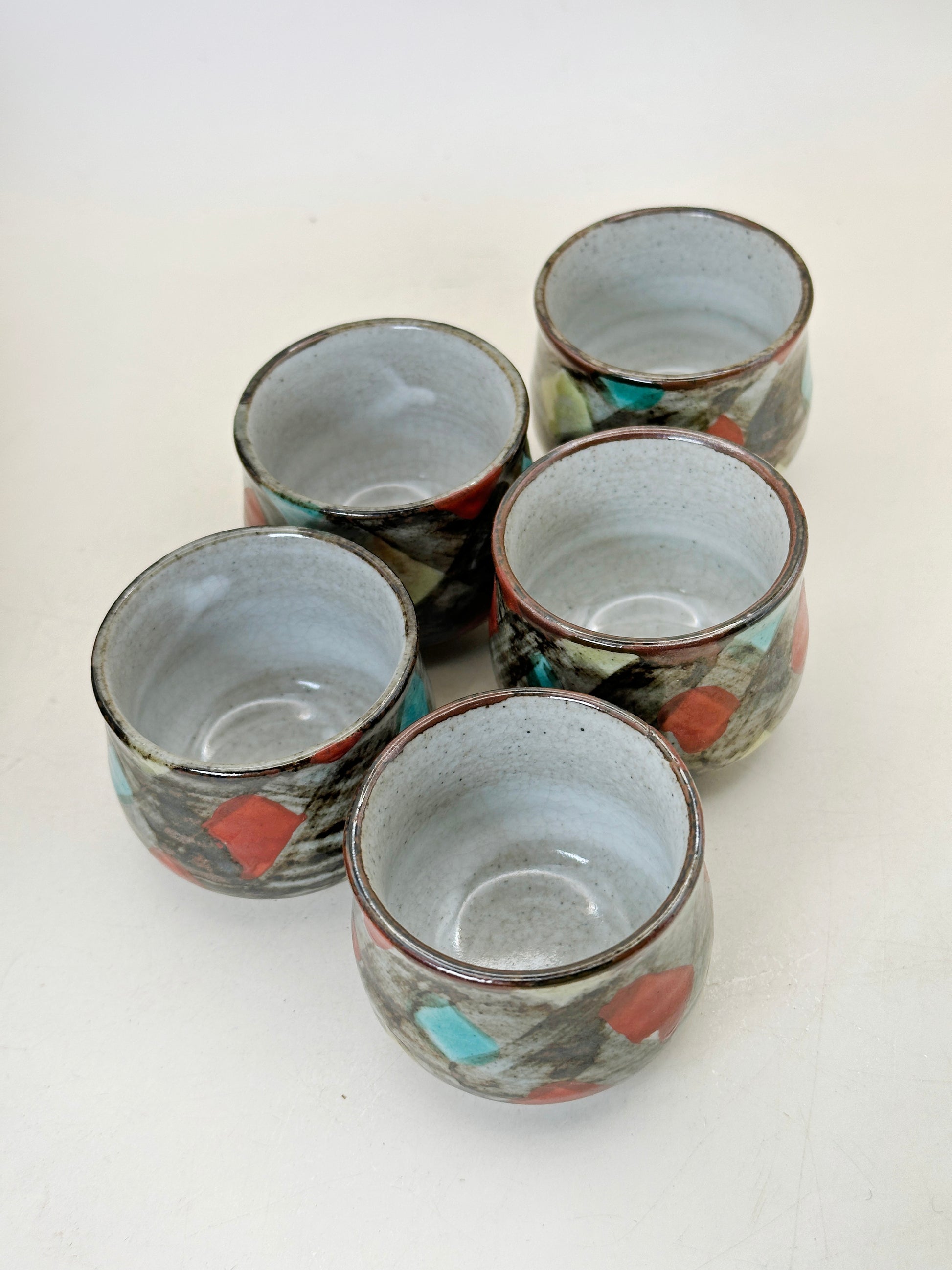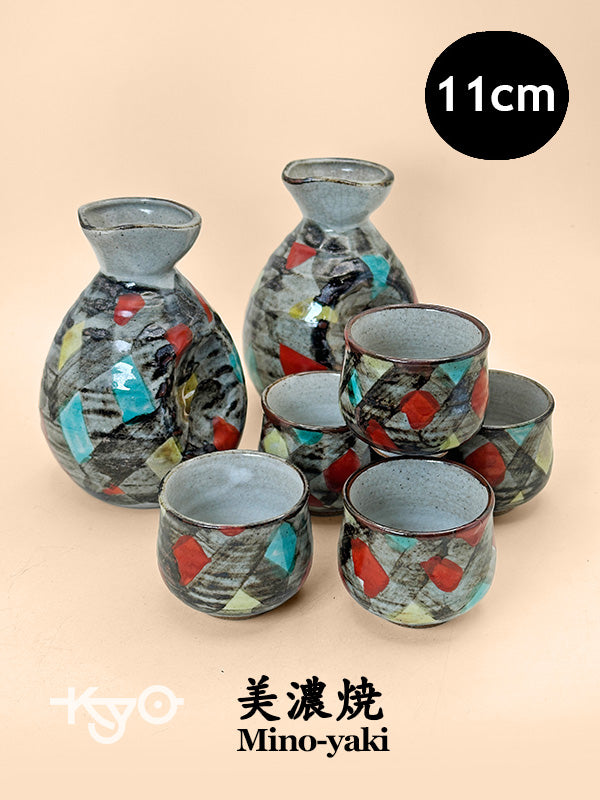 Las piezas presentan una forma suavemente redondeada con un esmalte natural que simula la piedra, resaltando el carácter terroso de la cerámica Mino. En toda la superficie, pinceladas expresivas en tonos oscuros crean un fondo dinámico, superpuesto con alegres acentos geométricos en rojo, turquesa y amarillo pálido. Estas formas coloridas le dan al juego un toque moderno y vivaz, manteniendo al mismo tiempo la calidez rústica típica de la loza Mino.