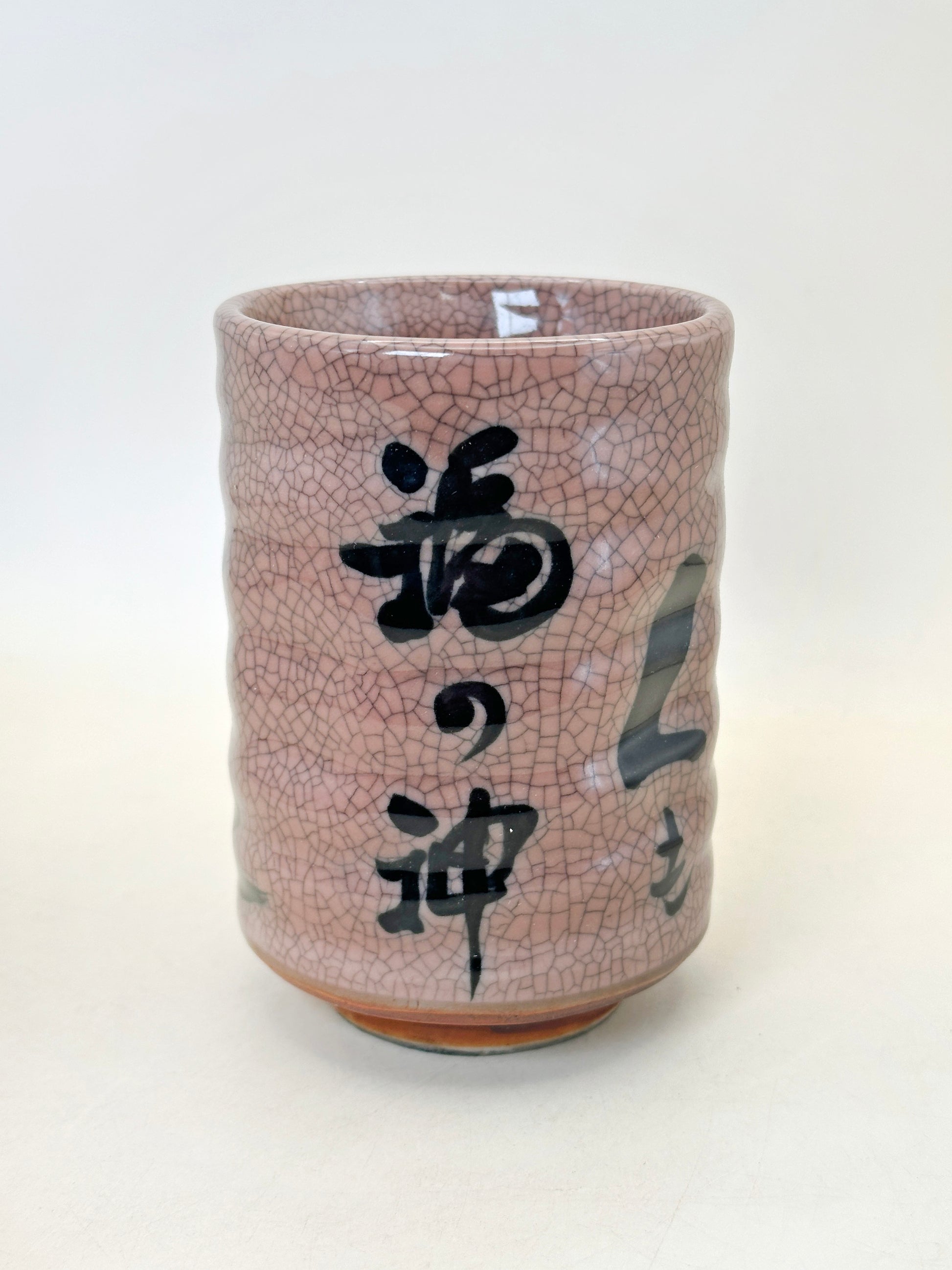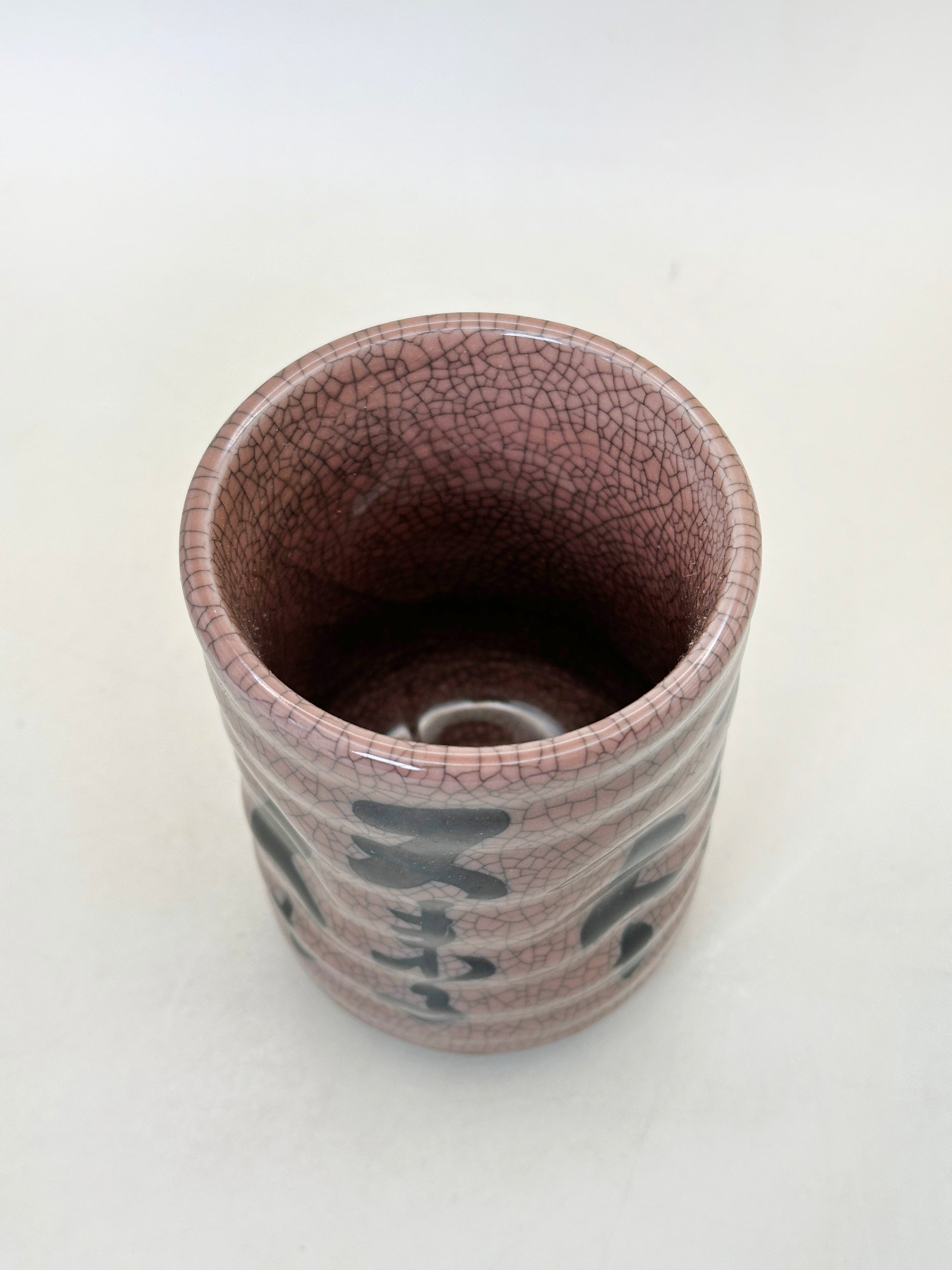 Artículo vintage, nunca usado. Esta taza de té yunomi 湯呑 presenta un hermoso esmalte craquelado de tinta 墨貫入, caracterizado por su intrincada red de finas grietas que se extienden por la suave superficie rosácea. El patrón craquelado, sutilmente oscurecido como tinta, da profundidad a la pieza y una sensación de antigüedad tranquila, encarnando la apreciación wabi-sabi de la imperfección natural.