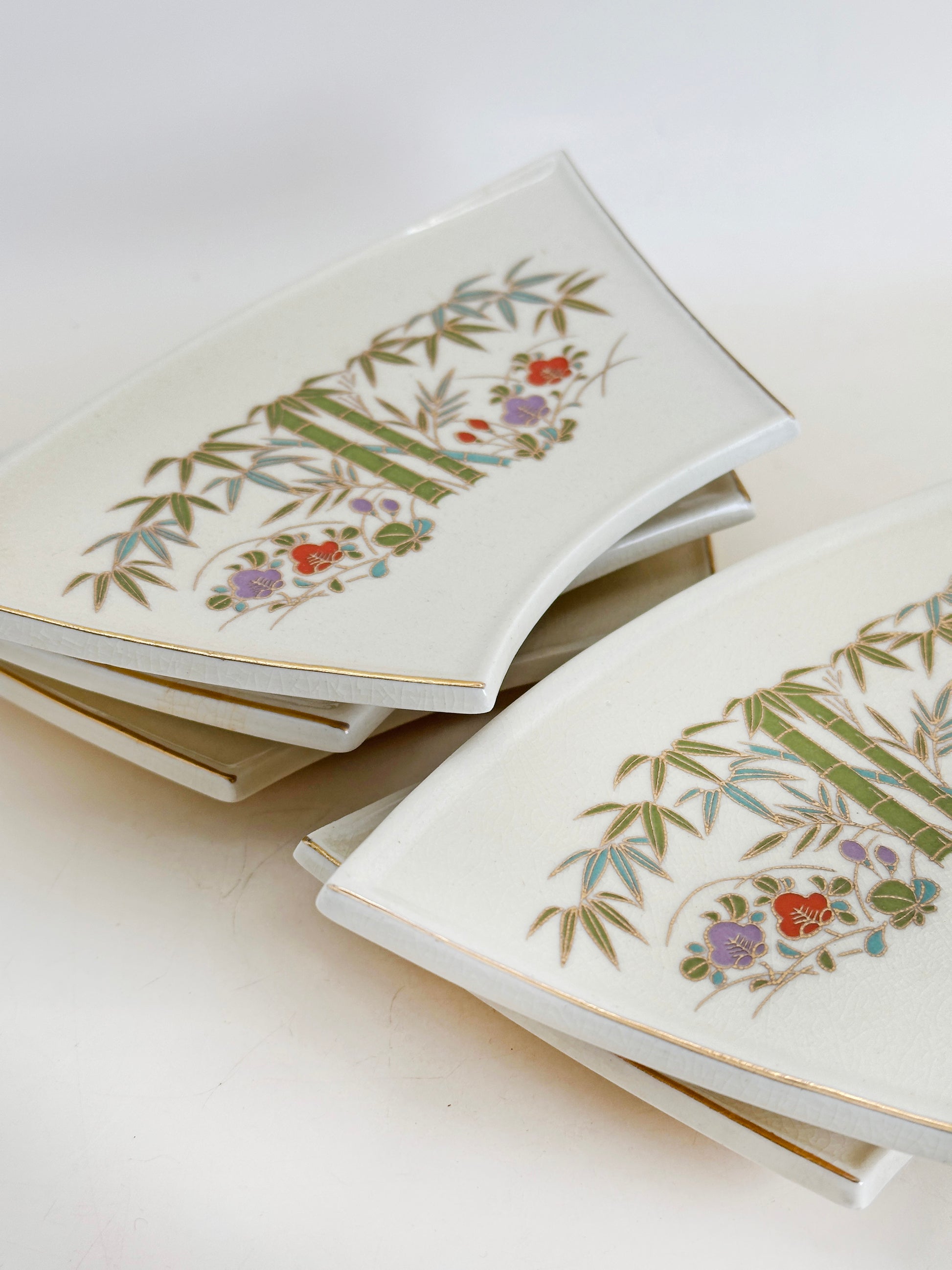 Este elegante juego de cinco platos de cerámica encarna la refinada belleza de la artesanía de Kioto, moldeado con una suave curva que le confiere tanto suavidad visual como practicidad. La superficie de cada plato está adornada con una composición delicadamente pintada a mano de bambú y flores de temporada, resaltada con finos contornos dorados que captan la luz con una sofisticación sutil. El diseño refleja los ideales estéticos de Ninsei utsushi (仁清写し), un estilo inspirado en el célebre alfarero del período Edo Nonomura Ninsei, conocido por su uso armonioso del color, sus formas gráciles y su poética sensibilidad decorativa.