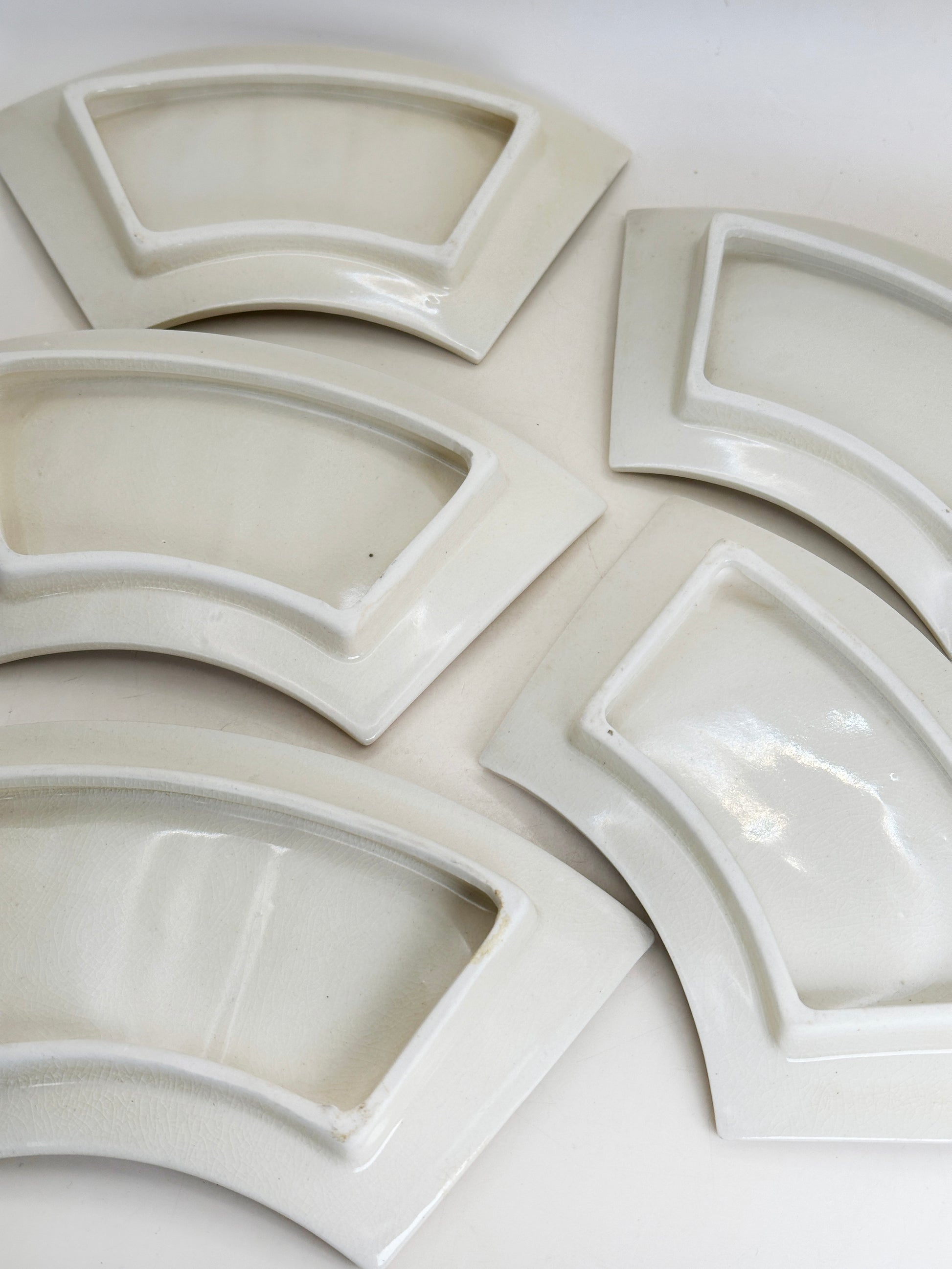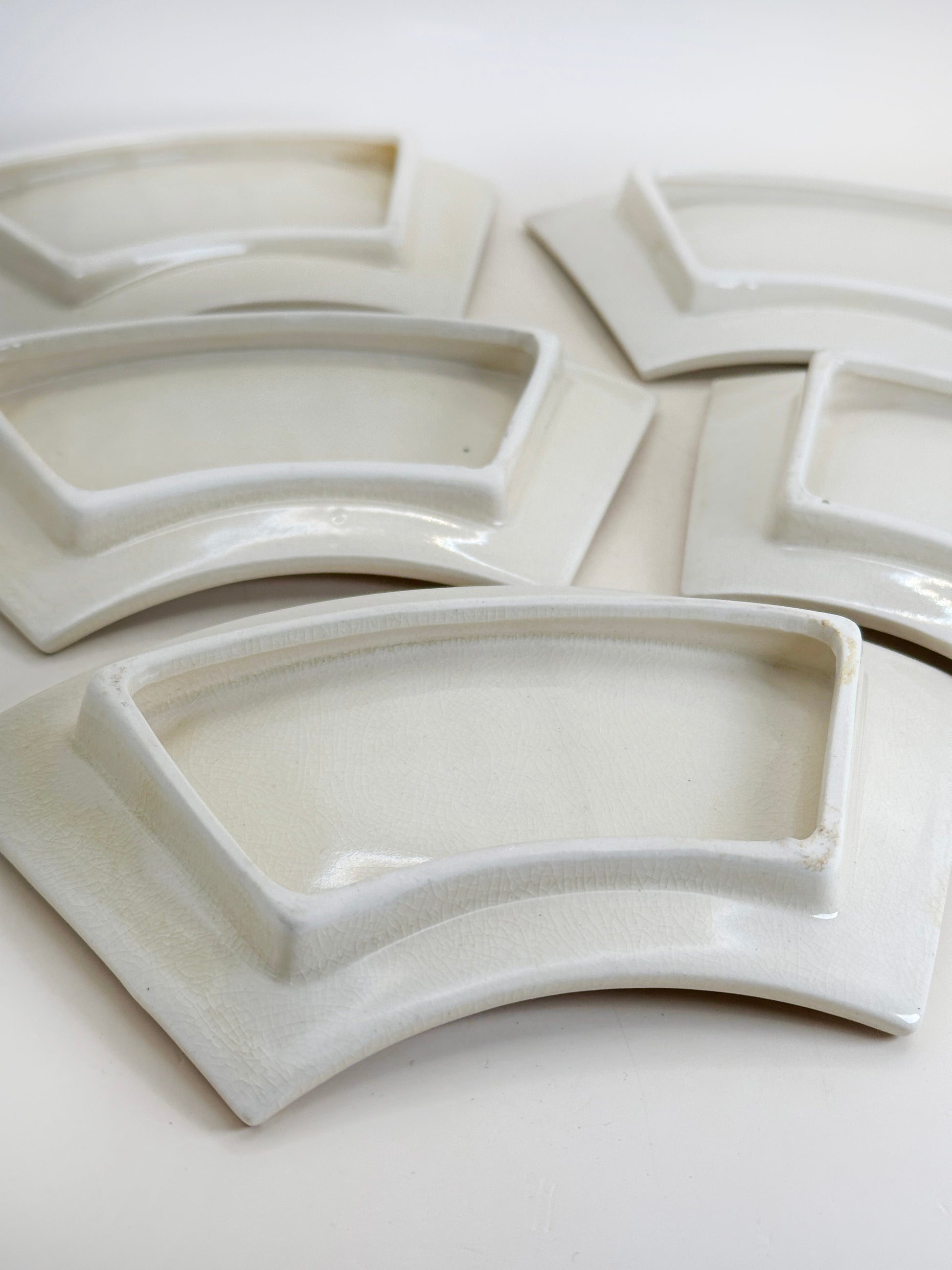 El esmalte es de un blanco lechoso suave con un sutil craquelado (貫入), una característica apreciada en la cerámica japonesa por la sensación de profundidad y belleza vivida que aporta. A lo largo de los bordes, una fina línea dorada acentúa la forma suavemente ondulada de los platos, realzando su presencia ya sea utilizados para servir o exhibidos como objetos decorativos.