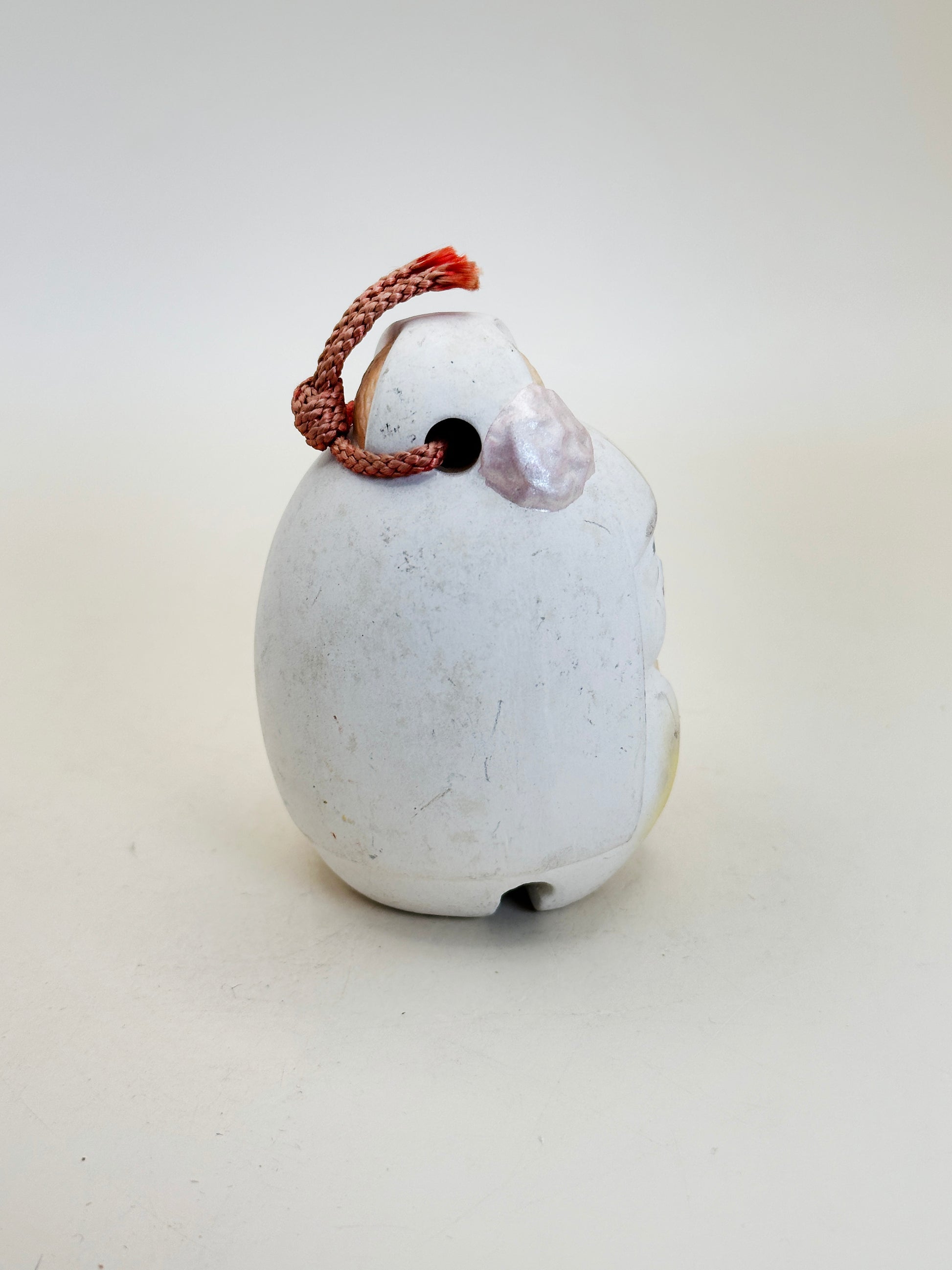 Cette charmante clochette en argile dorei de Hakata Ningyō (博多人形) présente la délicate figure d'une jeune femme en tenue traditionnelle, capturant grâce et élégance. Son visage rond et aux contours doux est peint d'une expression calme et sereine, rehaussée par des joues rosées et des lèvres d'un rose vif.