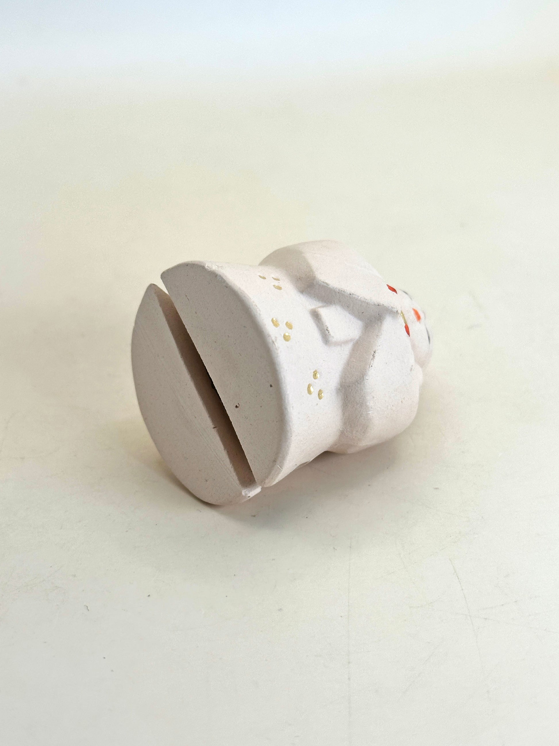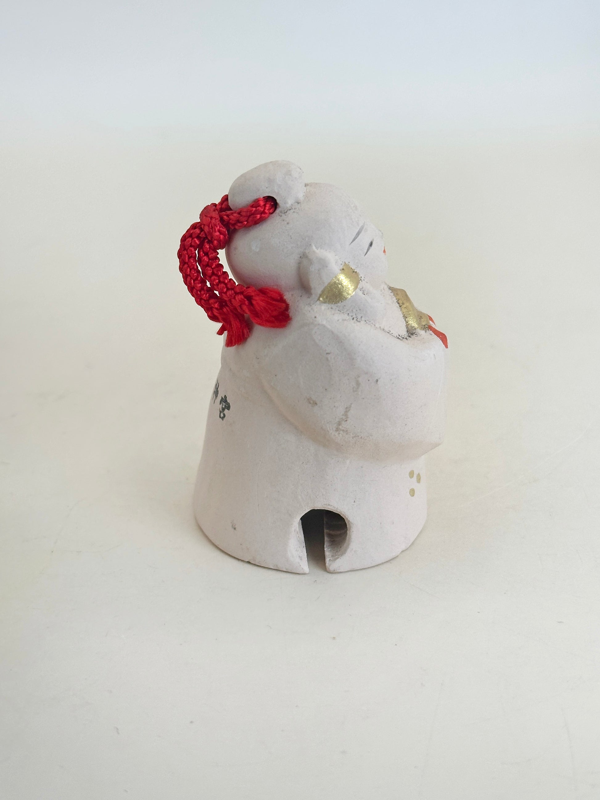 This delightful dorei (clay bell) represents a Kamiyo-suzu (神代鈴)—a sacred bell rooted in Japan’s mythological age (kamiyo, or "age of the gods"). With its serene expression, delicate hand-painted details, and the gold-accented bell clasped between its hands, this figure radiates a sense of peace, reverence, and divine grace.