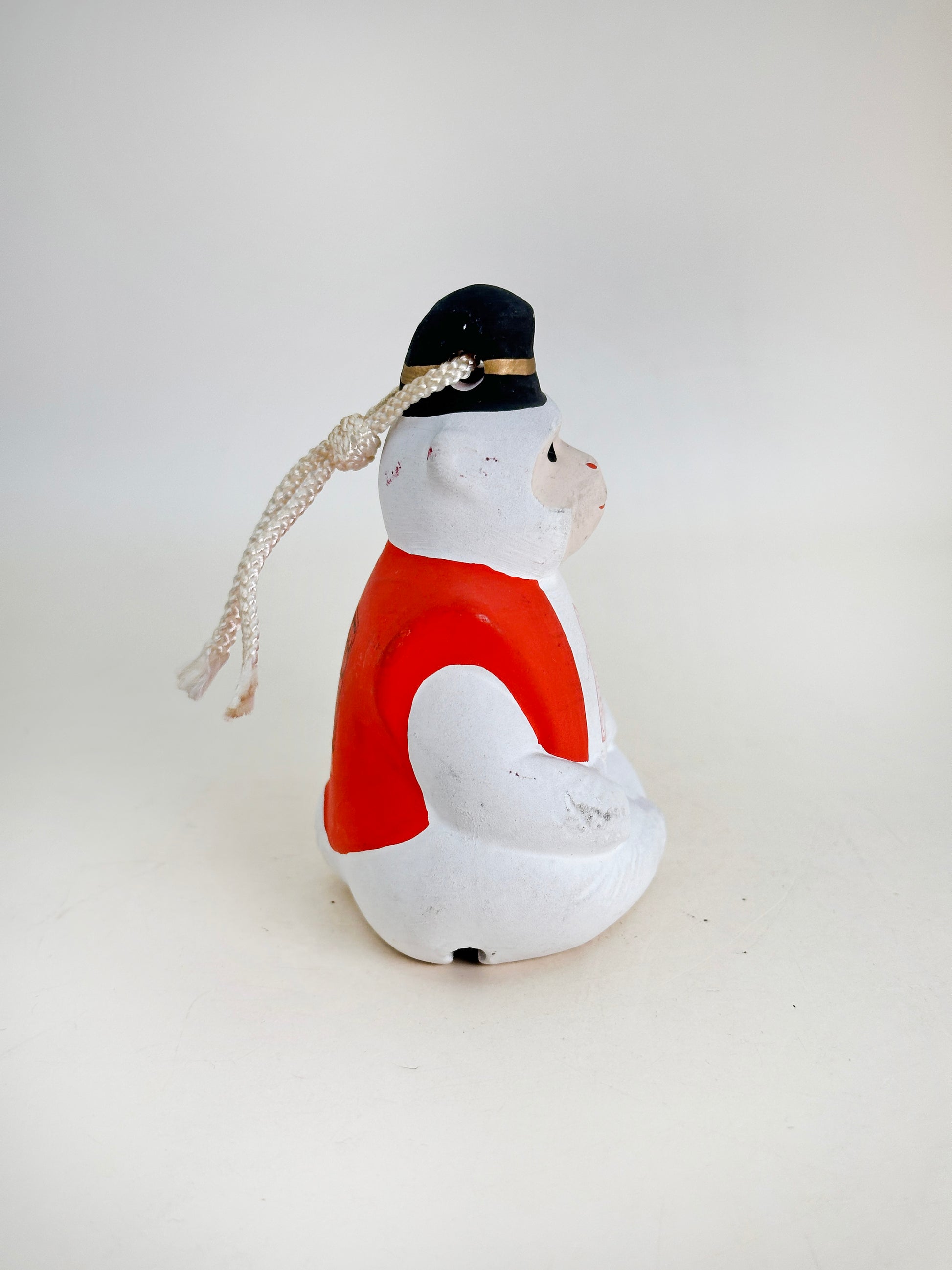 The figure depicts a serene and noble-looking monkey dressed in ceremonial attire, with a red vest and a black court hat accented with gold. The monkey is sitting in a lotus-like pose, embodying composure and wisdom. On its chest is a crest motif, and the back features a red stamp reading “西宮神社” (Nishinomiya Jinja), affirming its origin. A white cord loop allows the bell to be hung, often as a talisman for good fortune.