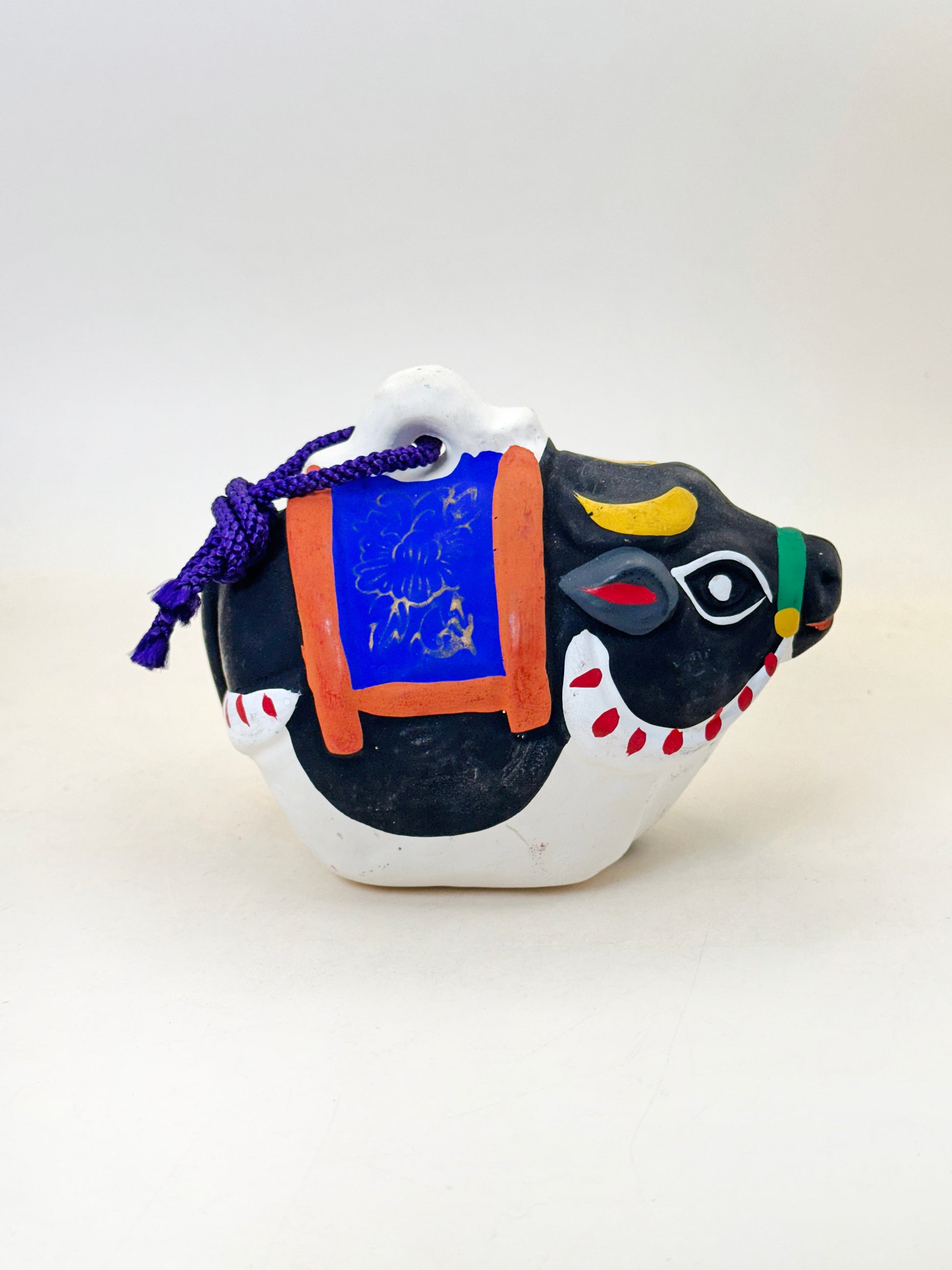 This dorei clay bell represents Tajima-gyū 但馬牛, the renowned breed of cattle native to Hyōgo Prefecture, famous as the source of the world-celebrated Kobe beef. Rendered in a stylized folk-art form, the cow is depicted with a compact, rounded body and expressive features, combining playful simplicity with regional identity.