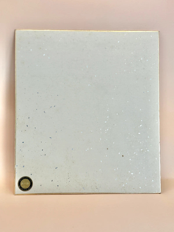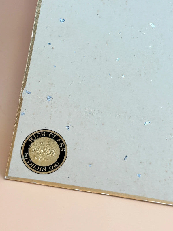 Une carte d'art shikishi vintage présente un collage réalisé à partir de luxueux Nishijin-ori (西陣織), un tissu produit dans le quartier de Nishijin à Kyoto, dont l'histoire remonte à plus de 1 200 ans. Ce tissu est réputé pour ses techniques de tissage complexes, ses couleurs vives et l'utilisation de matières luxueuses comme la soie et les fils d'or ou d'argent.