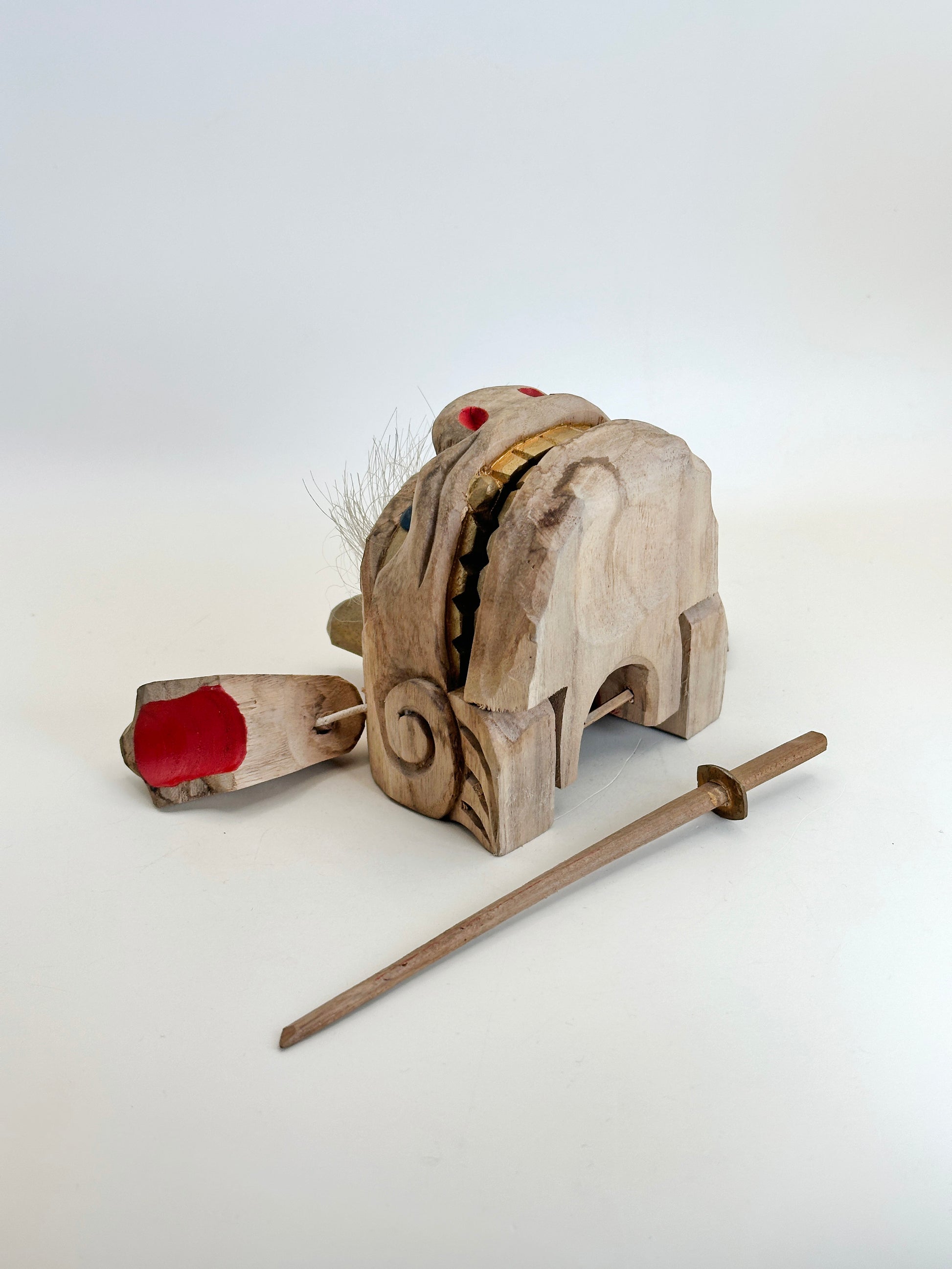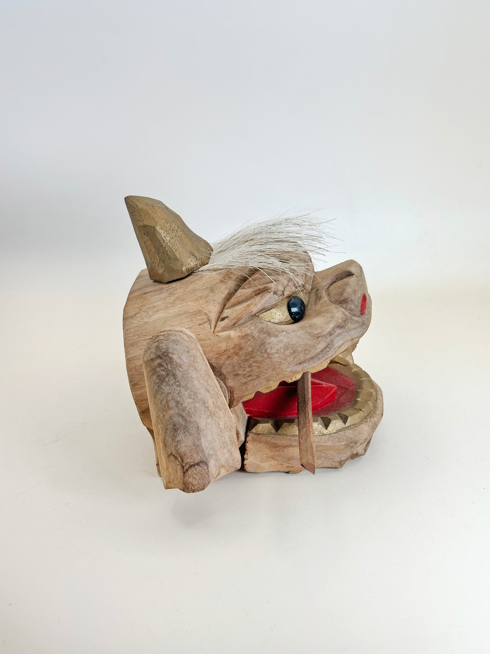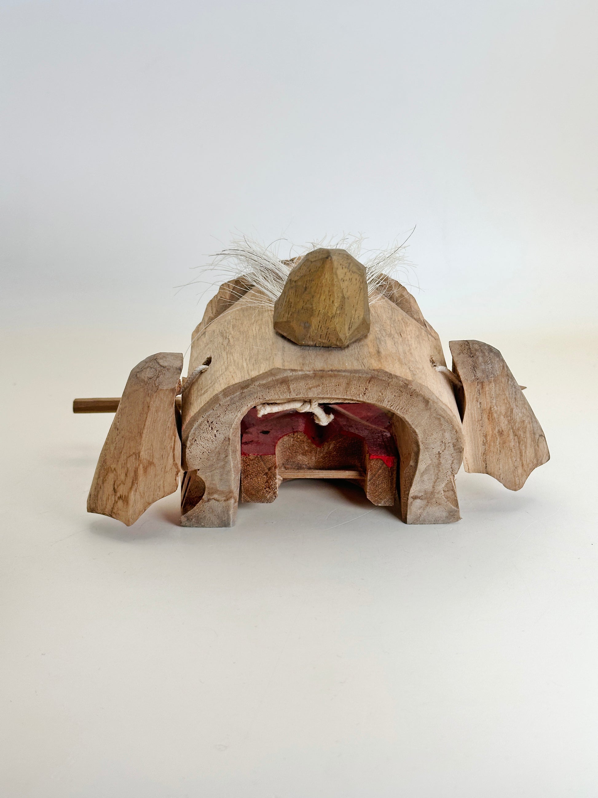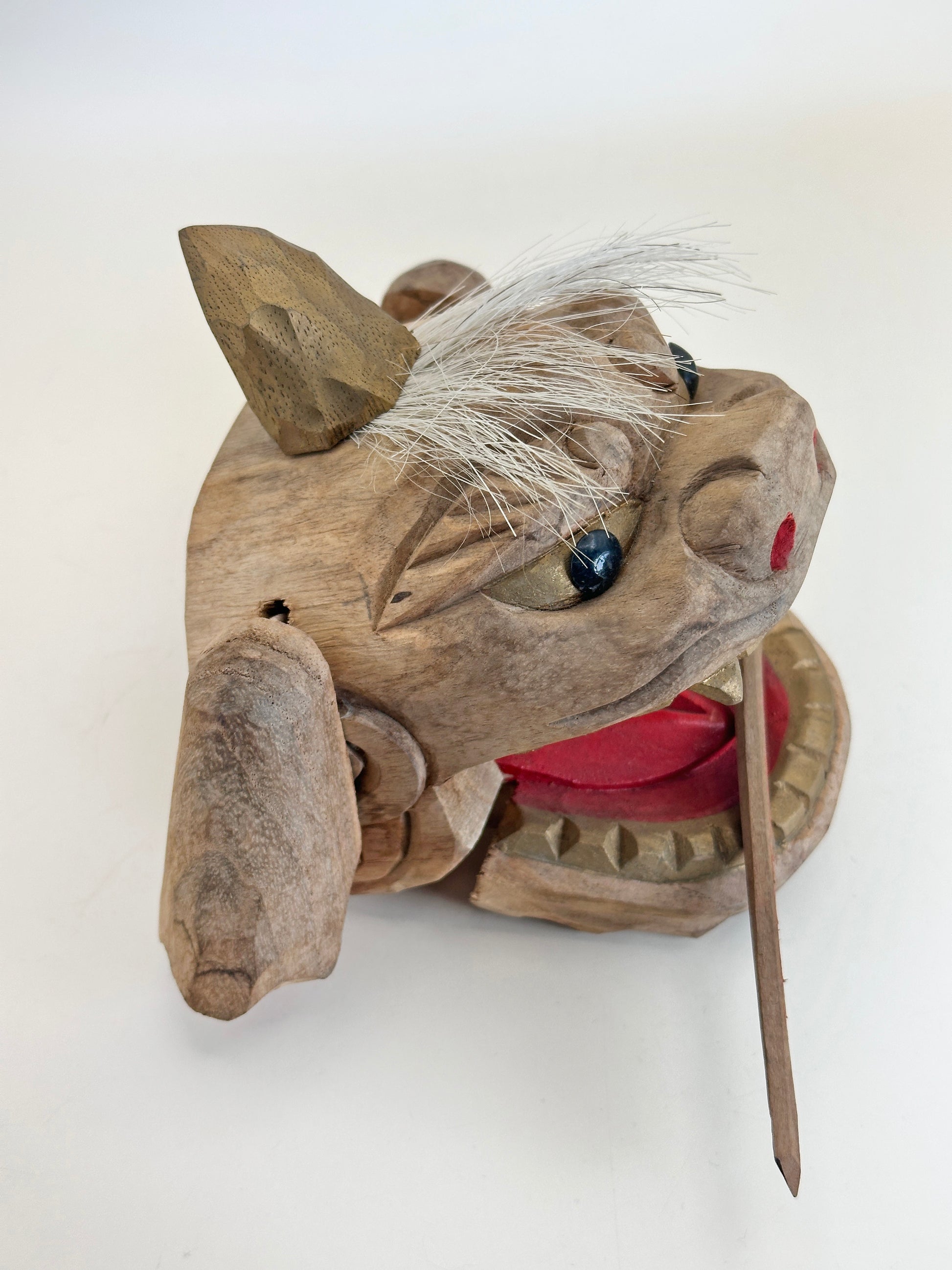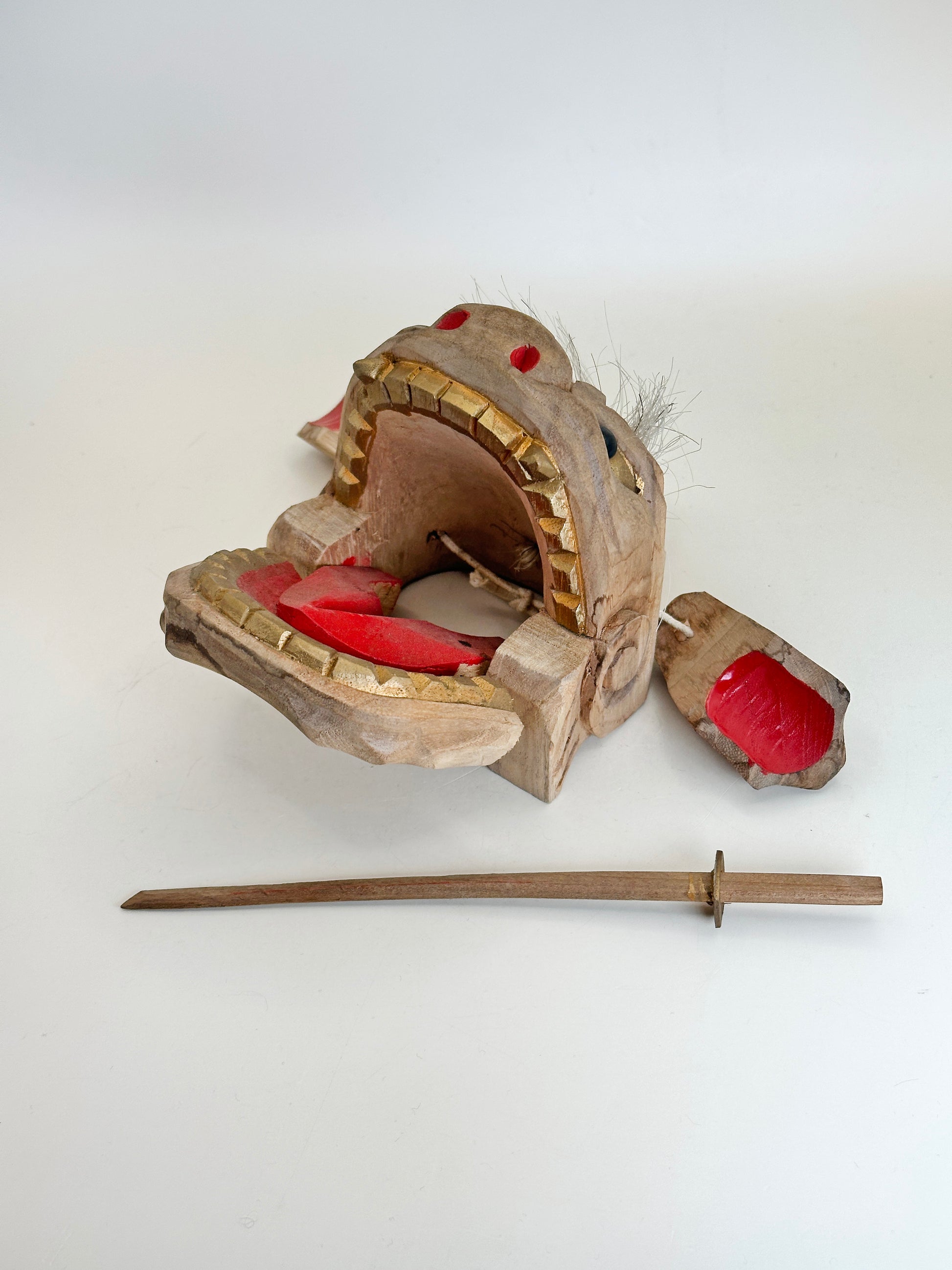 Carved from wood and accented with expressive features — bulging blue eyes, golden teeth, and a vivid red mouth — this lion head embodies both protection and festivity. The humorous twist in this version is the small katana (sword) clutched in its jaws, giving the piece a playful and whimsical character, while still maintaining its symbolic weight. The coarse white mane and exaggerated features enhance its hand-crafted charm, blending intensity with folk creativity.