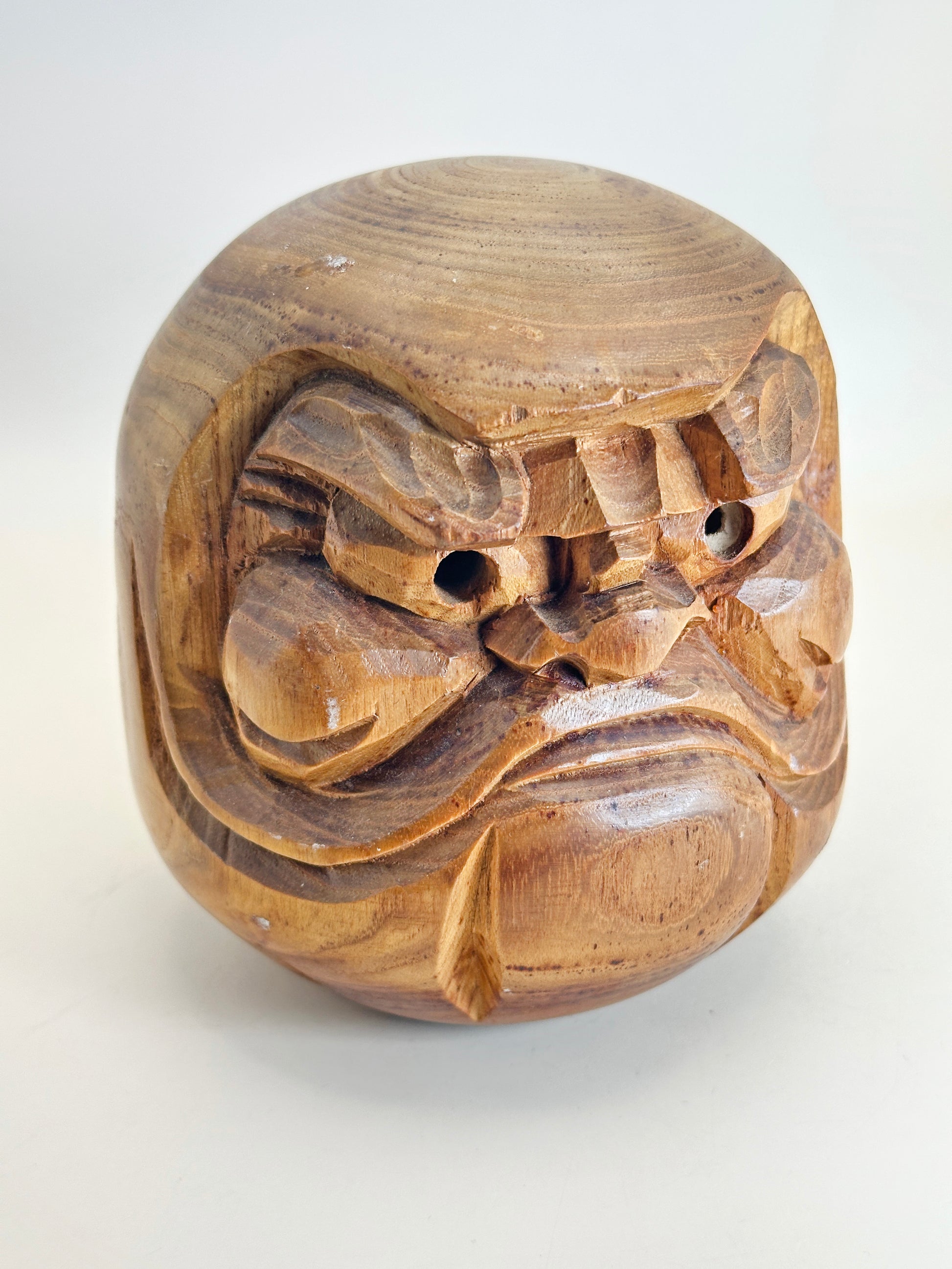 This particular Daruma has a strikingly expressive face with exaggerated eyebrows and mustache, carefully chiseled to convey strength and resilience. The wood grain and natural finish add warmth and texture, enhancing its folk charm. The hollowed eyes are traditional, typically meant to be filled in by the owner upon setting and fulfilling a personal goal.