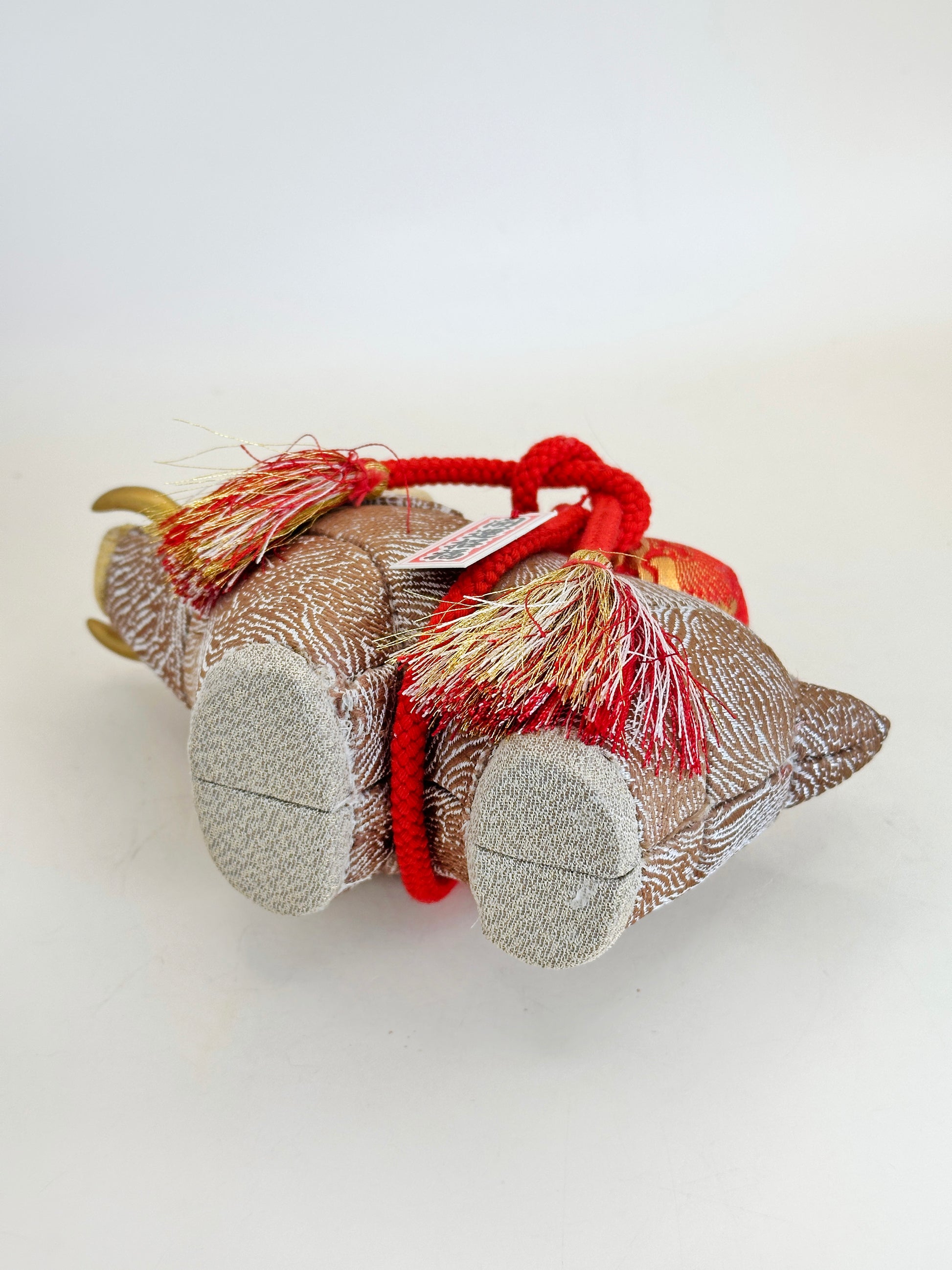 This charming handcrafted Kimekomi Ningyō features a boar (inoshishi) motif, richly adorned with traditional Japanese textiles and meticulous detailing.