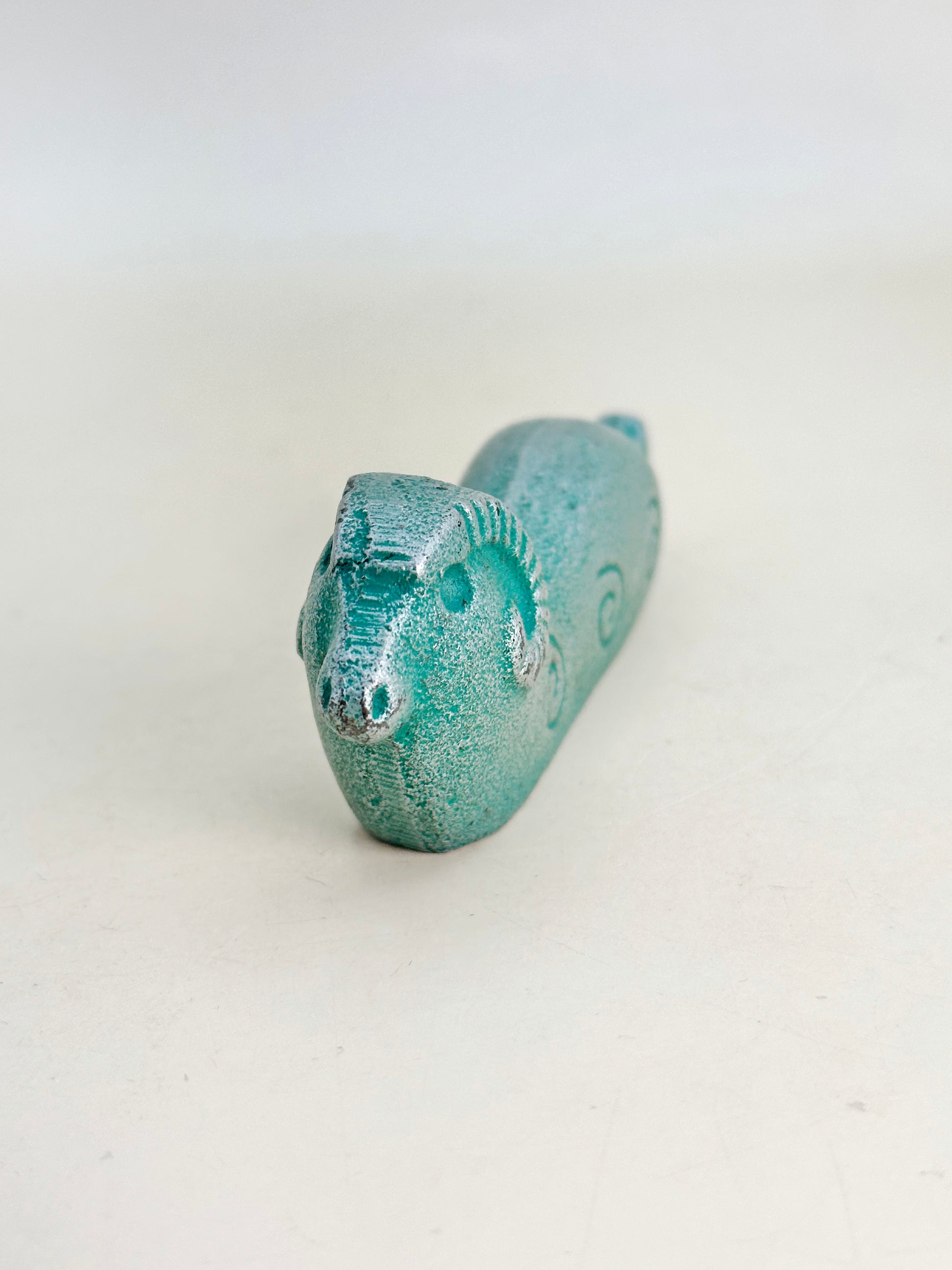 This vintage cast-iron sheep paperweight is a delightful example of Japanese craftsmanship, made by 宇田屋 (Udaya). Rendered in a calm turquoise-green patina, the sheep rests in a relaxed pose, its softly rounded body decorated with subtle spiral motifs that suggest wool and gentle movement. The curled horns and simplified facial features give it a warm, almost playful character, balancing weight and whimsy beautifully.