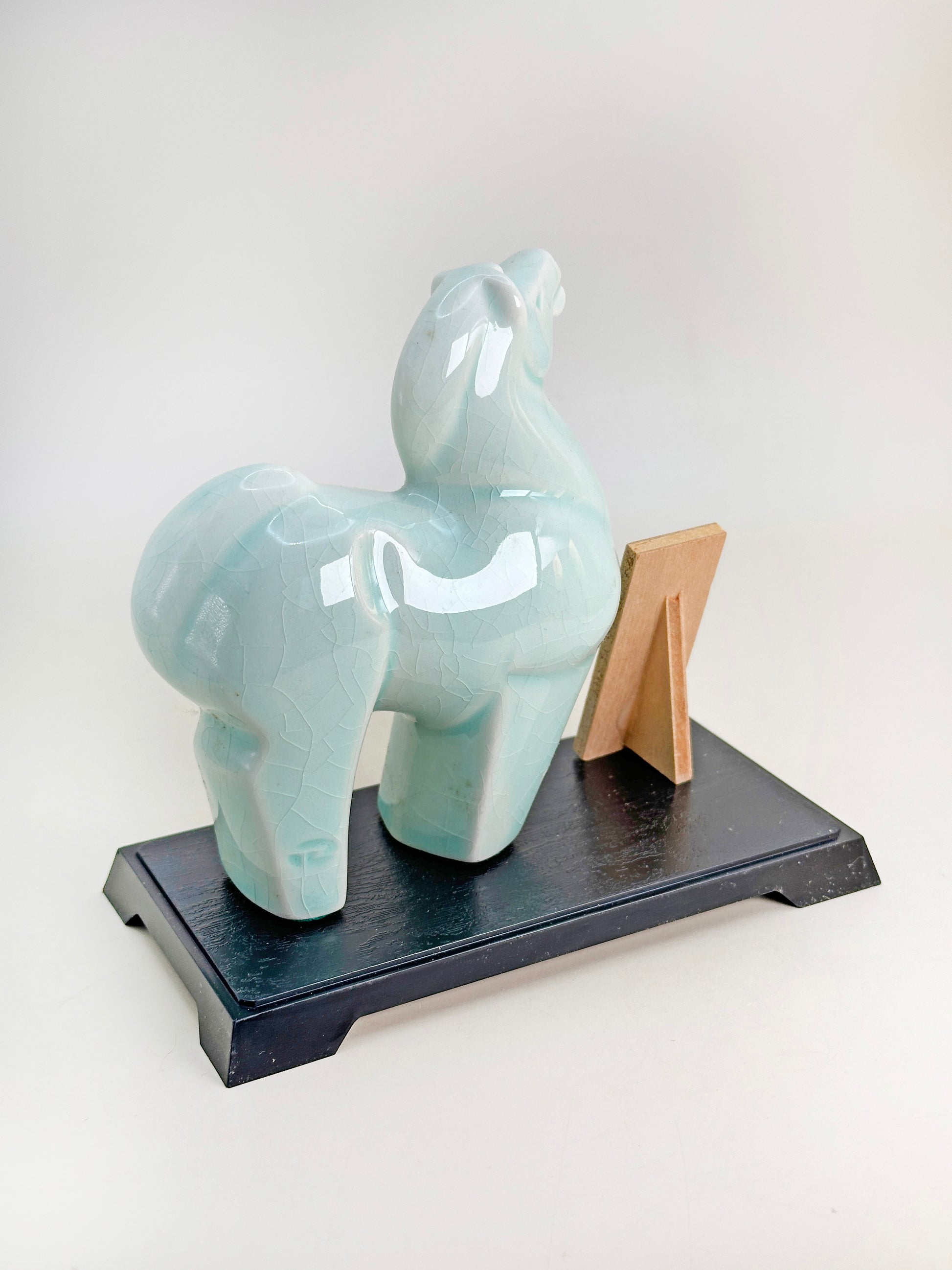 embodies refined craftsmanship and auspicious symbolism in a beautifully understated form. Rendered in a serene celadon glaze, the horse stands with a dignified posture, its gently arched neck and softly rounded contours expressing quiet strength and grace. The pale blue-green glaze reveals a delicate crackle (貫入) pattern across the surface, enhancing the depth and texture of the piece while evoking the timeless beauty of classical ceramics.
