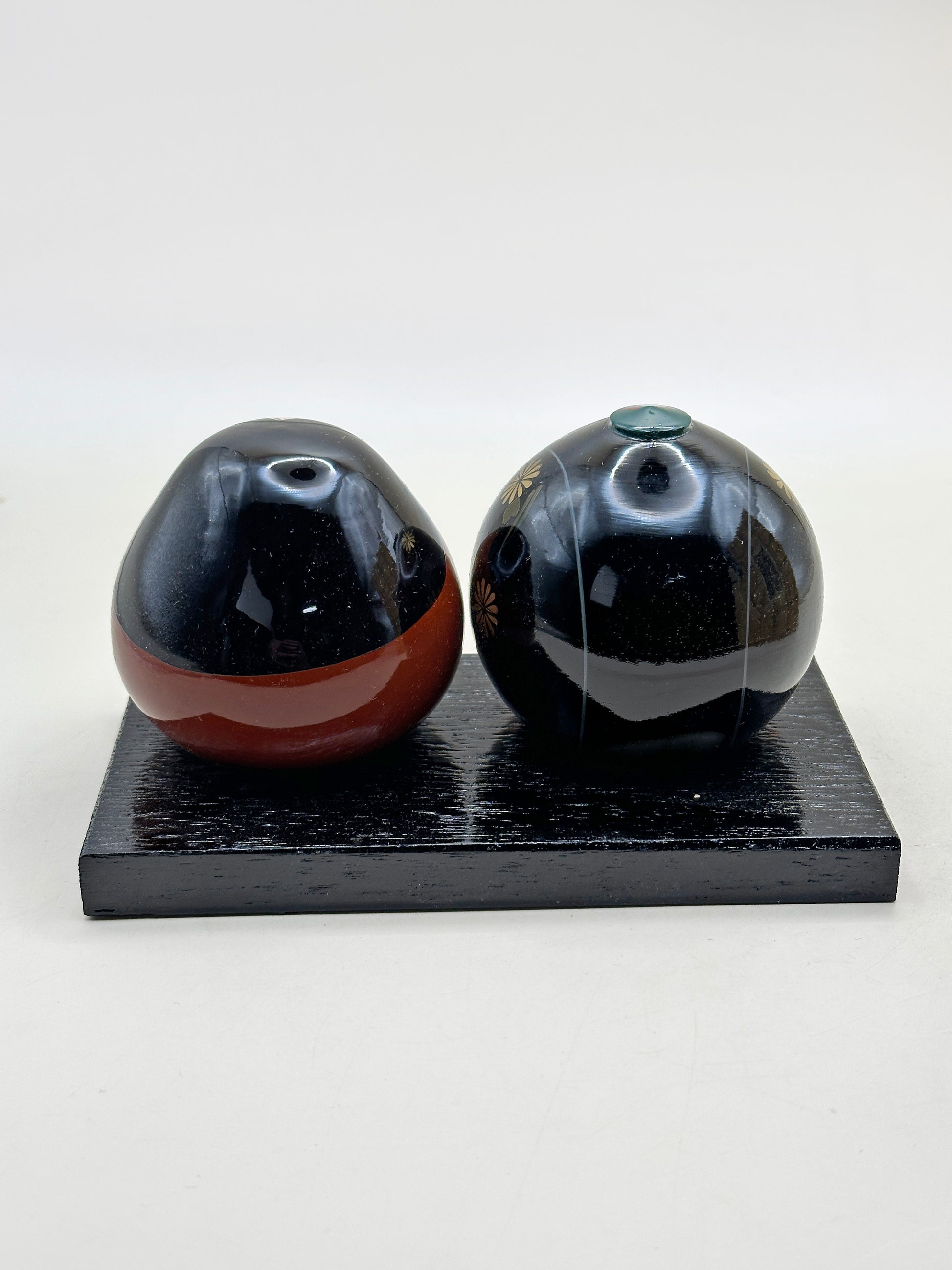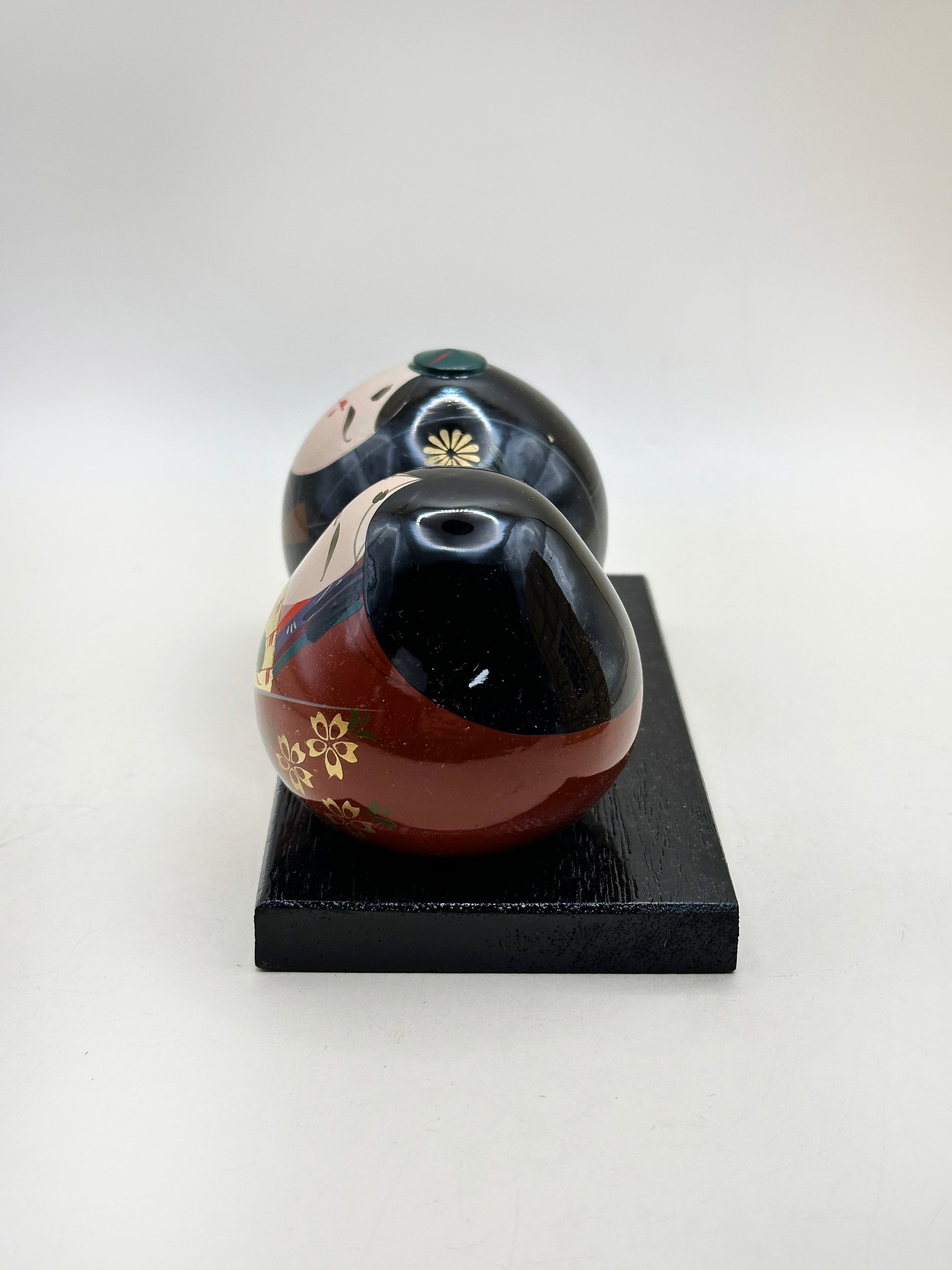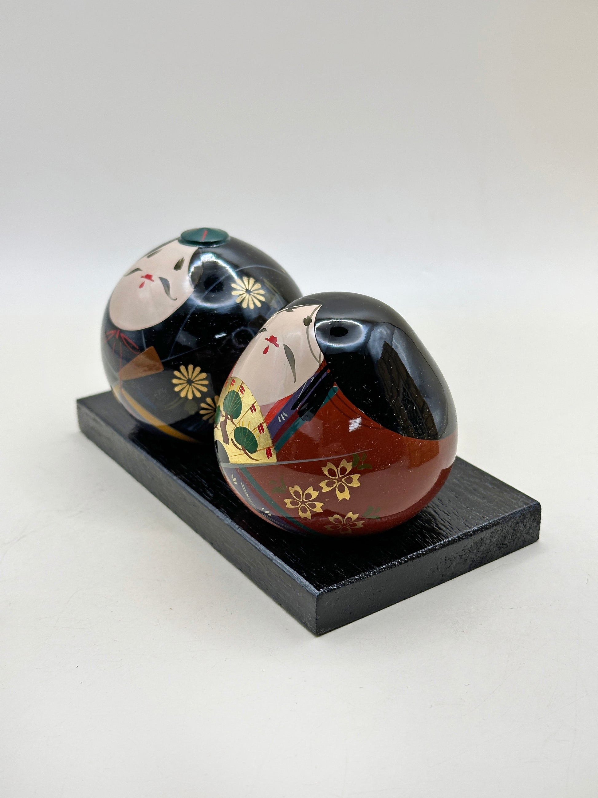 Rounded in form and seated side by side on a black base, the Emperor and Empress are rendered in a charming, minimalist style. Their softly smiling white faces are delicately hand-painted with fine brows and small red lips, conveying serenity and grace. The bodies are finished in rich lacquer—deep black for the Emperor and warm vermilion for the Empress—embellished with traditional floral motifs in gold.