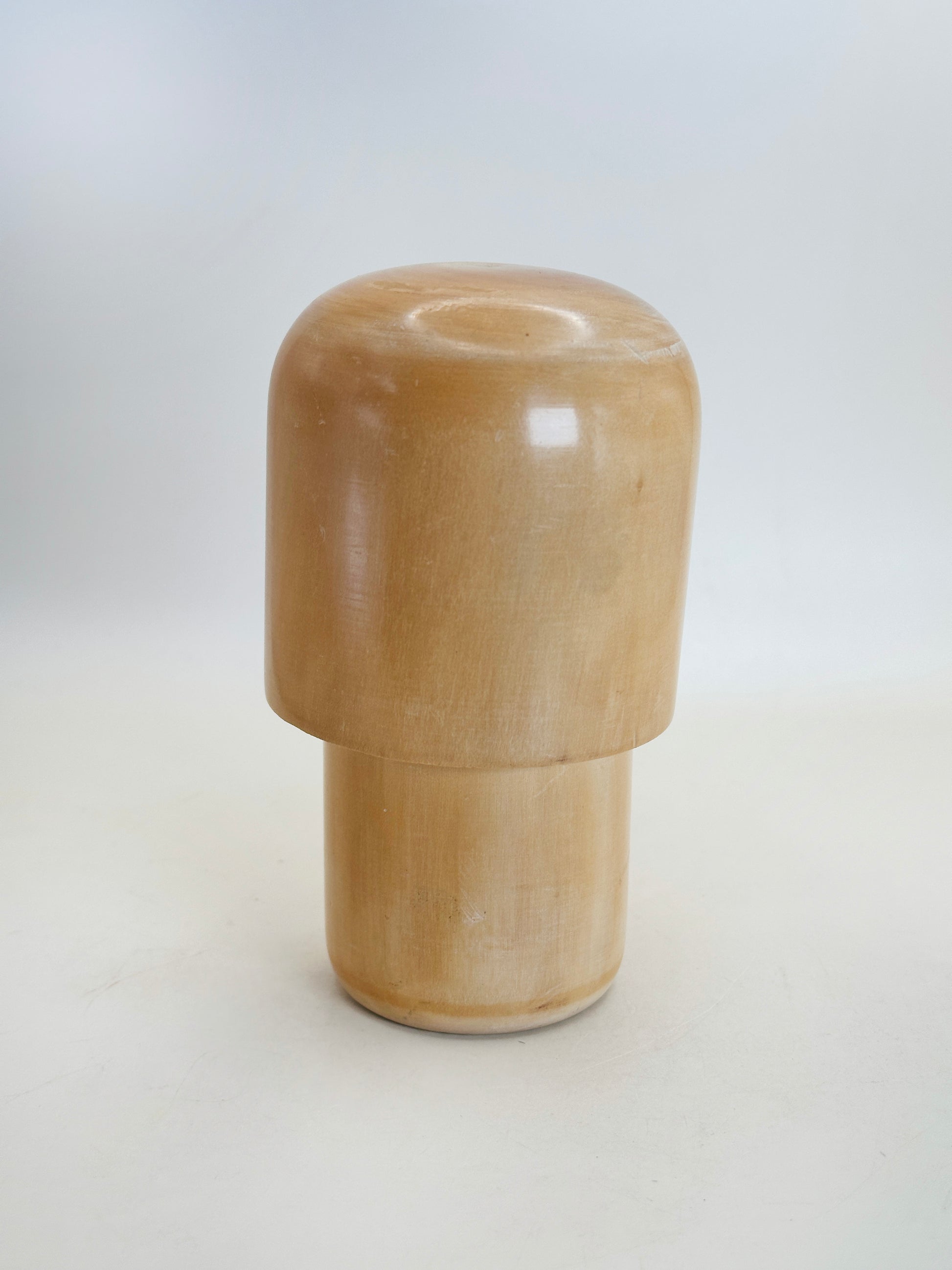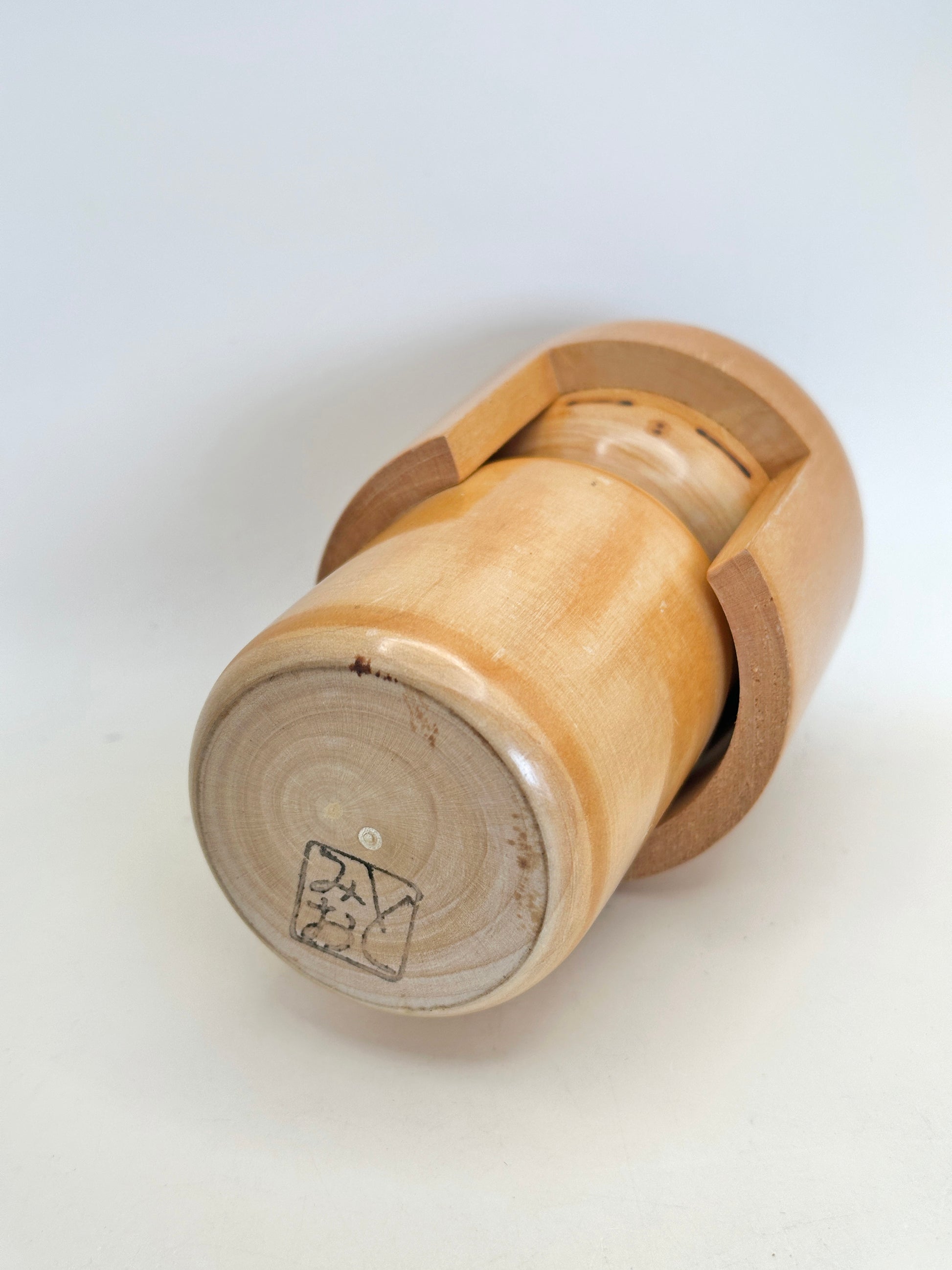 The body is smooth and cylindrical, left in a natural wood tone that highlights Ishida’s preference for simplicity over ornamentation. Instead of painted patterns, the artist allows the grain and natural sheen of the wood to become the central visual feature—emphasizing purity, symmetry, and a sculptural sensibility. The clean lines, balanced proportions, and subtle transitions between head and body reflect Ishida’s craftsmanship and his appreciation for modern Japanese aesthetics.
