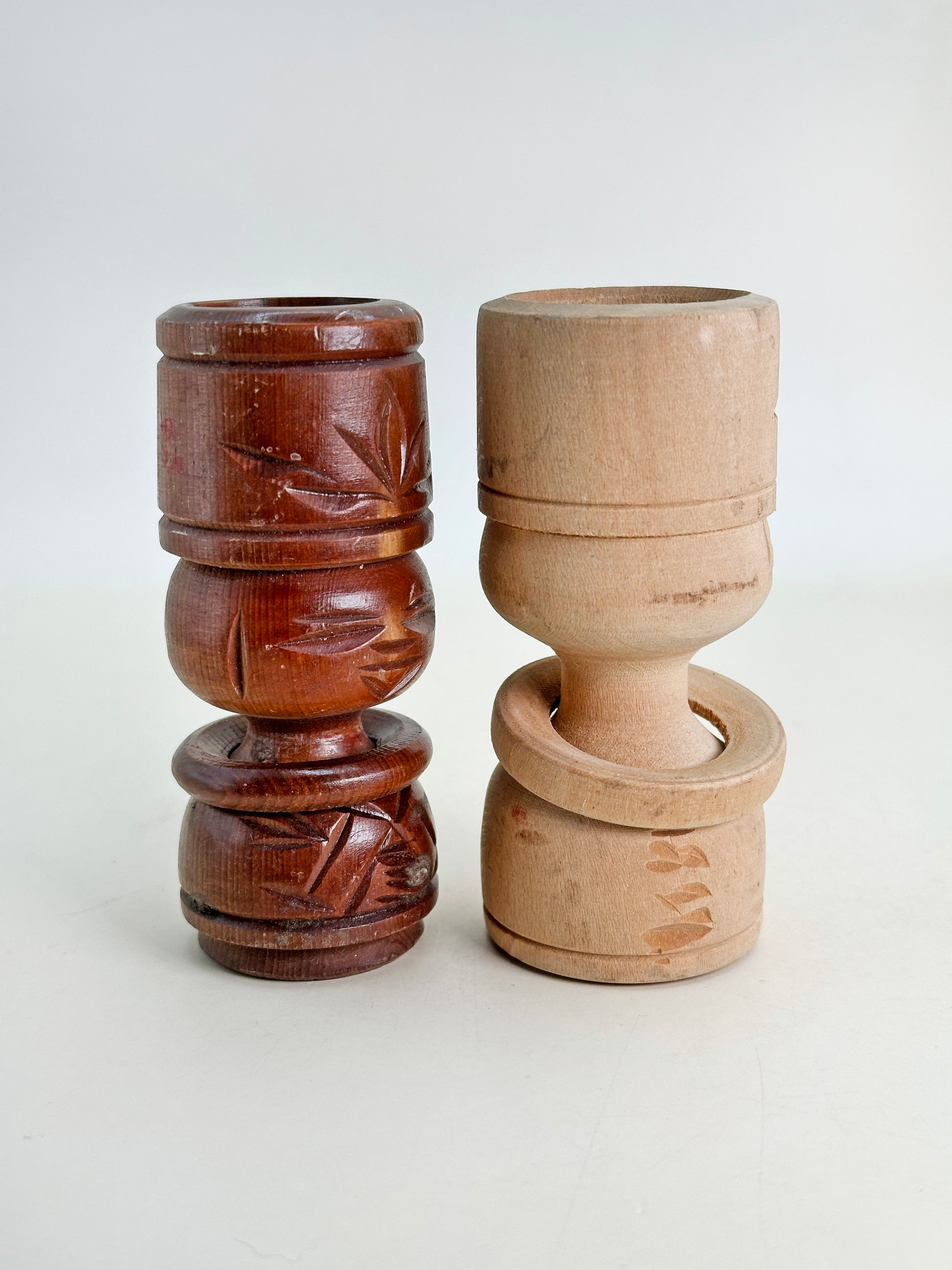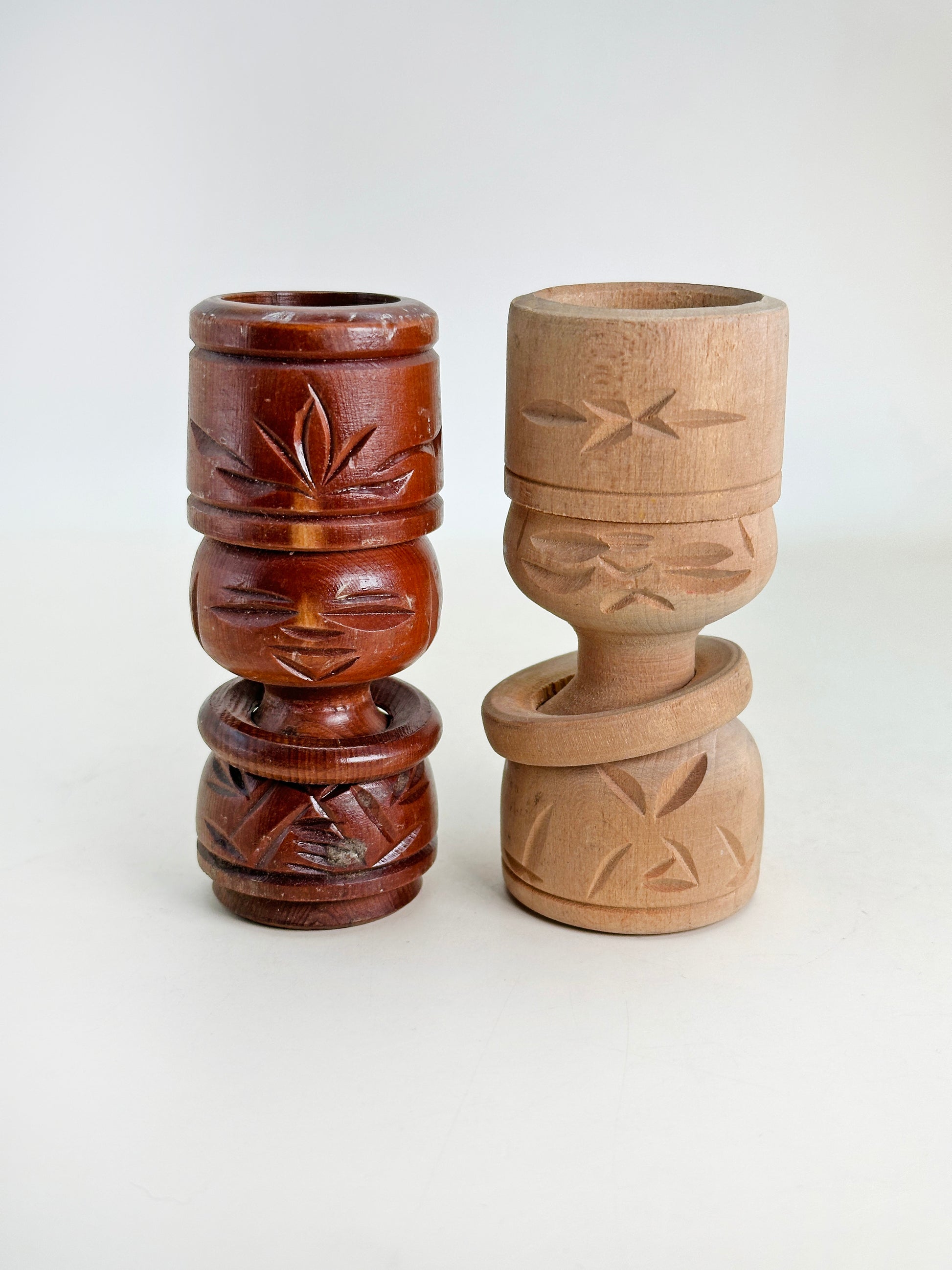 The word "Nipopo" comes from the Ainu language, meaning “small wooden figure”. These dolls were traditionally believed to bring good luck, protection, and prosperity. Characterized by their stacked cylindrical shapes, carved features, and simplified human form, each doll in this pair is hand-carved with bamboo-like leaf motifs and a distinctive ring around the body, a design element seen in Ainu and northern Japanese crafts.
