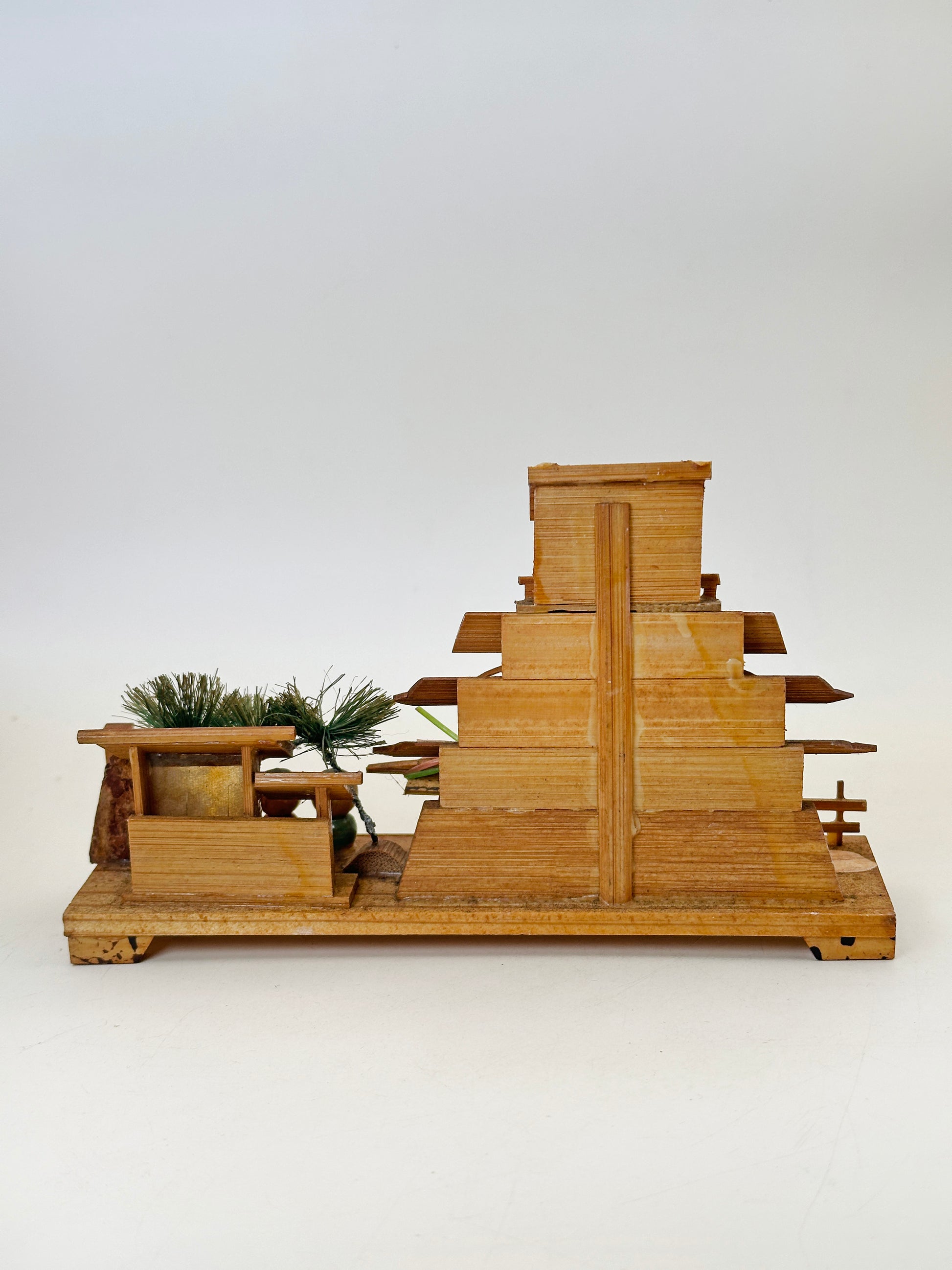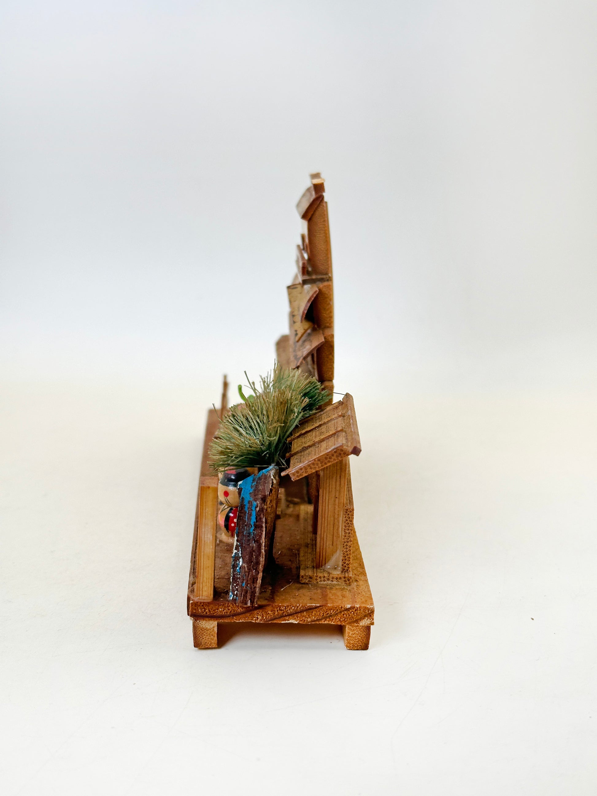 Constructed from thinly cut and layered bamboo, the castle’s multi-tiered structure is carefully assembled to reflect the classic silhouette of a Japanese fortress, complete with sweeping eaves and stacked rooftops. The natural tones of bamboo, enhanced by subtle scorching and staining, give depth and texture to the surfaces, evoking the aged wood of historic castle architecture.