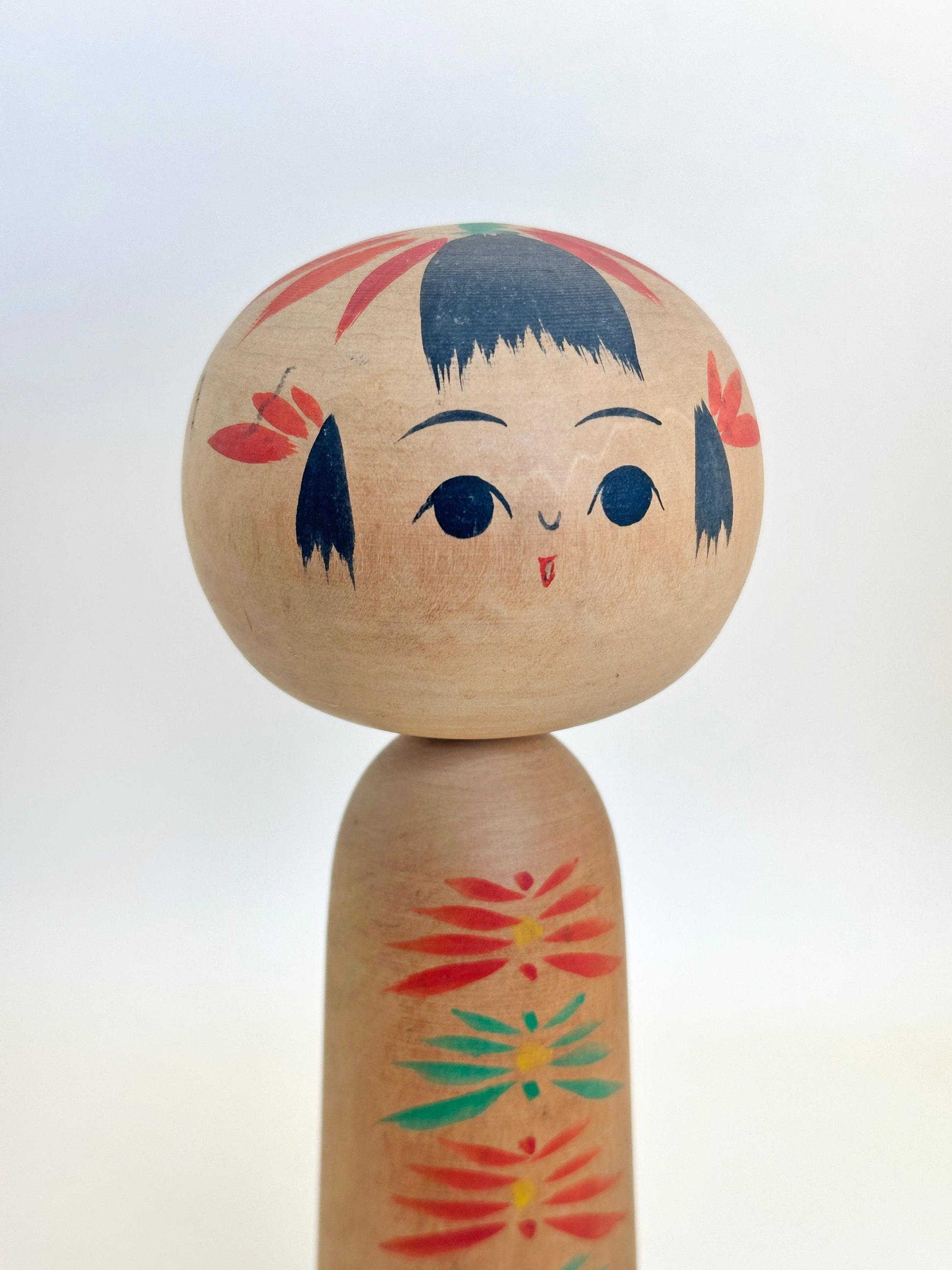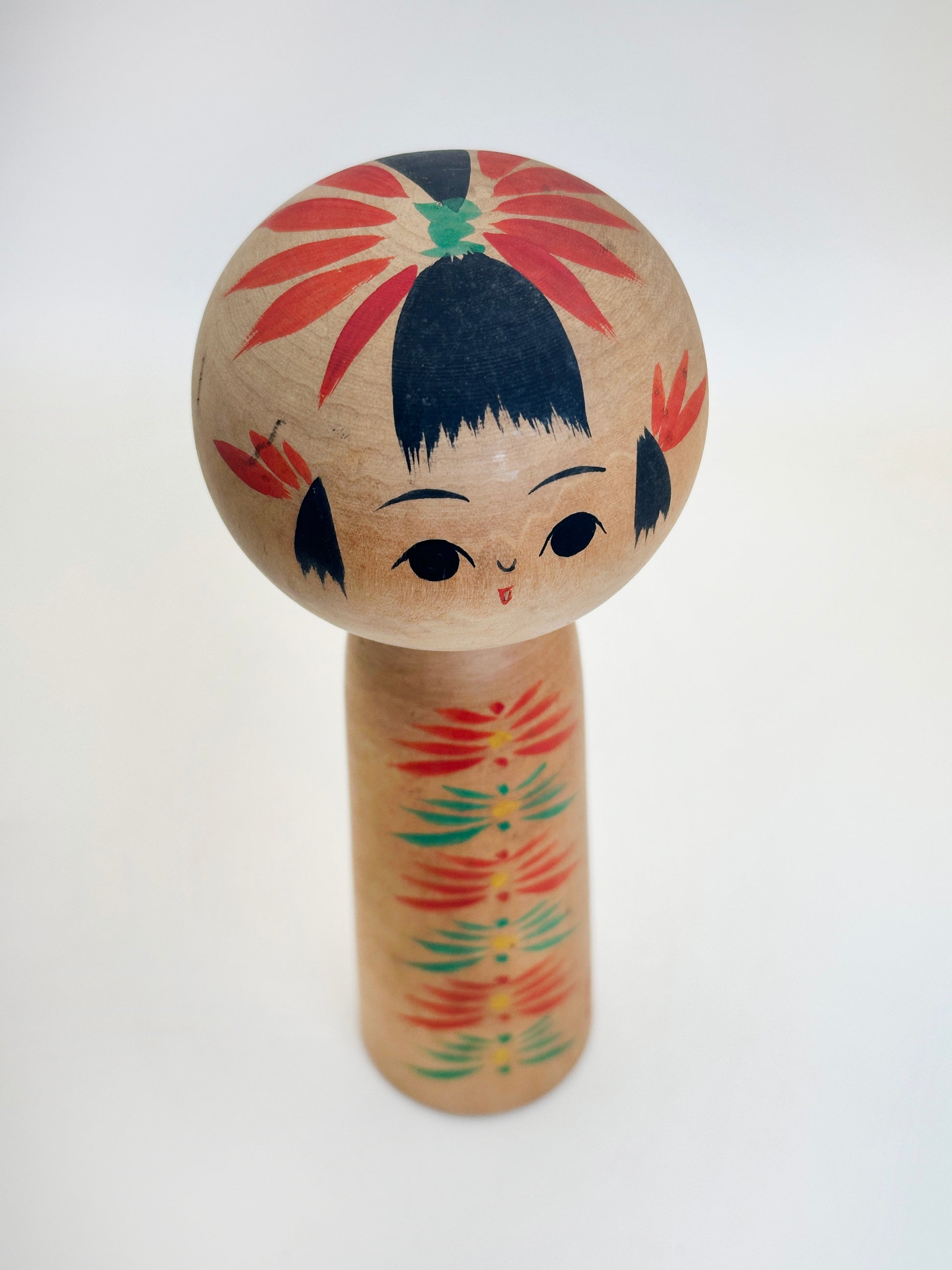 Façonnée à la main par une artiste signant 光 (Hikari), cette kokeshi en bois rayonne d'un charme joyeux. Son visage rond est délicatement peint à la main, arborant un sourire éclatant et des yeux expressifs, encadrés de cheveux noirs stylisés rehaussés de touches florales rouges. Le corps cylindrique est orné d'une composition verticale de motifs floraux géométriques rouges, verts et jaunes, évoquant des fleurs tropicales ou des feux d'artifice festifs – des couleurs souvent associées à la vitalité et à la joie de vivre du Sud.