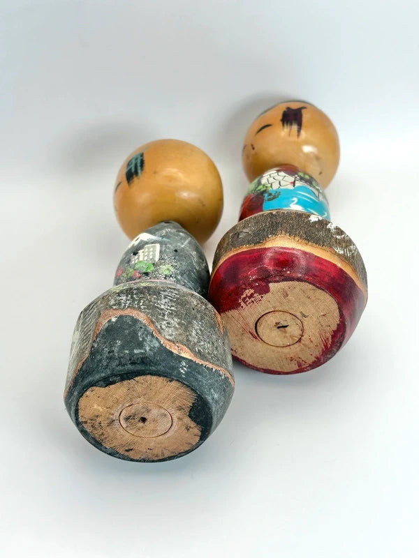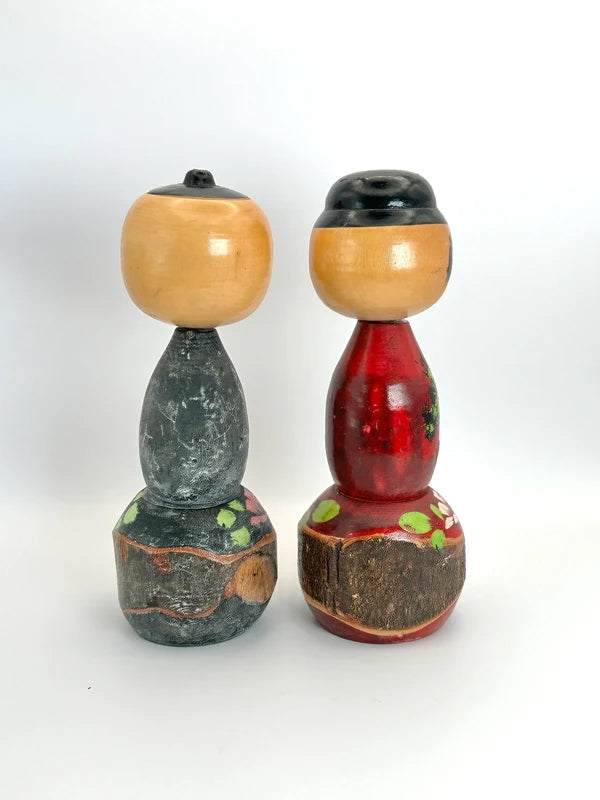 Poupées Kokeshi à tête branlante vintage souvenir de Tokyo – Lot de 2 (motif Tour de Tokyo et Palais impérial). Cette paire de poupées kokeshi vintage à tête branlante capture des monuments emblématiques de Tokyo avec des détails peints à la main. Fabriquées comme des pièces omiyage souvenirs, elles célèbrent la capitale du Japon avec des images symboliques et une calligraphie de bon augure.