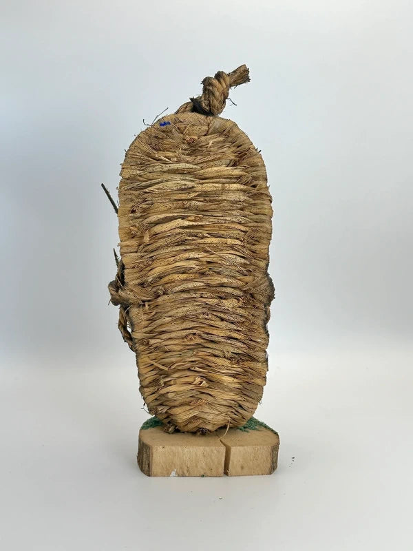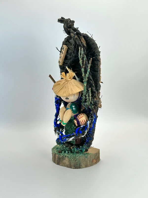 Les sandales en paille tressée, appelées waraji, étaient traditionnellement portées par les agriculteurs, les moines et les voyageurs au Japon. Les waraji symbolisent le travail acharné, la persévérance et la sécurité des voyages. Leurs éléments décoratifs, tels que des banderoles en aluminium bleu brillant et des textures moussues évoquant l'eau et la végétation, renforcent l'impression d'un moment de sérénité au bord d'une rivière. L'étiquette en bois qui les accompagne porte l'inscription « あやめ池 » (Ayameike), confirmant ainsi leur origine comme souvenir du parc d'attractions et de l'étang de plaisance, aujourd'hui disparus, qui étaient une destination prisée à l'époque Shōwa.