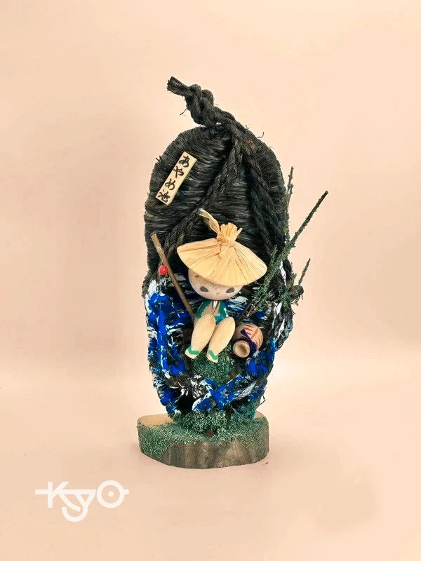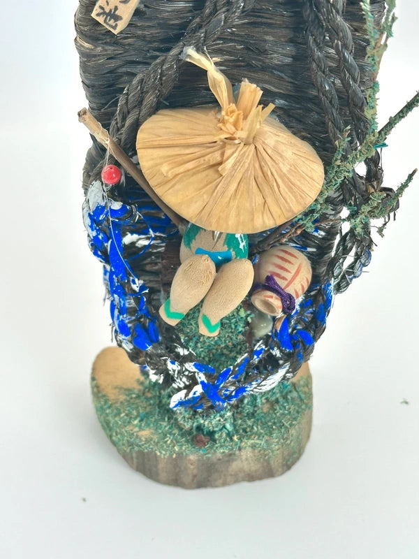 La poupée kokeshi, peinte à la main, affiche une expression douce. Elle est vêtue d'une tenue traditionnelle et coiffée d'un kasa (chapeau) en paille tressée. Assise, sa canne à pêche tendue, comme en pleine pêche, elle est à côté d'une petite cruche et de verdure, évoquant une paisible scène rurale. La base de la présentation est constituée d'une sandale waraji laquée sombre, qui sert à la fois de plateforme astucieuse et de clin d'œil symbolique aux voyages et pèlerinages traditionnels japonais.