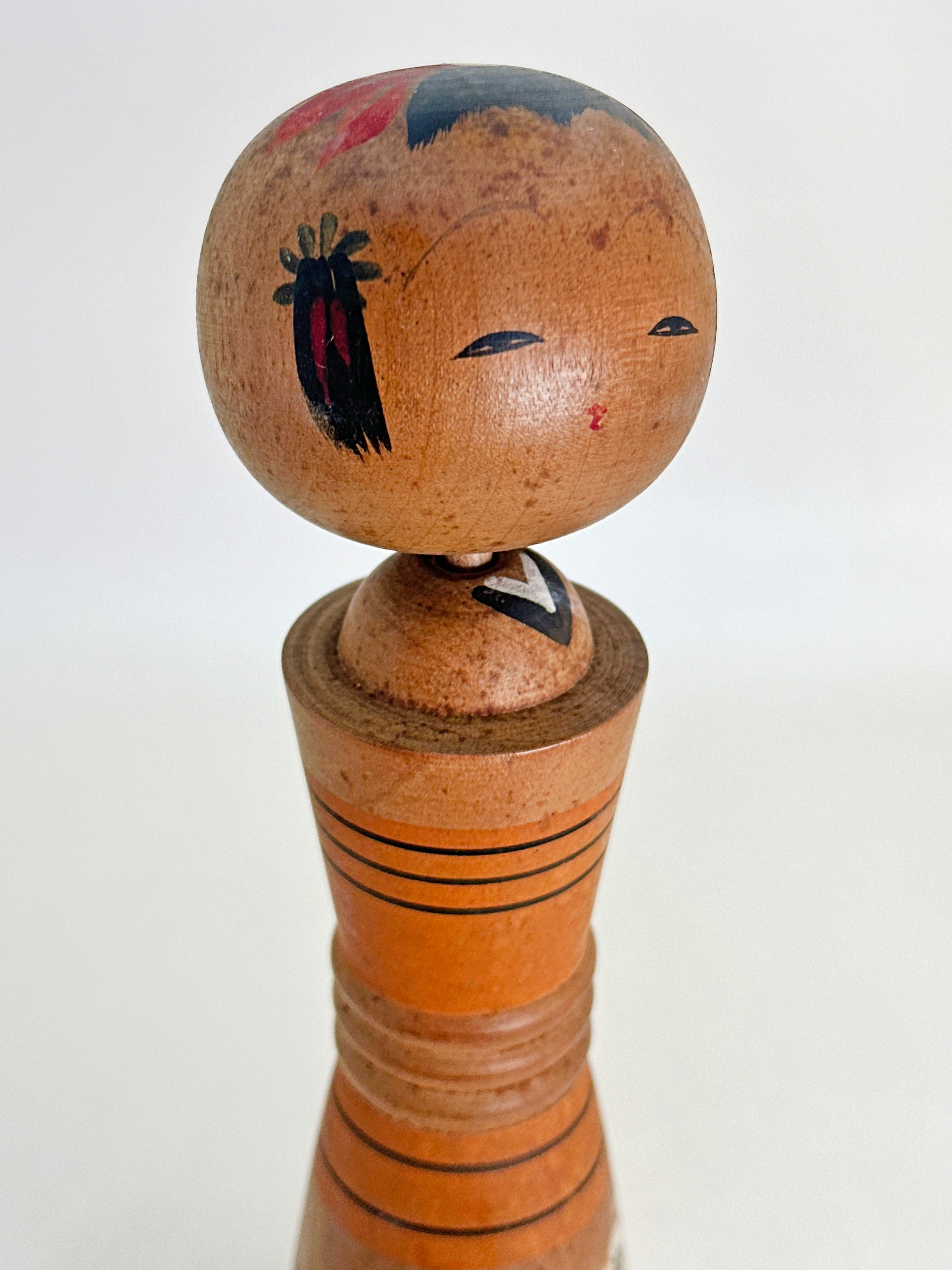 Natural wood tones are enhanced by subtle rings and painted bands, emphasizing the vertical flow of the form, while the softly aged patina suggests both time and care. As a sōsaku (creative) kokeshi, this work moves beyond strict regional tradition, using the Nanbu style as a foundation for personal artistic expression.