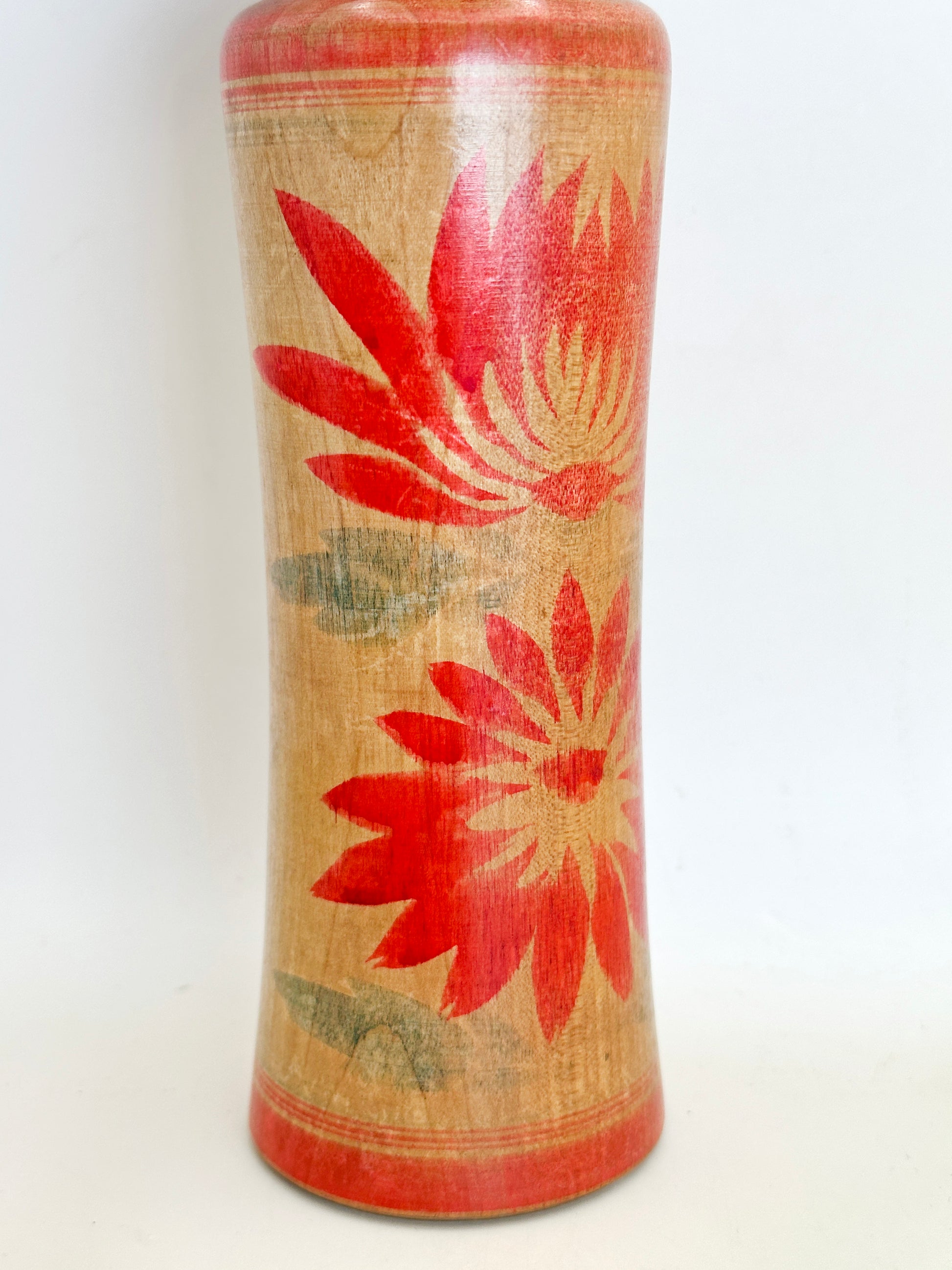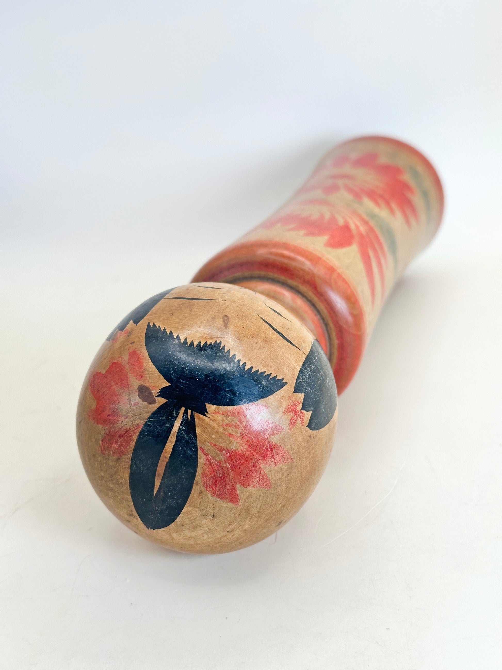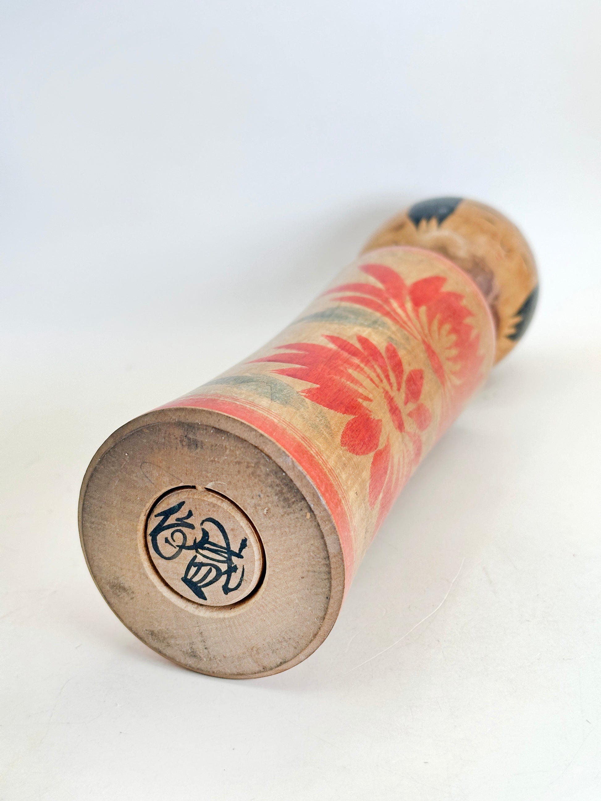 This is a classic Naruko-style kokeshi doll crafted by the esteemed Takahashi Sakari (高橋盛, 1890–1973), a master woodcarver who played a central role in the evolution of Naruko kokeshi during the early to mid-20th century. Measuring 23 cm, this piece is a fine example of the Naruko tradition with its cylindrical body, gentle curves, and distinctive floral motifs.