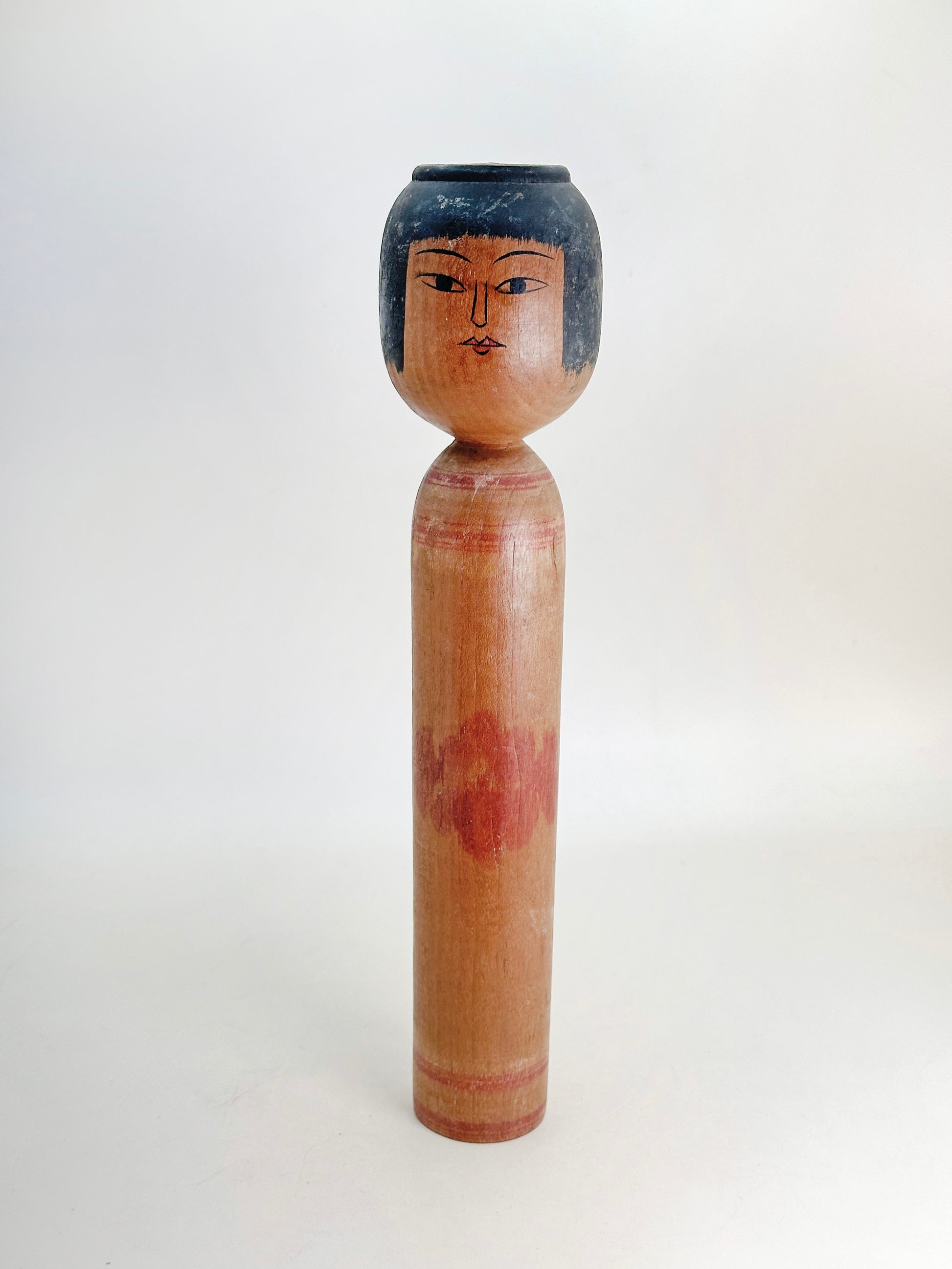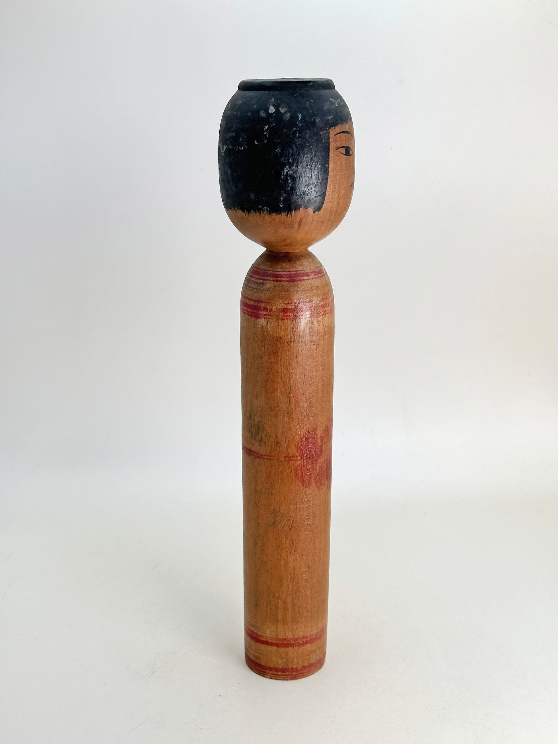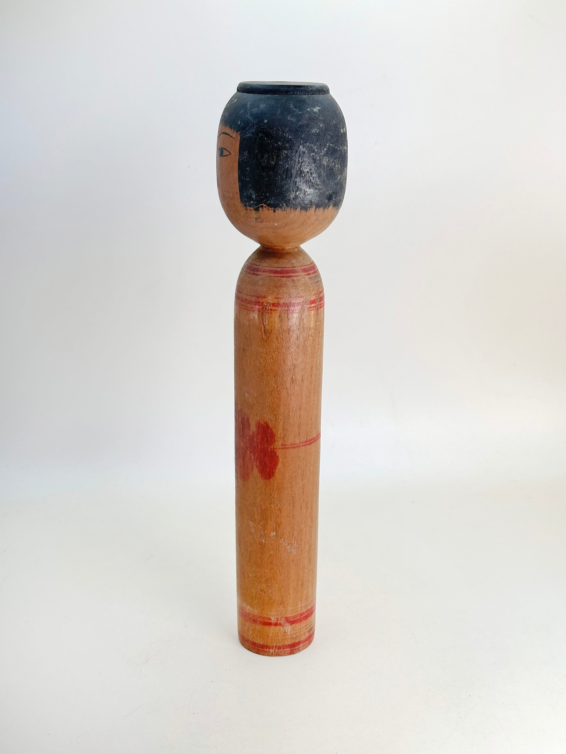 This 1960s example reflects his early adherence to the Mori Hidetaro lineage. The head is slightly squared with a flat crown, and the facial features are sharply defined—fine linear eyes, a straight nose, and delicately shaped lips—conveying a calm, introspective expression typical of Tsugaru kokeshi. The elongated body is understated, with restrained decoration that allows the warm natural wood grain to remain prominent. A soft red floral accent subtly emerges from the surface, suggesting his refined yet controlled decorative approach during this early period.
