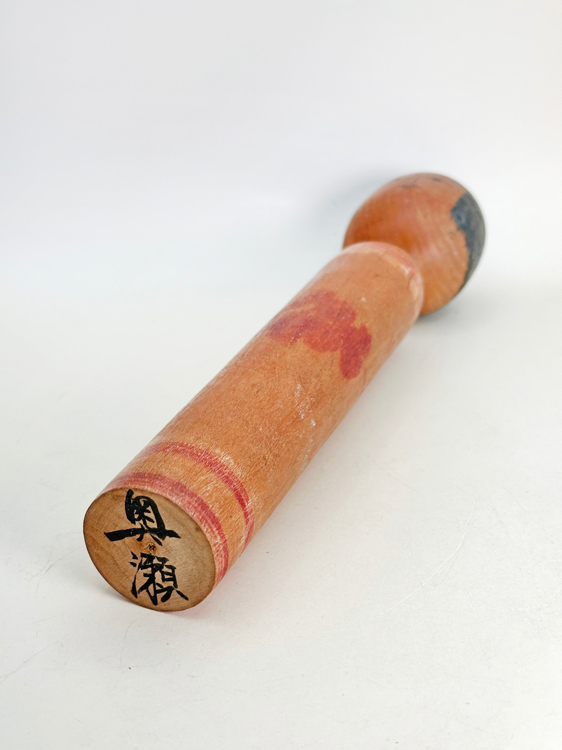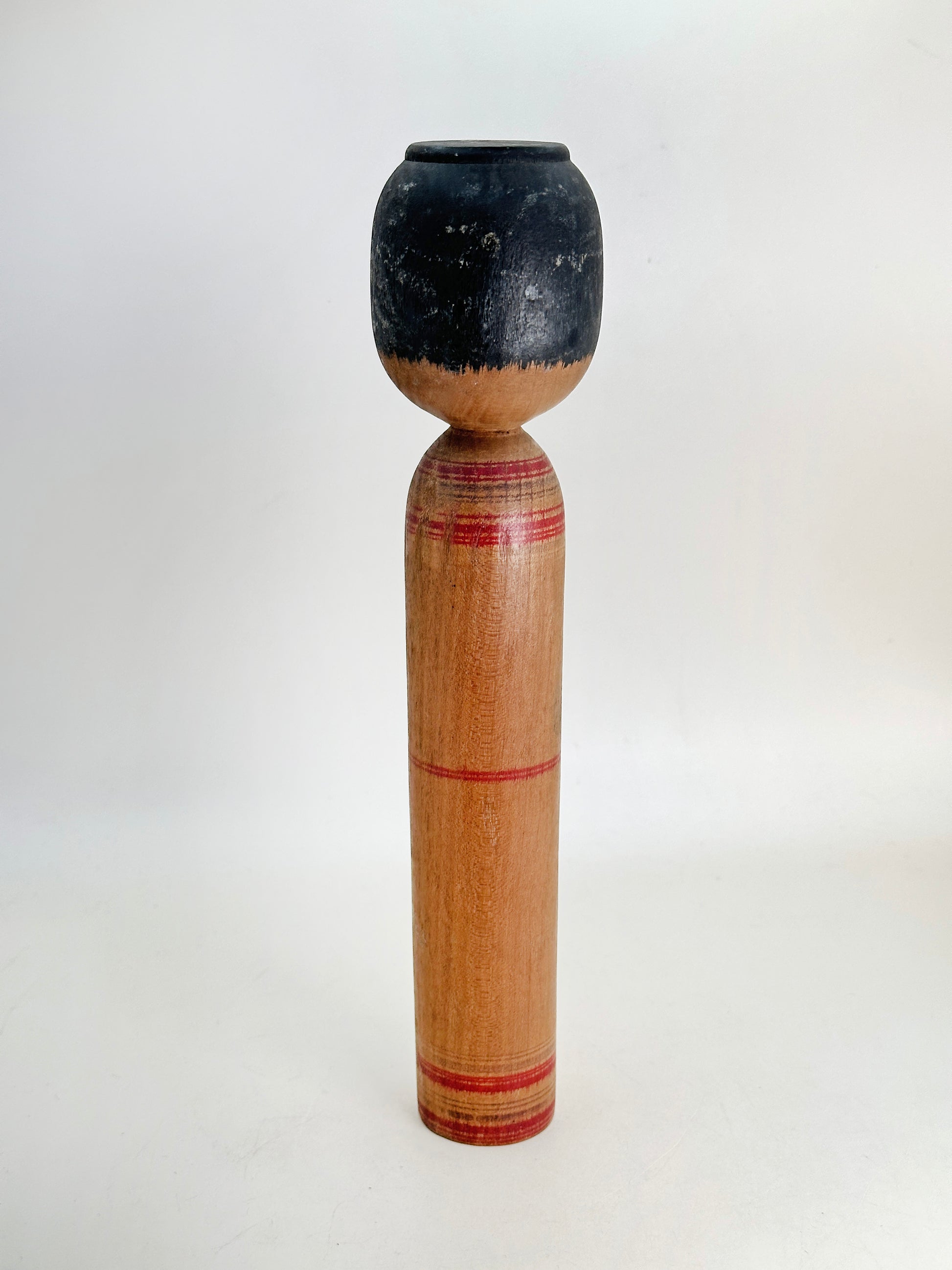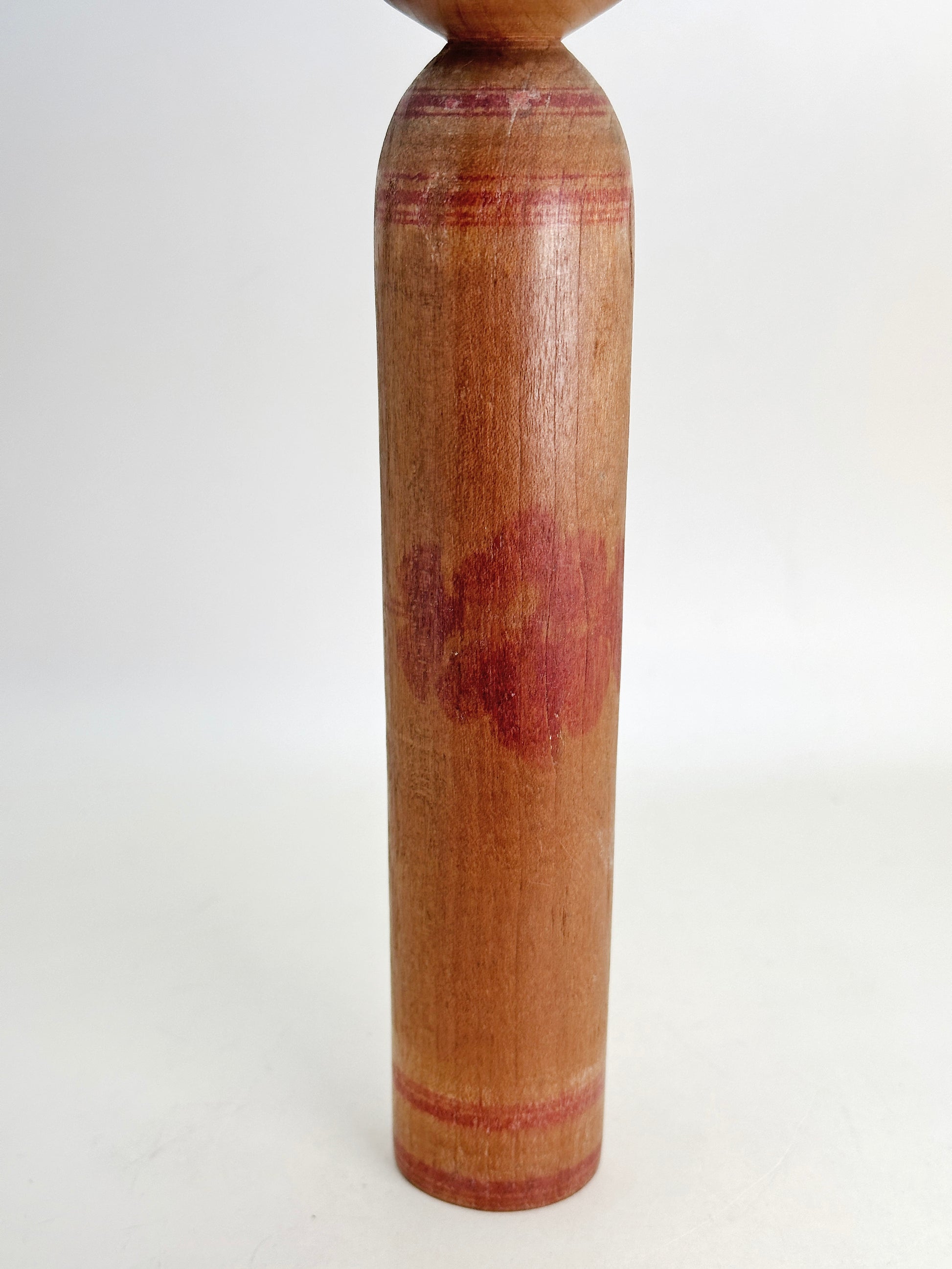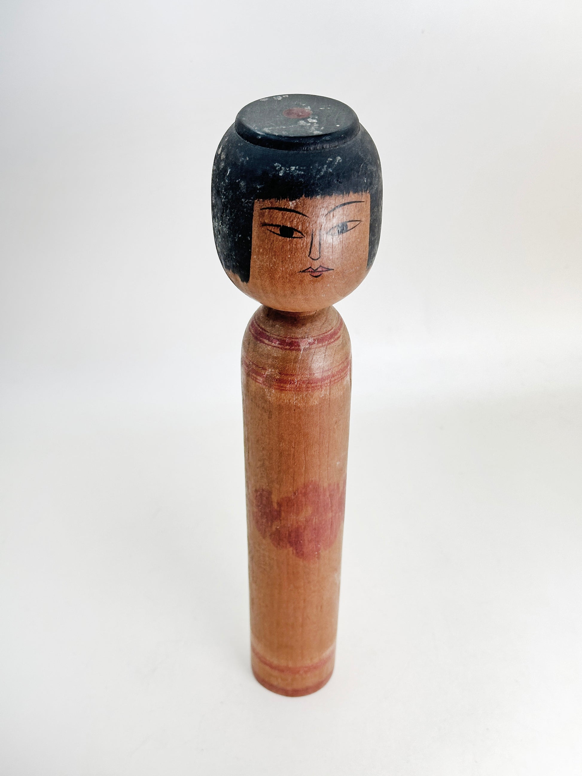 This 1960s example reflects his early adherence to the Mori Hidetaro lineage. The head is slightly squared with a flat crown, and the facial features are sharply defined—fine linear eyes, a straight nose, and delicately shaped lips—conveying a calm, introspective expression typical of Tsugaru kokeshi. The elongated body is understated, with restrained decoration that allows the warm natural wood grain to remain prominent. A soft red floral accent subtly emerges from the surface, suggesting his refined yet controlled decorative approach during this early period.