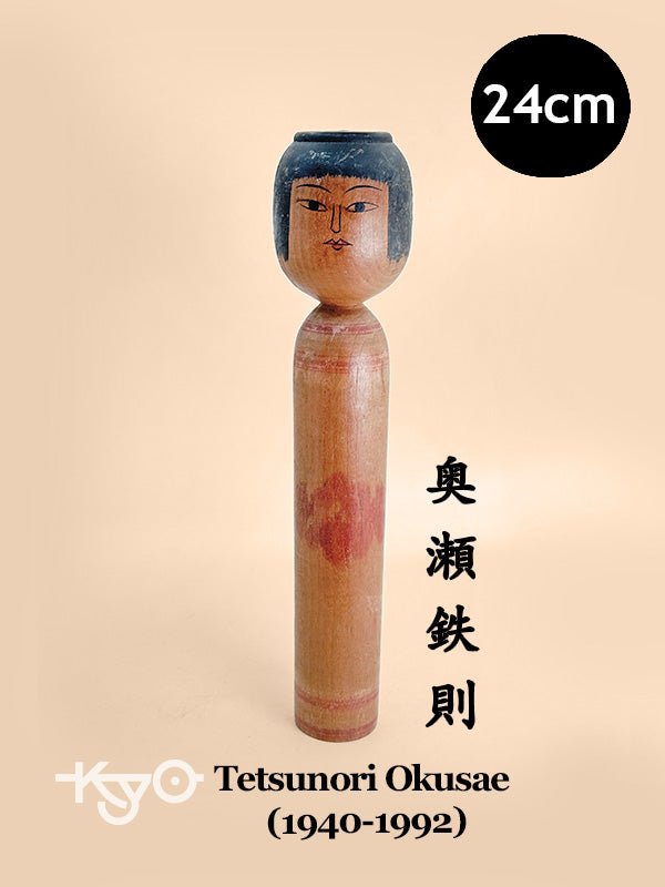 Born on August 21, 1940, in the Futatsufugaya Muramoto area of Kuroishi City, Aomori Prefecture, Okusae was the third son of tofu craftsmen Okusae Iwakichi and Shiyo. While still attending Kuroishi City High School (part-time), he began training in woodcarving in August 1956 under the renowned Tsugaru master Mori Hidetaro, balancing his apprenticeship with farm work. After graduating in April 1959, he formally began producing Hidetaro-style kokeshi. His works were distributed through the Tokyo Kokeshi Friendship Association and reached the general market by 1962. Among his fellow apprentices was Sato Zenji.