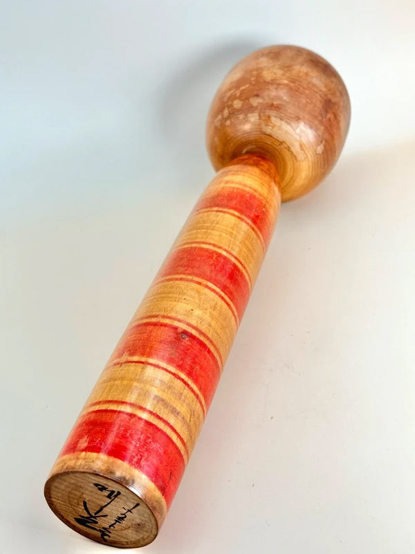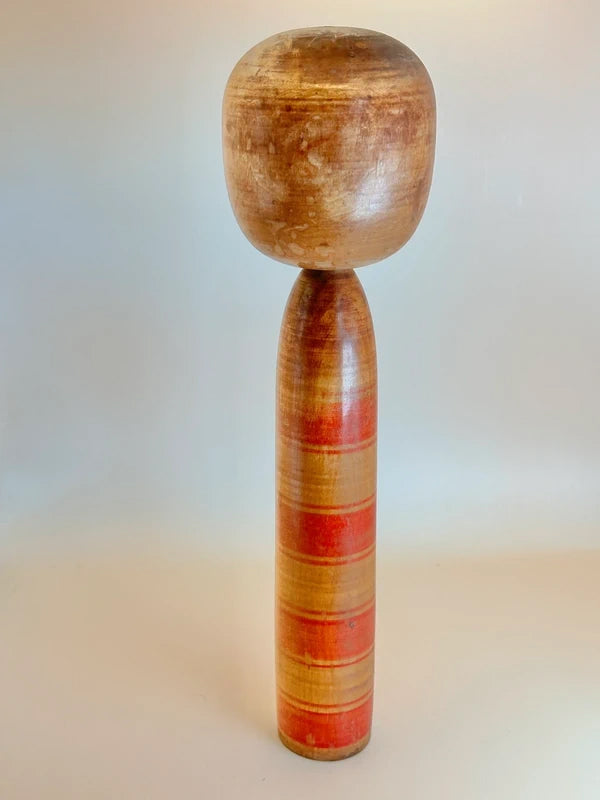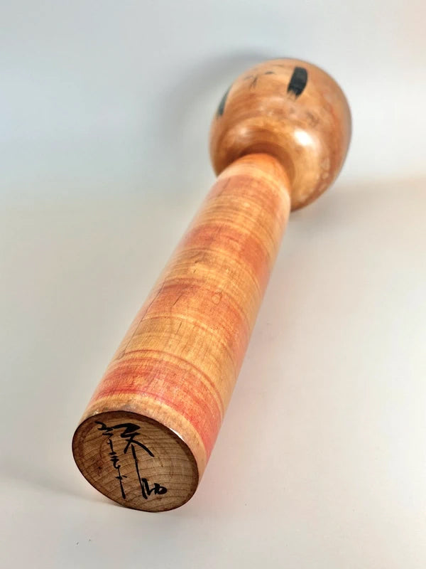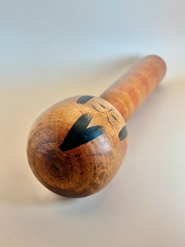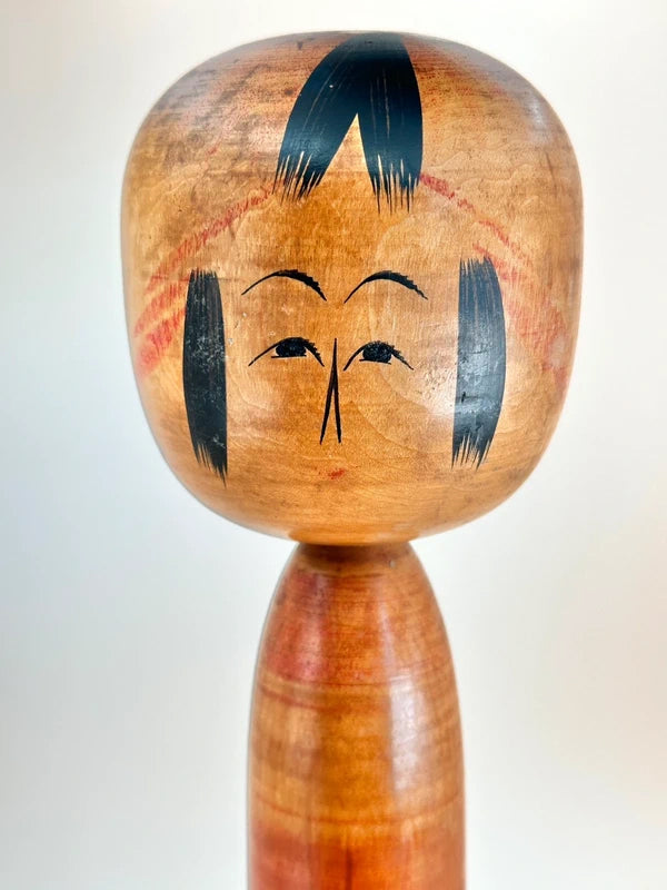 Une kokeshi de style Togatta, fabriquée dans les années 1940 par le maître artisan Bunsuke Sato, illustre l'élégance rustique du savoir-faire du début de l'ère Showa. Avec son corps cylindrique, ses subtiles marques de tournage et ses traits minimalistes, cette poupée dégage un fort sentiment de tradition et un caractère tranquille. Son expression est pensive, encadrée par des traits de cheveux audacieux et simplifiés, et le grain du bois est patiné par le temps, ajoutant à son charme vintage. Contrairement aux kokeshi plus récentes qui privilégient souvent les décorations vives, cette pièce incarne la modestie et la chaleur de l'art populaire fonctionnel. Elle est une représentation saisissante de la lignée Togatta à une époque où les kokeshi passaient du statut de souvenirs locaux à celui d'objets culturels de collection. Bunsuke Sato est né le 23 novembre 1901 à Aone Onsen, une région imprégnée de la tradition kokeshi. Fils de Bunkichi Sato, puis gendre de la famille Sato Shuemon, il était profondément ancré dans la lignée des kokeshi Togatta, tant par son héritage que par son mariage. Bunsuke a commencé à travailler au tour de potier dès son enfance, suivant une formation formelle auprès de son père et maîtrisant le tournage d'œuvres en bois complexes à la fin de son adolescence. Au début de sa carrière, il a travaillé à Ogi, Hanamaki et même Hokkaido, avant de retourner à Togatta pour fonder sa propre usine de menuiserie hydraulique en 1930. Il a encadré de futurs artisans de kokeshi et, avec Ushizo Sato, a contribué au renouveau des kokeshi de Togatta après la guerre, lors du deuxième boom des années 1940. Bien que connu pour être un homme discret et aux opinions tranchées, Bunsuke Sato était vénéré pour son esprit artisanal intransigeant et son profond respect du savoir-faire traditionnel. Il a continué à produire des kokeshi et des jouets en bois jusqu'à sa mort en 1977, laissant derrière lui un héritage précieux pour les collectionneurs et ses confrères. Dimensions : 8 x 8 x 30 cm