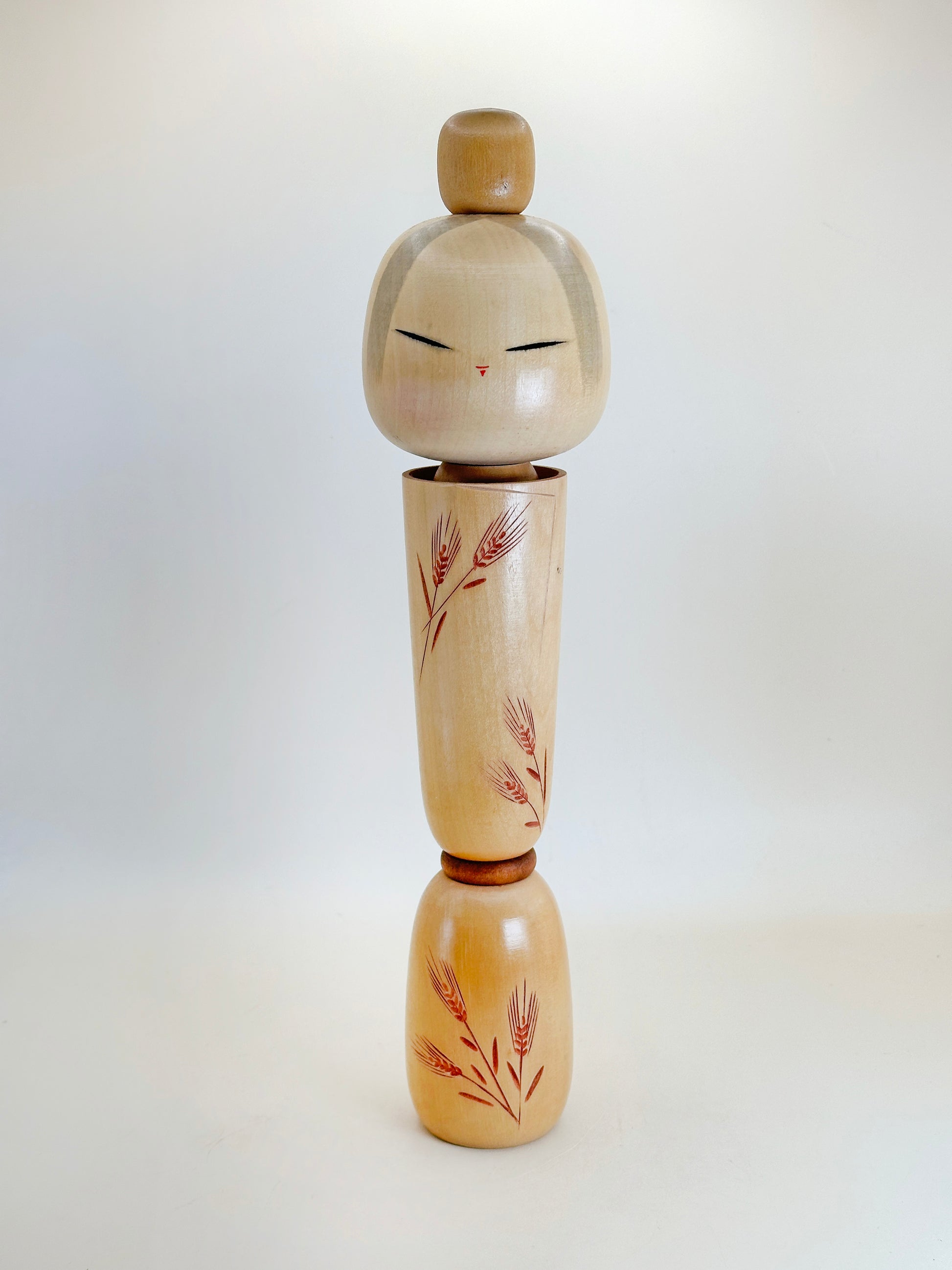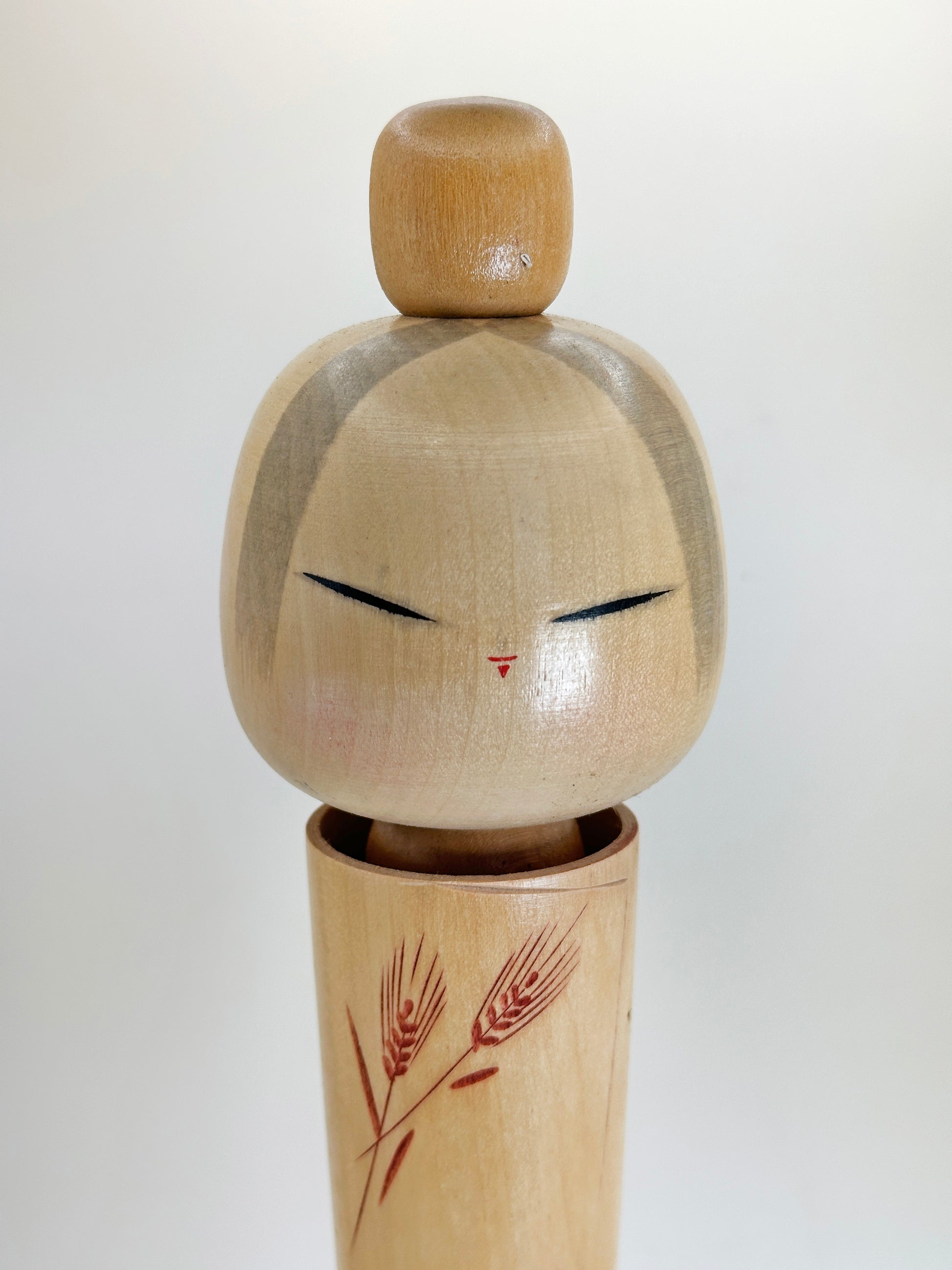 The piece is crafted from light wood, with delicate hand-painted motifs of ripened wheat stalks that gently wrap around the smooth body. The restrained design highlights Kishi’s signature style — emphasizing the beauty of natural wood grain and the tranquil spirit of his chosen motifs. The doll’s minimalist expression, with fine, closed eyes and a calm demeanor, evokes a meditative stillness that embodies the spirit of the earth and harvest.