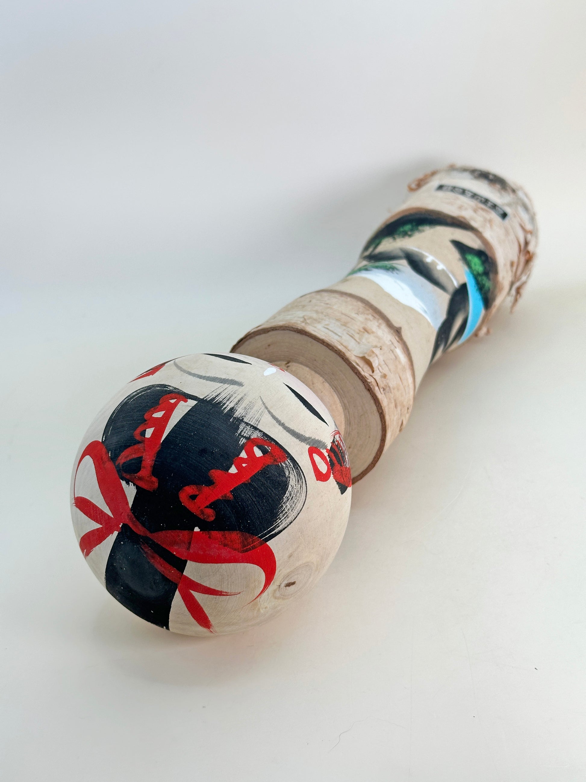 This omiyage kokeshi doll in very good condition, it is a delightful souvenir from Mt. Fuji’s Fifth Station (富士山五合目), a popular sightseeing and resting point on Japan's iconic mountain. Handcrafted from shirakaba (白樺) white birch wood, the doll retains the natural texture and bark of the birch, celebrating the rustic beauty of the material and evoking a sense of closeness to nature.