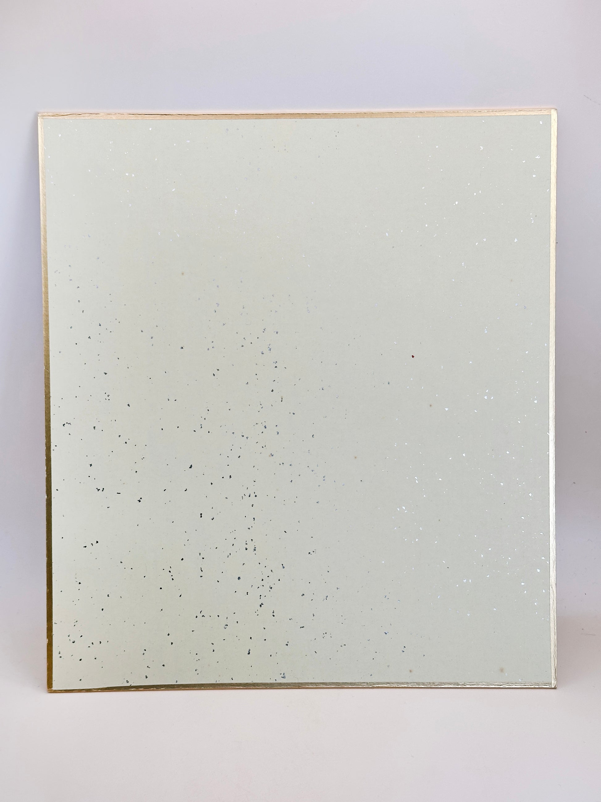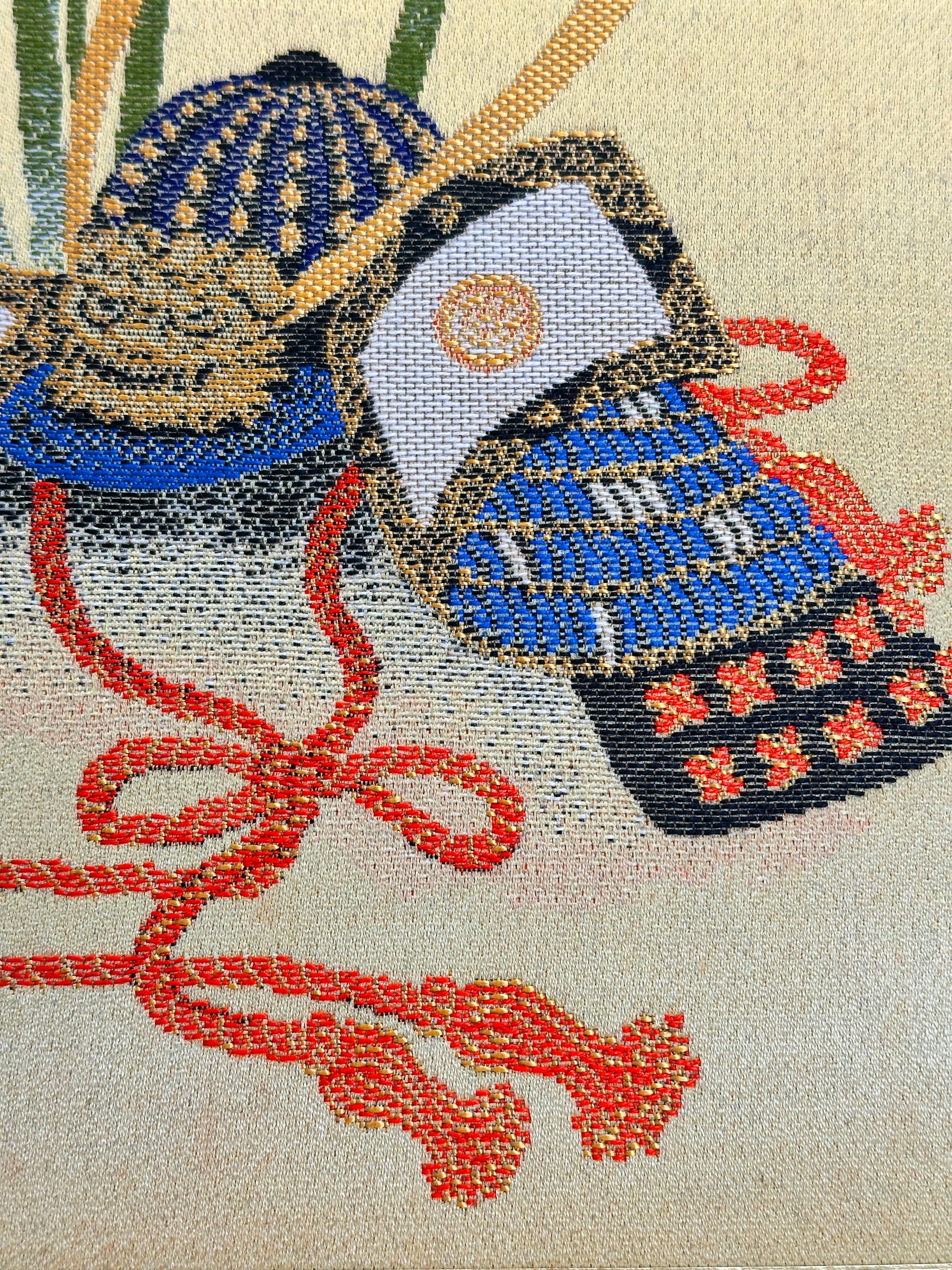 This shikishi artwork by Saitō Sō (斉藤宗) features a woven depiction of a samurai helmet (kabuto), a powerful emblem of strength, honor, and protection. Created using Nishijin Ayakinori (西陣綾錦織)  a refined Kyoto textile weaving technique, the piece shimmers with intricate brocade patterns and luminous metallic threads that bring depth and vitality to the composition.