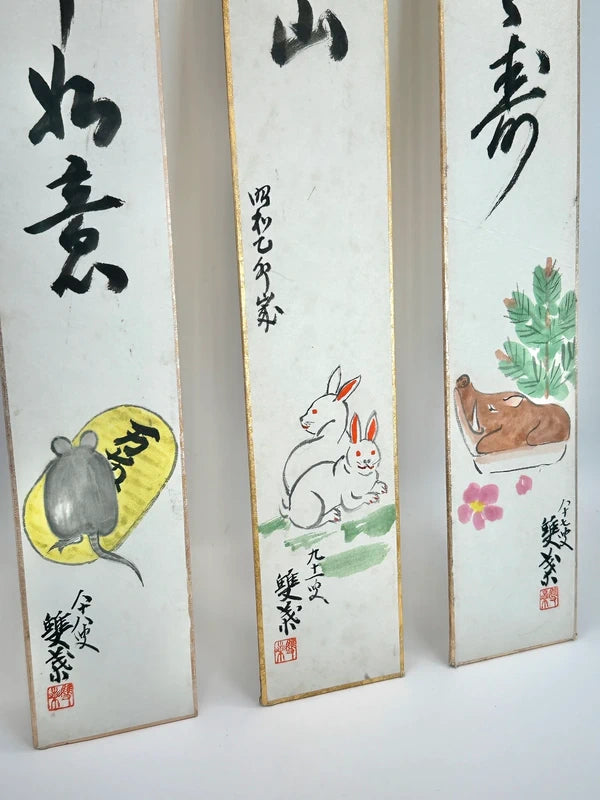 Ce jeu de cartes calligraphiées Tanzaku verticales capture les vœux traditionnels japonais et les images saisonnières associées au zodiaque. Chaque tanzaku présente des kanjis peints à la main, associés à une illustration animale délicatement peinte symbolisant une année spécifique du cycle zodiacal japonais. Ces œuvres allient mots de bon augure et peinture raffinée, parfaites pour les décorations du Nouvel An ou des fêtes.