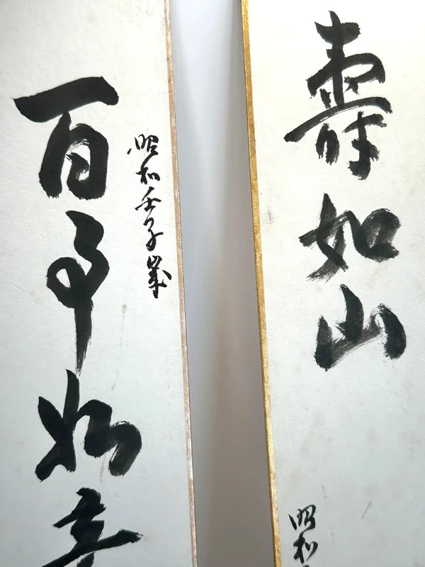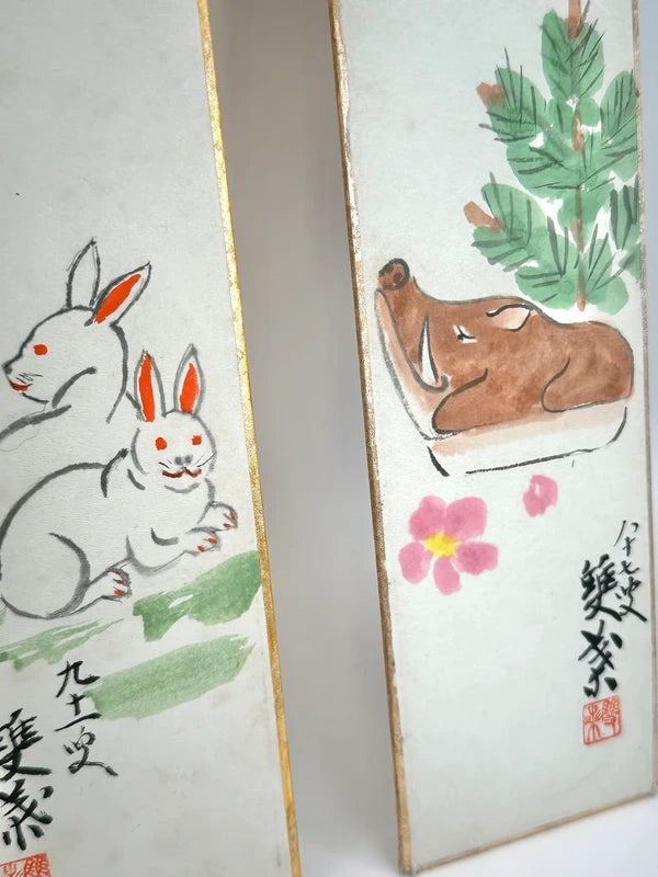 - 壽如山 (Jū Yama no Gotoku) « Que ta longévité soit comme une montagne. » Un vœu de longévité et de stabilité, comparable à la force immuable d'une montagne. Sous la calligraphie, deux lapins blancs reposent sur l'herbe – un motif tendre lié à l'année du Lapin, symbolisant la paix, la pureté et le renouveau. Ce tanzaku a été créé en l'an 62 de Showa (1987), une autre année du Lapin.