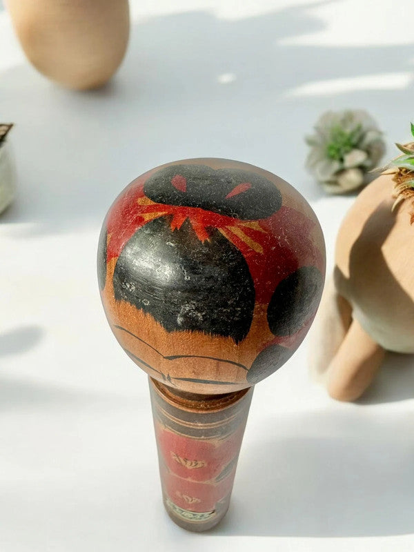 Cette kokeshi est un exemple de poupée Shingata (de transition), incarnant les caractéristiques d'une famille traditionnelle Tougatta, visibles dans la tête et le visage (yeux étroits