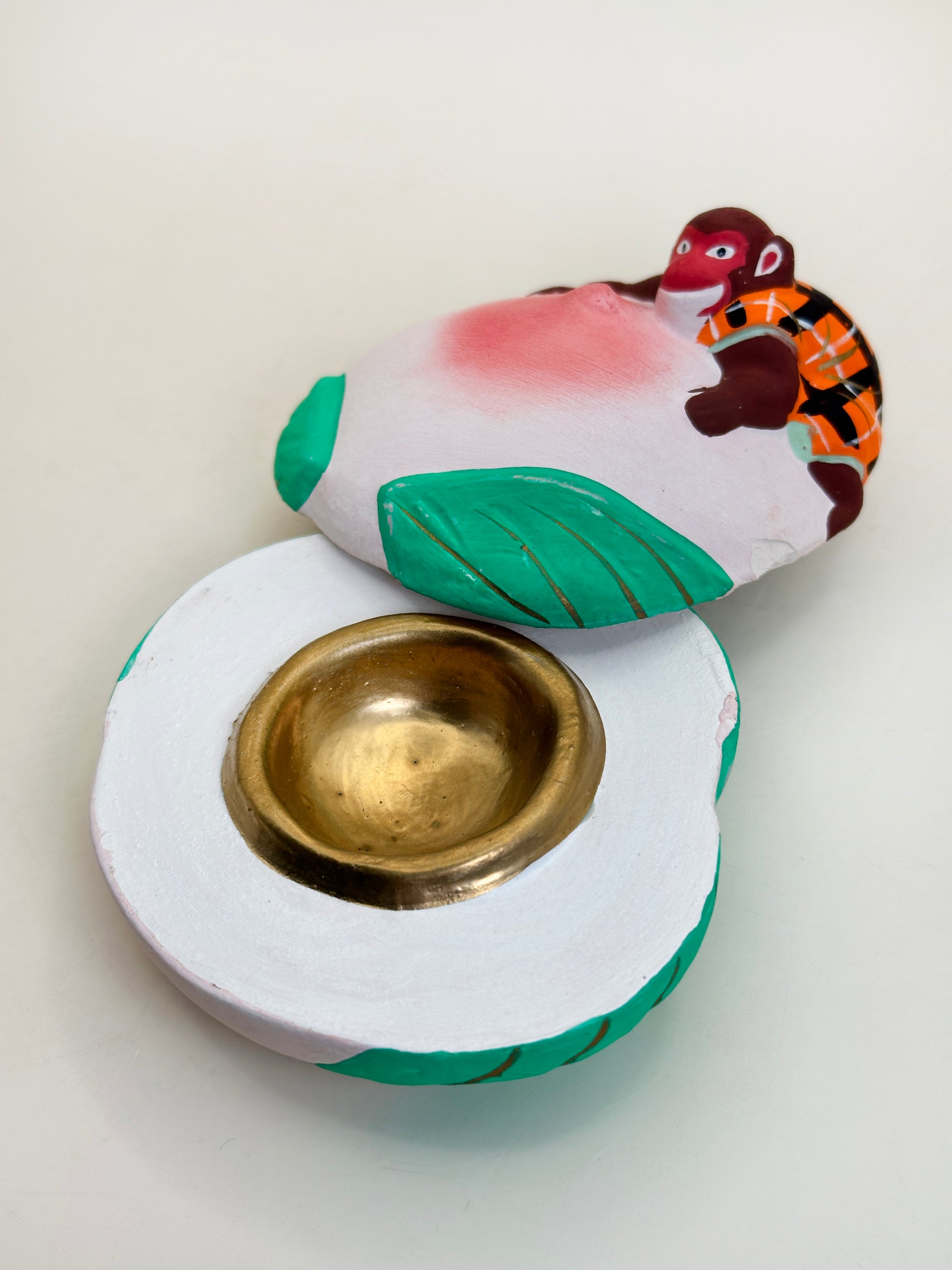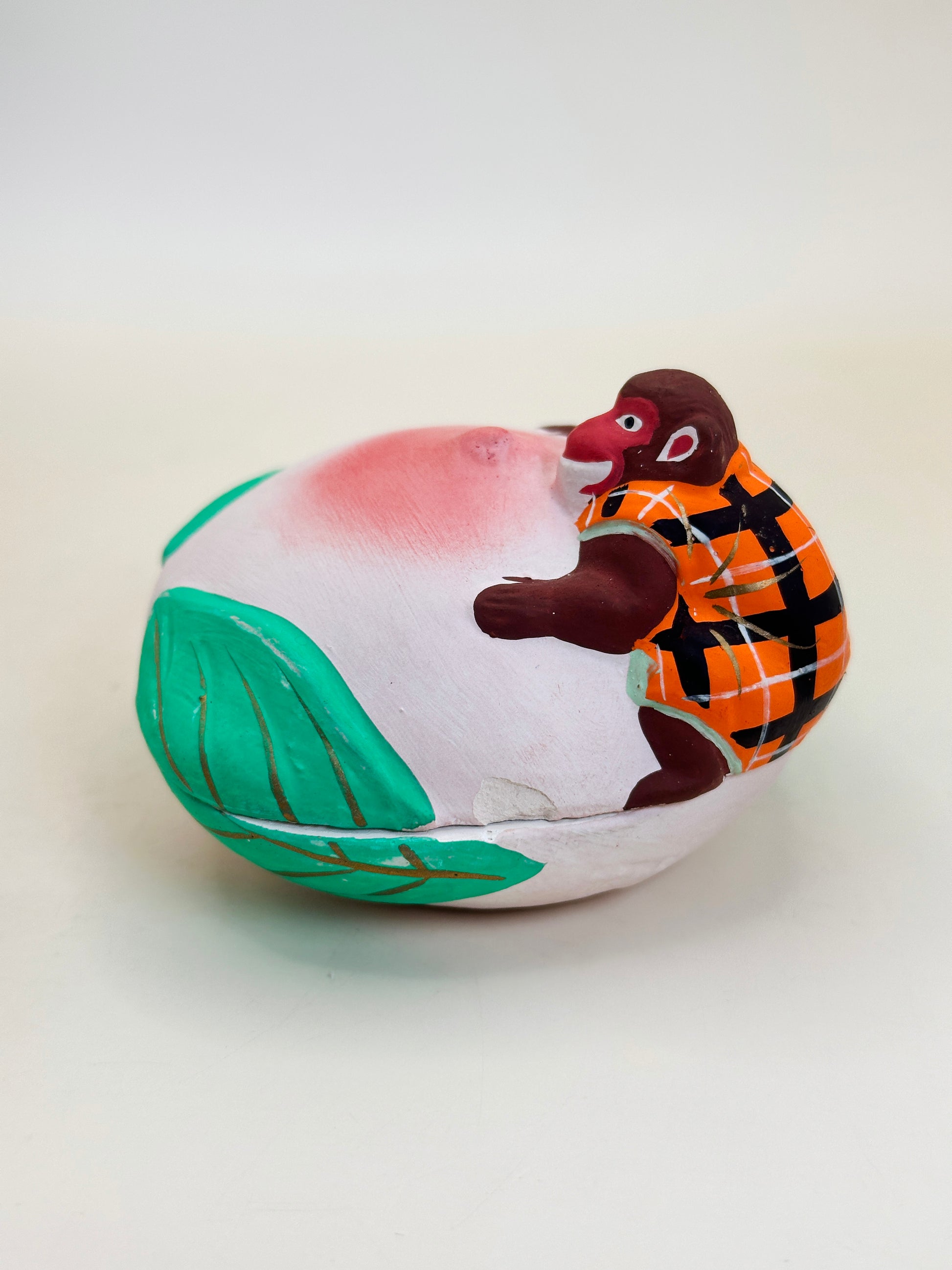 Le kōgō représente un adorable petit singe (saru) serrant contre lui une pêche géante (momo) – une référence au folklore local, évoquant des contes de protection, de fertilité et de longévité. Le singe est vêtu d'un gilet orange et noir aux motifs audacieux, tandis que la pêche est rehaussée de douces nuances de rose et de feuilles d'un vert éclatant. Le léger craquelé de sa surface ajoute à son charme vintage, témoignant de sa fabrication artisanale.