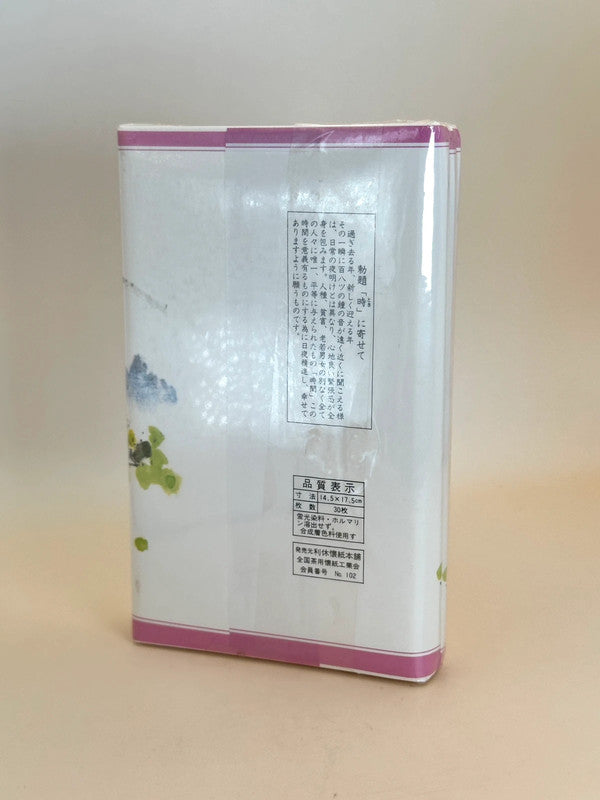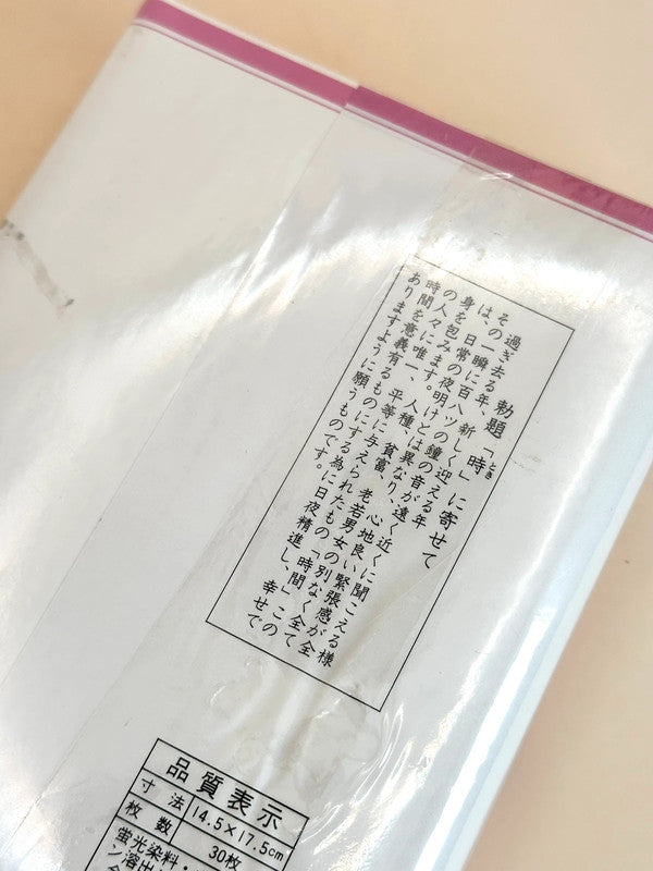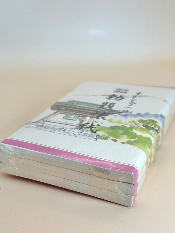 This pack of paper is inspired by the tranquil imagery and sounds of a temple bell ("鐘の音") at dusk, marking the passage of time and inviting quiet reflection. The poetic text on the back emphasizes the idea of pausing in the moment, listening to the bell's chime as a way to reflect on the day and embrace a sense of spiritual clarity and peace.