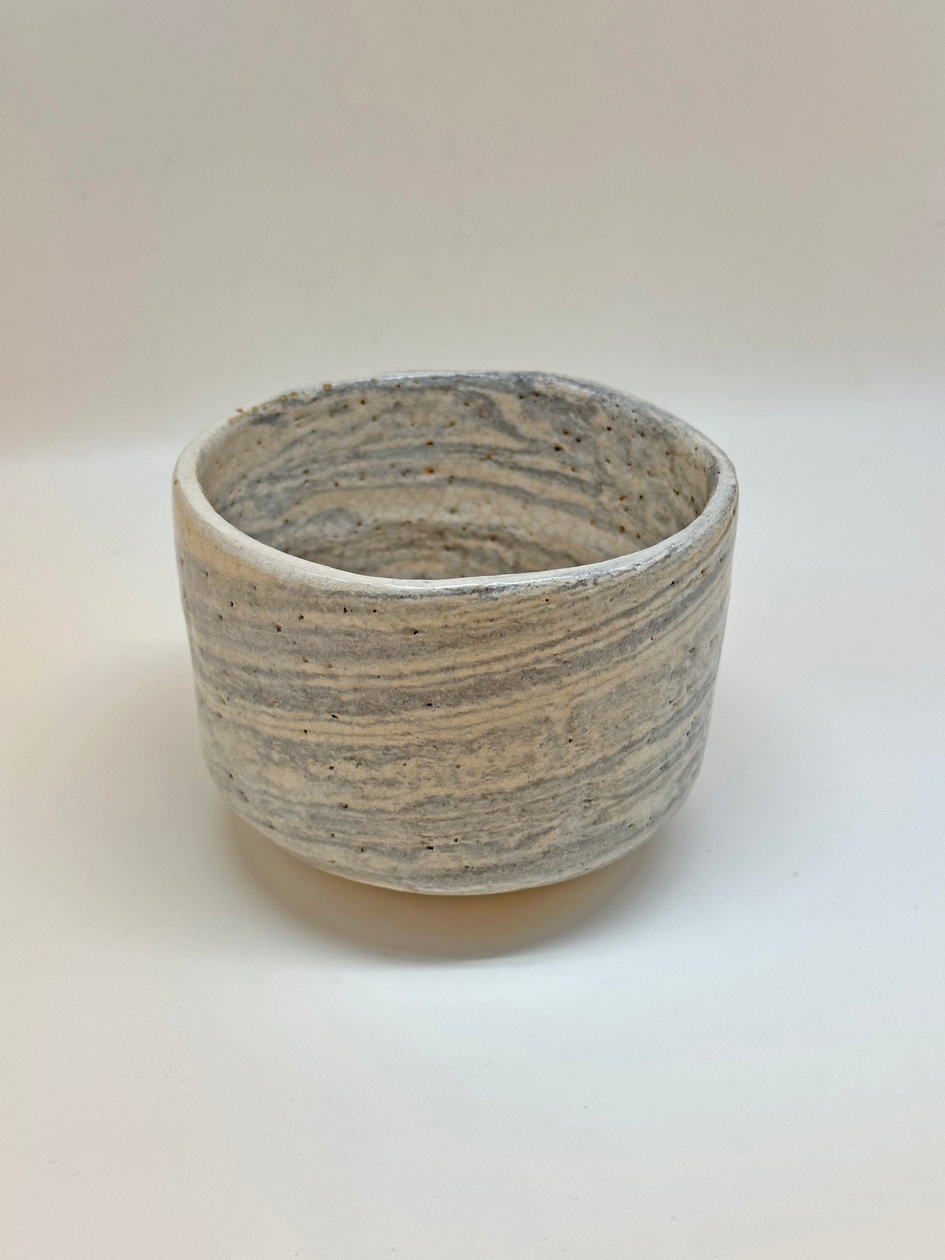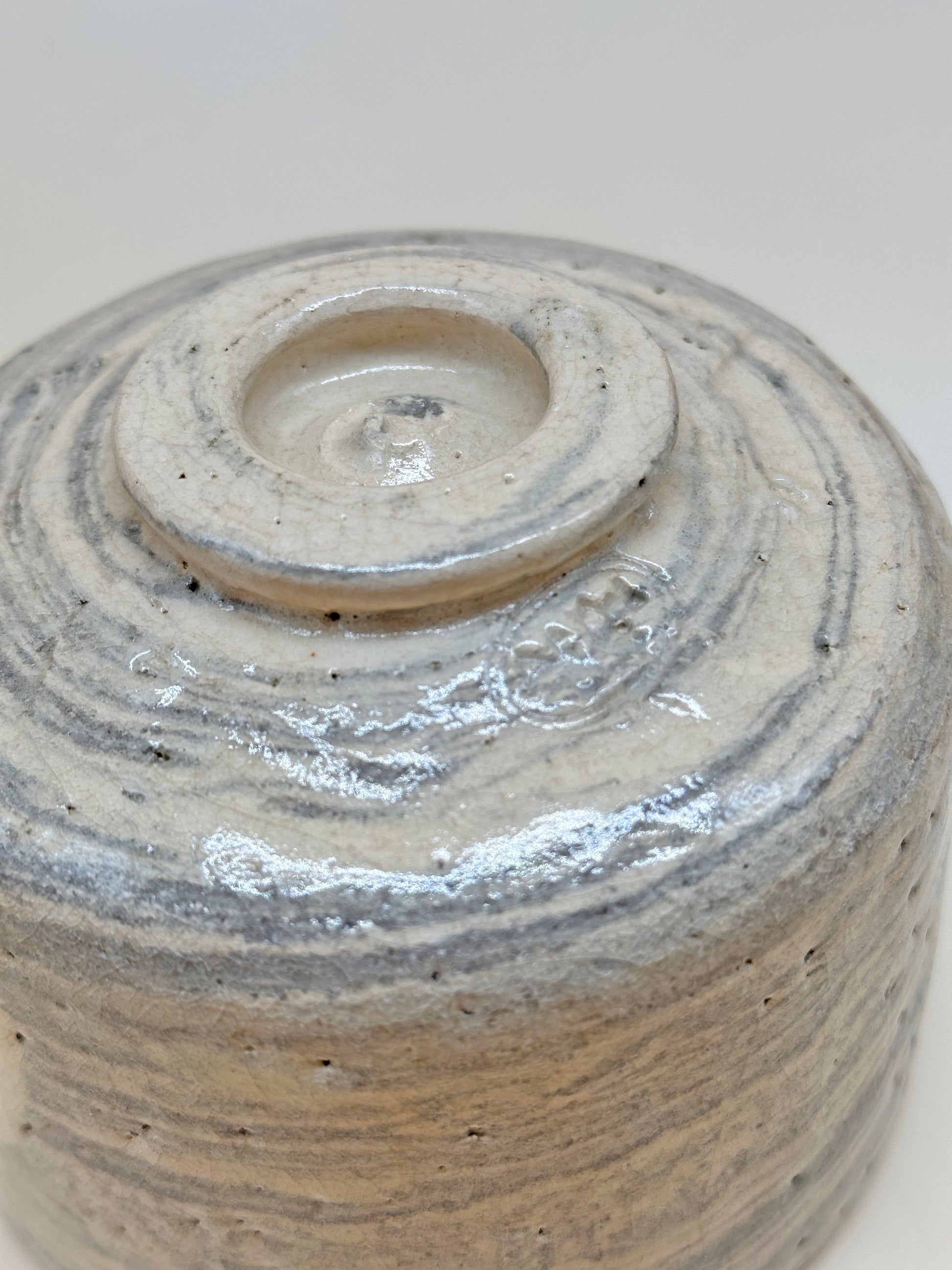 This rustic Hagi-yaki (萩焼) matcha bowl embodies the warmth and simplicity cherished in the Japanese tea ceremony. Its surface displays soft greyish-white tones with subtle natural striations, a characteristic effect of Hagi clay and glazing. The faint crackle (kan-nyū 貫入) adds depth and texture, enhancing its wabi-sabi aesthetic—the beauty of imperfection and transience.