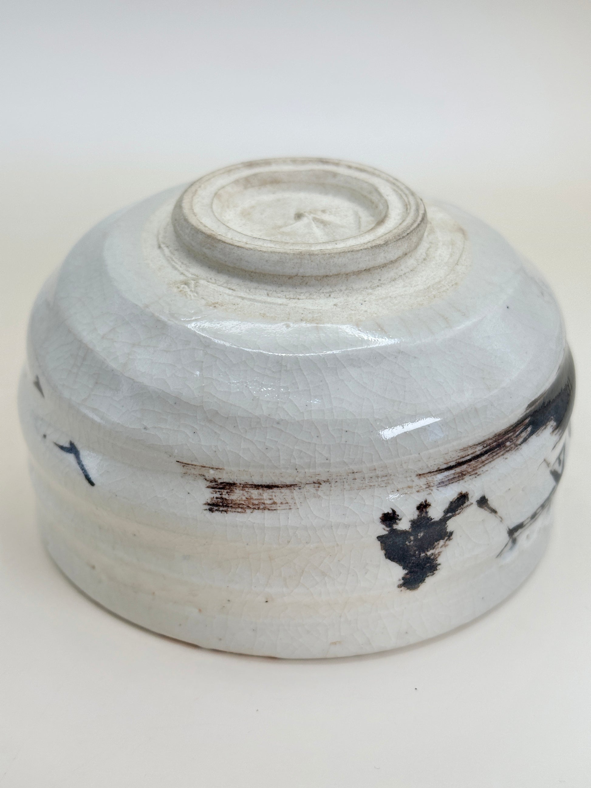 The form is low and stable, with gently rounded walls that sit comfortably during tea preparation. A fine network of crackle (kannyū) spreads across the glaze, adding depth and warmth to the surface while subtly catching the light. This crackle, together with the visible brush marks, reflects the hand-crafted character that defines Akatsu ware—one of Japan’s oldest ceramic traditions.