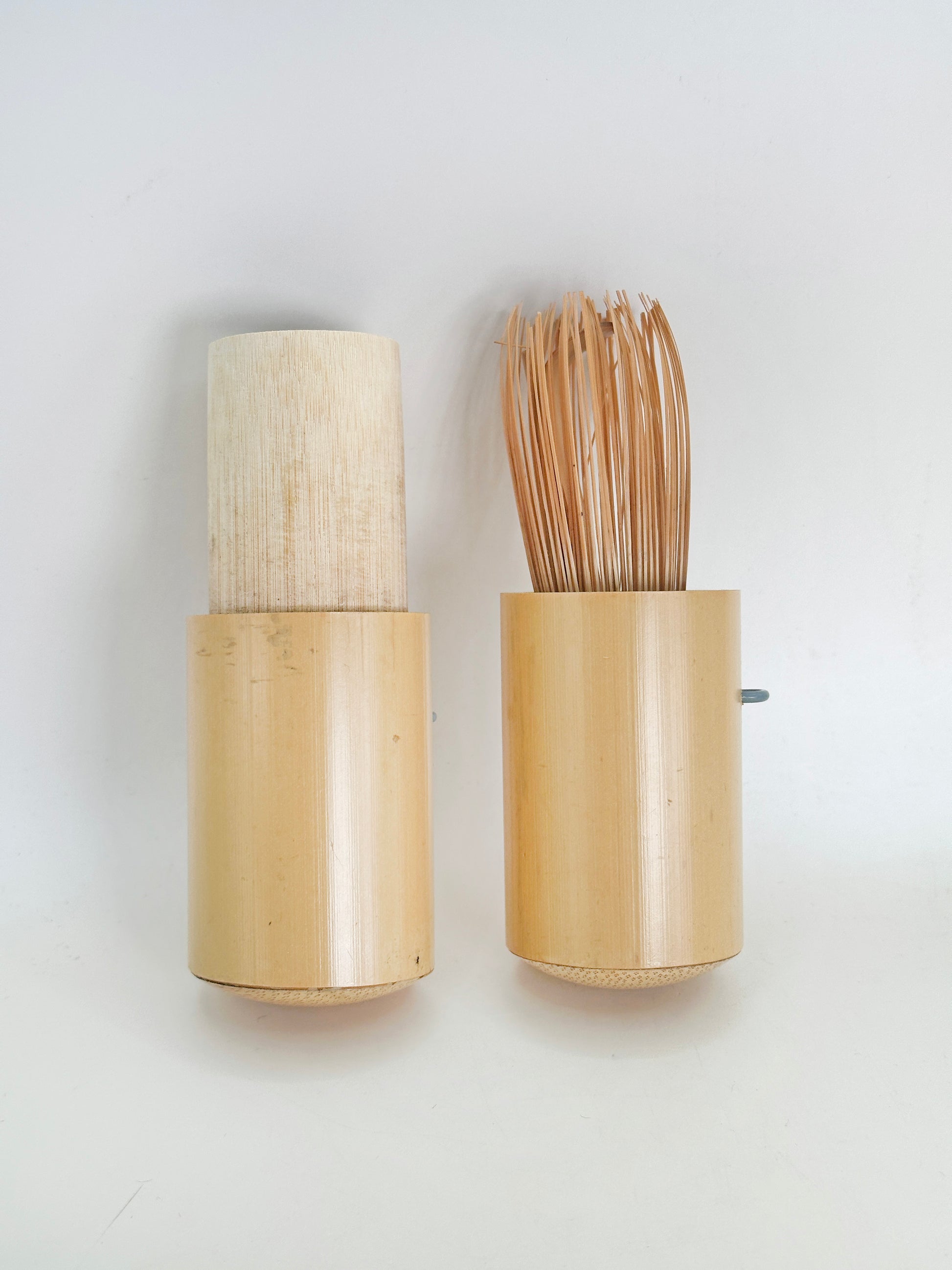 The set includes a handcrafted bamboo chasen (tea whisk), a bamboo chashaku 16cm long (tea scoop), and a protective bamboo case. Like all traditional chasen, the whisk is carved from a single piece of bamboo, with delicate tines meticulously shaped by hand. Despite its compact size, it produces a smooth and satisfying froth, making it perfectly suited for authentic matcha preparation.