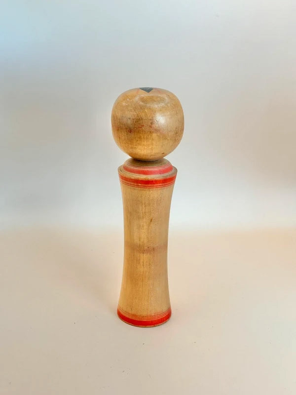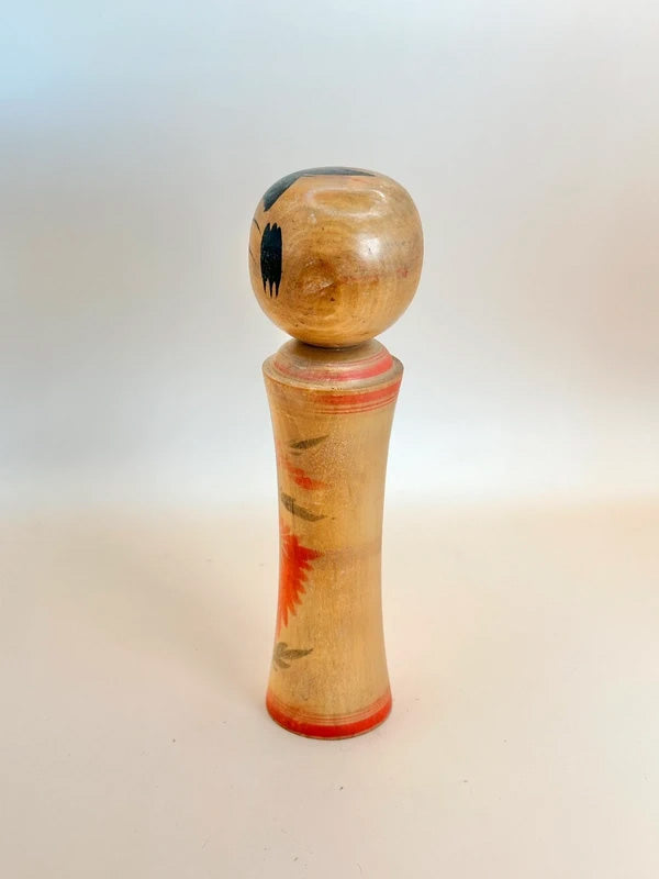 Une kokeshi de style Naruko de Yaichi Kumagai incarne la chaleur et le charme de l'art populaire traditionnel japonais. Dotée d'une tête large et arrondie, d'un doux sourire et d'une épaisse chevelure noire peinte dans le style signature de Kumagai, cette poupée dégage une présence intemporelle. Son corps fuselé est orné d'un magnifique motif de chrysanthème rouge peint à la main et d'un feuillage vert tendre, évoquant la beauté naturelle par sa symétrie et son équilibre discrets. Le motif floral vif et la courbure subtile de la forme en font un exemple classique et apaisant du savoir-faire Naruko.