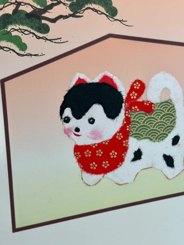 Carte vintage japonaise shikishi de 2006, avec son emballage d'origine. Elle présente un collage chigiri-e (ちぎり絵) à la texture magnifique, une forme d'art qui utilise du papier déchiré et teint à la main pour créer des images délicates et tactiles. Le sujet central est un adorable Inu Hariko (犬張子), un chien traditionnel japonais en papier mâché, reproduit ici sur du papier washi multicouche aux détails fins et sur un fond dégradé aux tons pastel.