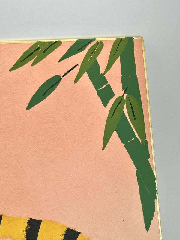 Chaque élément de l'œuvre, de la fourrure du tigre aux feuilles et aux fleurs, est réalisé à partir de papier washi déchiré à la main, conférant à l'image un aspect texturé unique. Les bords déchirés apportent douceur et charme organique, signature de ce médium. Les feuilles de bambou suspendues au-dessus du tigre symbolisent la résilience, la paix et la pureté. Le bambou est un motif traditionnel souvent associé aux tigres dans l'art japonais, symbolisant l'équilibre entre puissance et grâce.