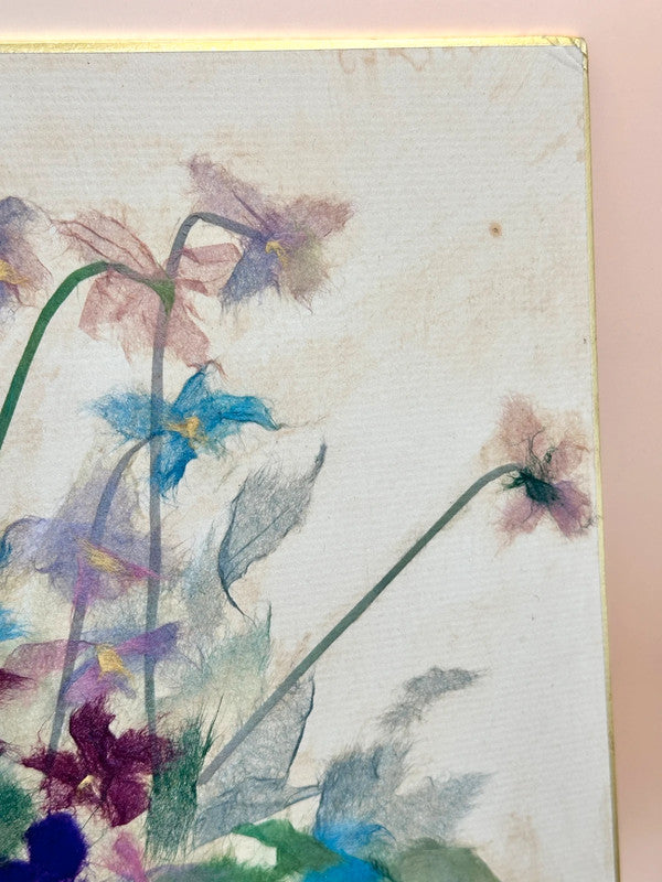 Carte japonaise vintage chigiri-e shikishi de 1990, présentant une composition florale délicate et richement texturée, réalisée selon les techniques traditionnelles du collage de papier fait main. La composition présente un élégant bouquet de fleurs ressemblant à des clématites, aux nuances vives d'indigo, de violet et de bleu ciel doux, entrecoupées de touches de bordeaux et de verts délicats. Chaque pétale et chaque feuille sont soigneusement réalisés avec du papier washi déchiré et superposé, conférant à l'œuvre un aspect doux et pictural et une subtile dimensionnalité.