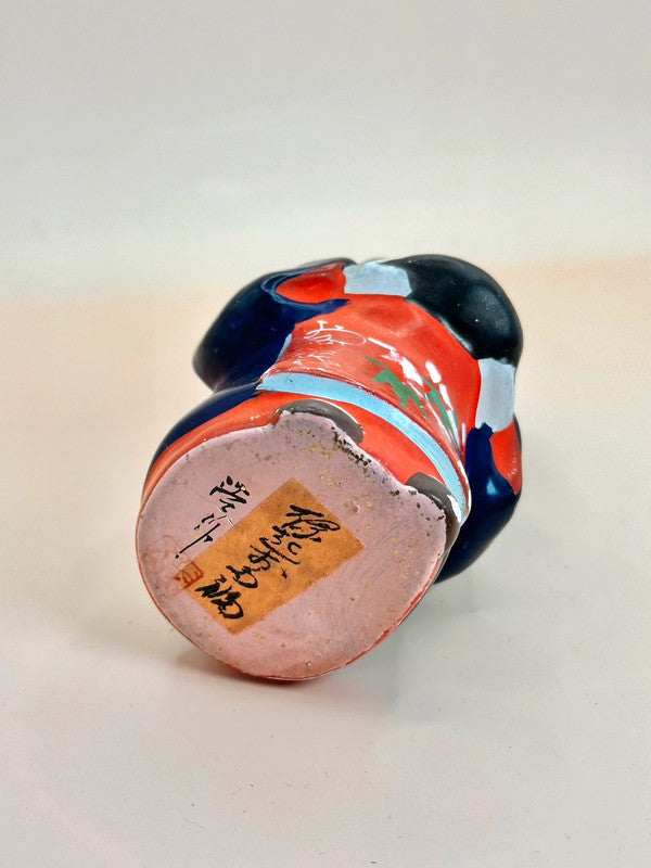 Cette pièce illustre le savoir-faire classique de l'ère Showa, avec un travail au pinceau audacieux et des détails fantaisistes qui lui confèrent chaleur et caractère. Les détails du kimono incluent des motifs de feuilles de bambou, ajoutant une touche saisonnière et festive. La base est signée et estampillée, indiquant qu'elle a été réalisée par un atelier de poterie populaire régional.