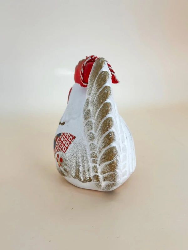 A vintage dorei clay bell crafted by Yakushigama (薬師窯), a renowned ceramic company with a history spanning over 1,000 years, celebrated for its traditional Japanese figurines and folk art. The chicken is depicted in a soft white hue with a red comb and gold motif. A red braided cord is attached, allowing it to be hung or displayed with ease.