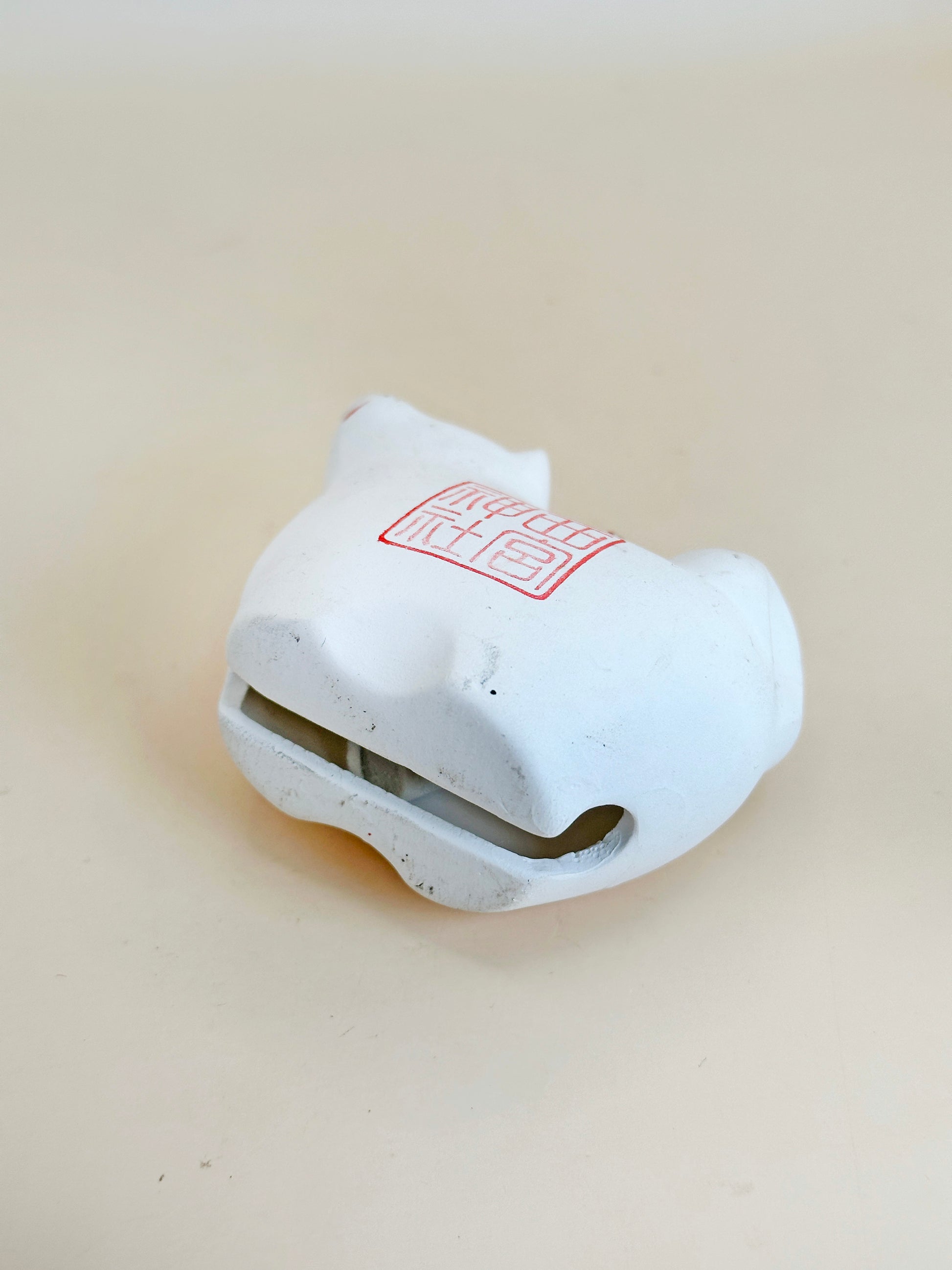 This Dorei clay bell in the shape of a dog comes from Nishinomiya Shrine (西宮神社) in Hyōgo Prefecture, a shrine celebrated as the head shrine of over 3,500 Ebisu shrines across Japan. Carefully handcrafted from clay and painted in soft white with red and black accents, this dog figure bears a stylized seal reading “西宮神社” (Nishinomiya Shrine) on its side — a mark of its origin and spiritual connection.