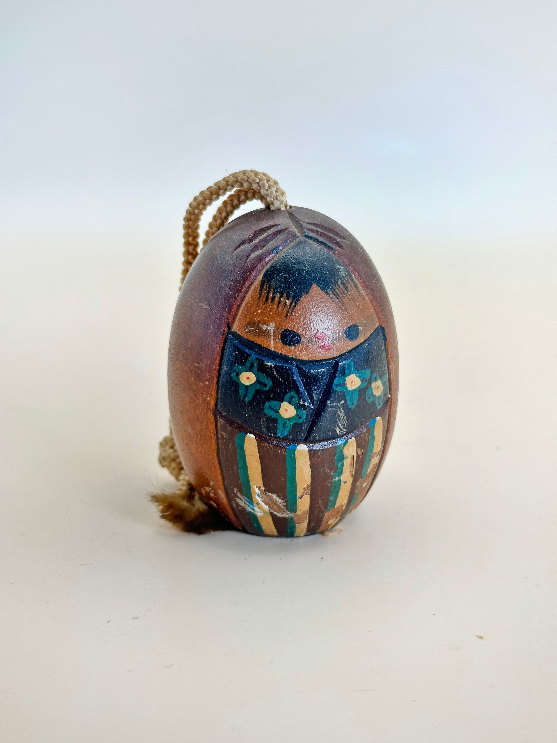 This is a Warabe Suzu (童鈴) a traditional wooden bell from Shionomisaki (潮岬), the southernmost point of Wakayama Prefecture, Japan. Carved from natural wood and hand-painted with gentle folk-style features, the figure represents a warabe (child), dressed in vibrant blue robes adorned with floral patterns and yellow accents. The simple round form and soft facial expression capture the innocence and warmth often seen in Japanese folk crafts.
