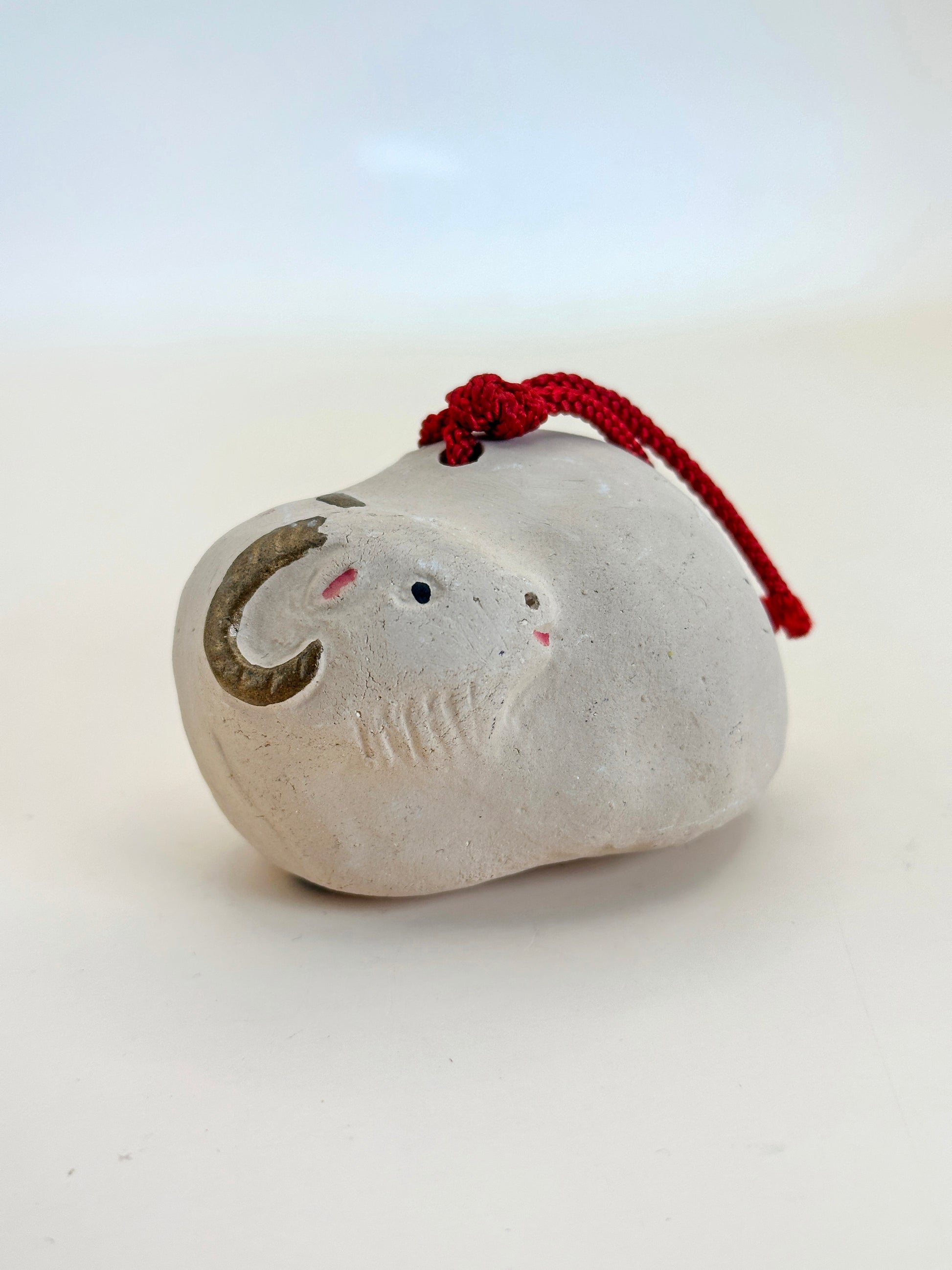 Shaped with gentle asymmetry and finished in a matte, unglazed texture, the bell’s surface bears natural speckles and slight irregularities that speak to its hand-molded origin. The facial features are sparingly painted: just a few delicate strokes to suggest the sheep’s calm expression, with soft blush marks on the cheeks and subtly curled horns in earthy tones. The overall design is endearing yet restrained, allowing the viewer to feel the quiet charm of the piece without excess embellishment.